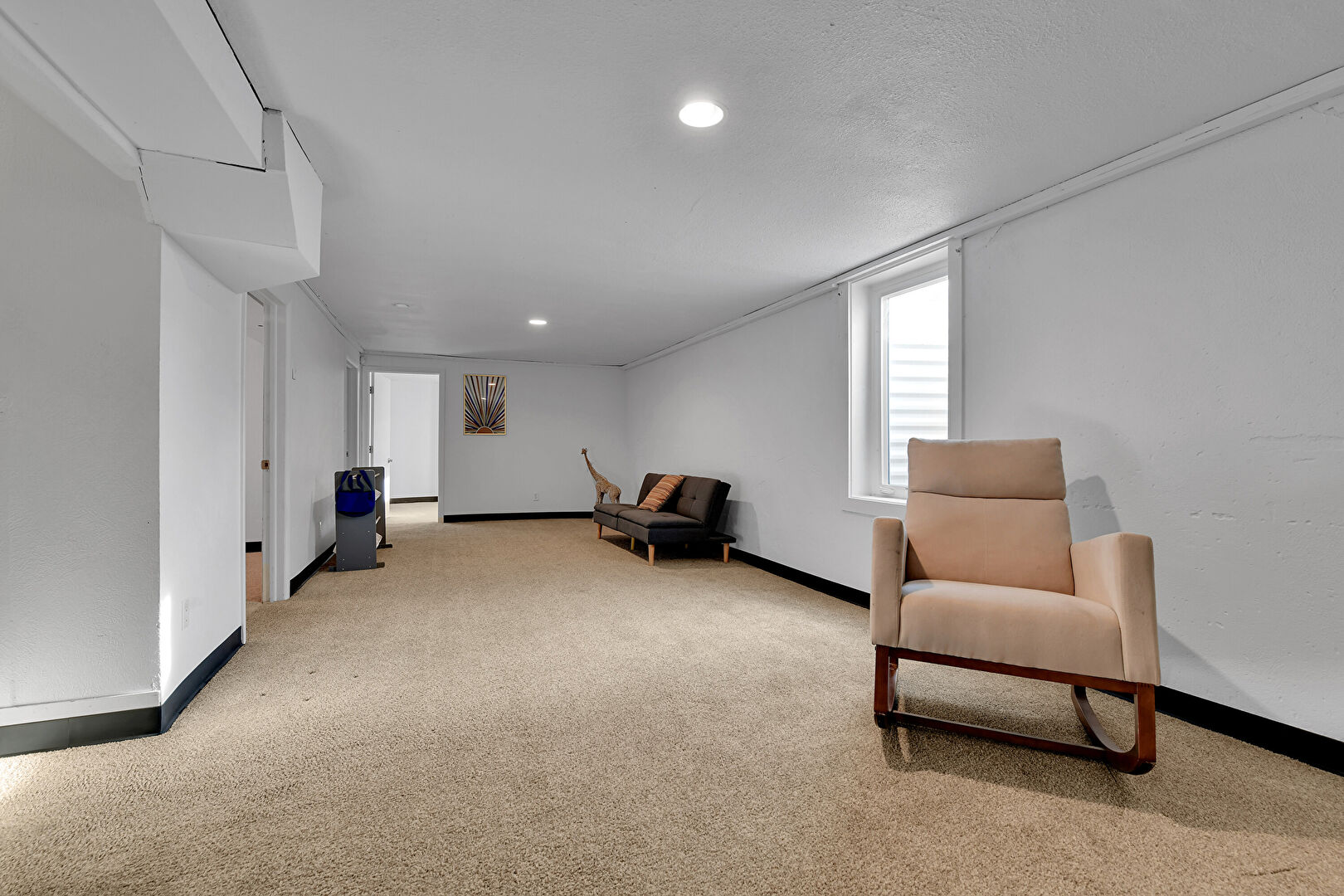 Baseboards Wall, Basement, Carpet, Drywall, Recessed Lighting, Natural Light