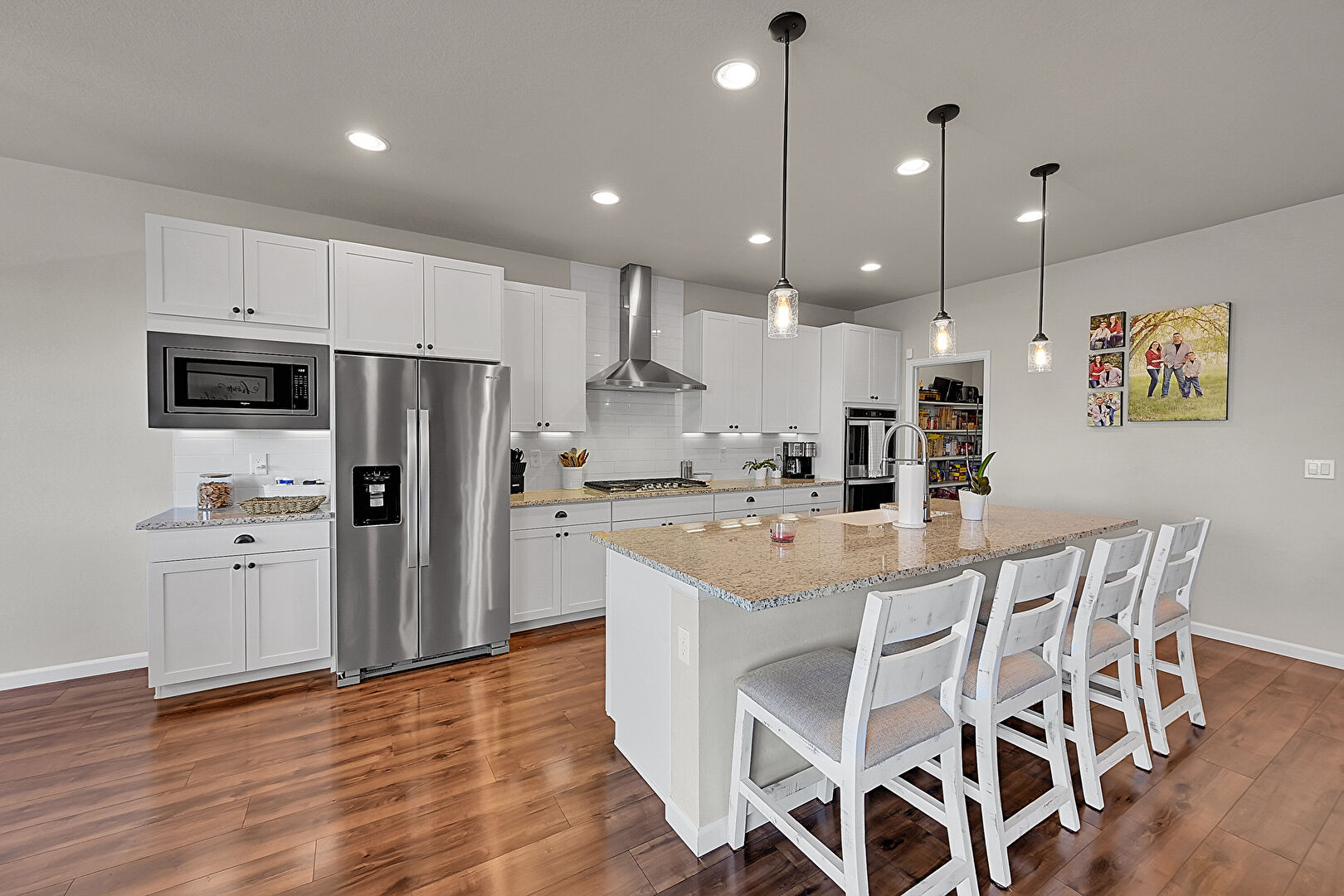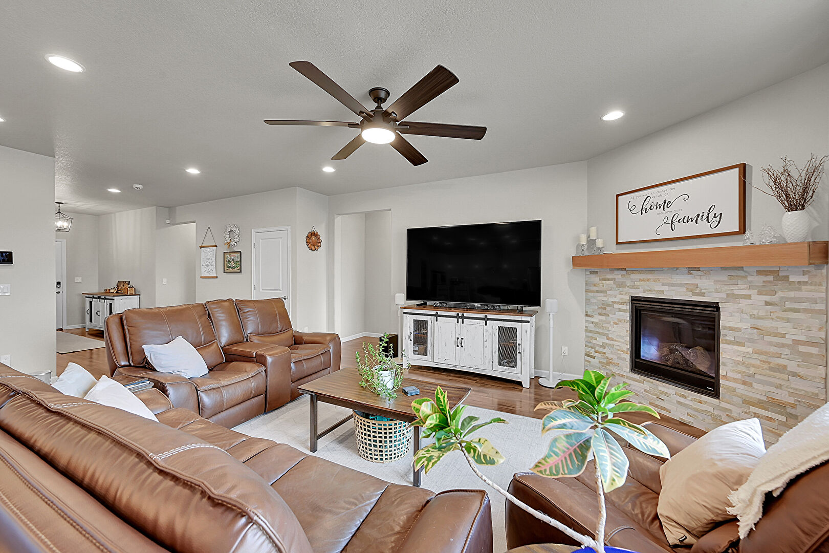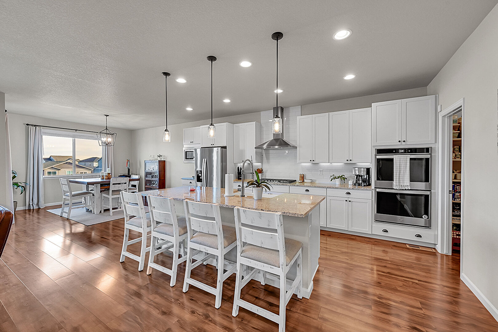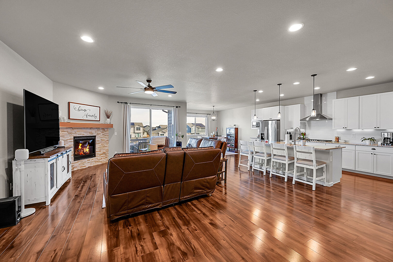 Baseboards Wall, Ceiling Fan, Double Oven, Drywall, Fireplace, Kitchen Bar, Kitchen Island, Natural Light, Notable Chandelier, One Wall Kitchen, Opens To Living Area, Pendant Lighting, Recessed Lighting, Shaker Cabinets, Stone Countertops, Textured Ceiling, Wood Finish Floor, Ceiling Fan, Drywall, Kitchen Bar, One Wall Kitchen, Opens To Living Area, Wood Finish Floor
