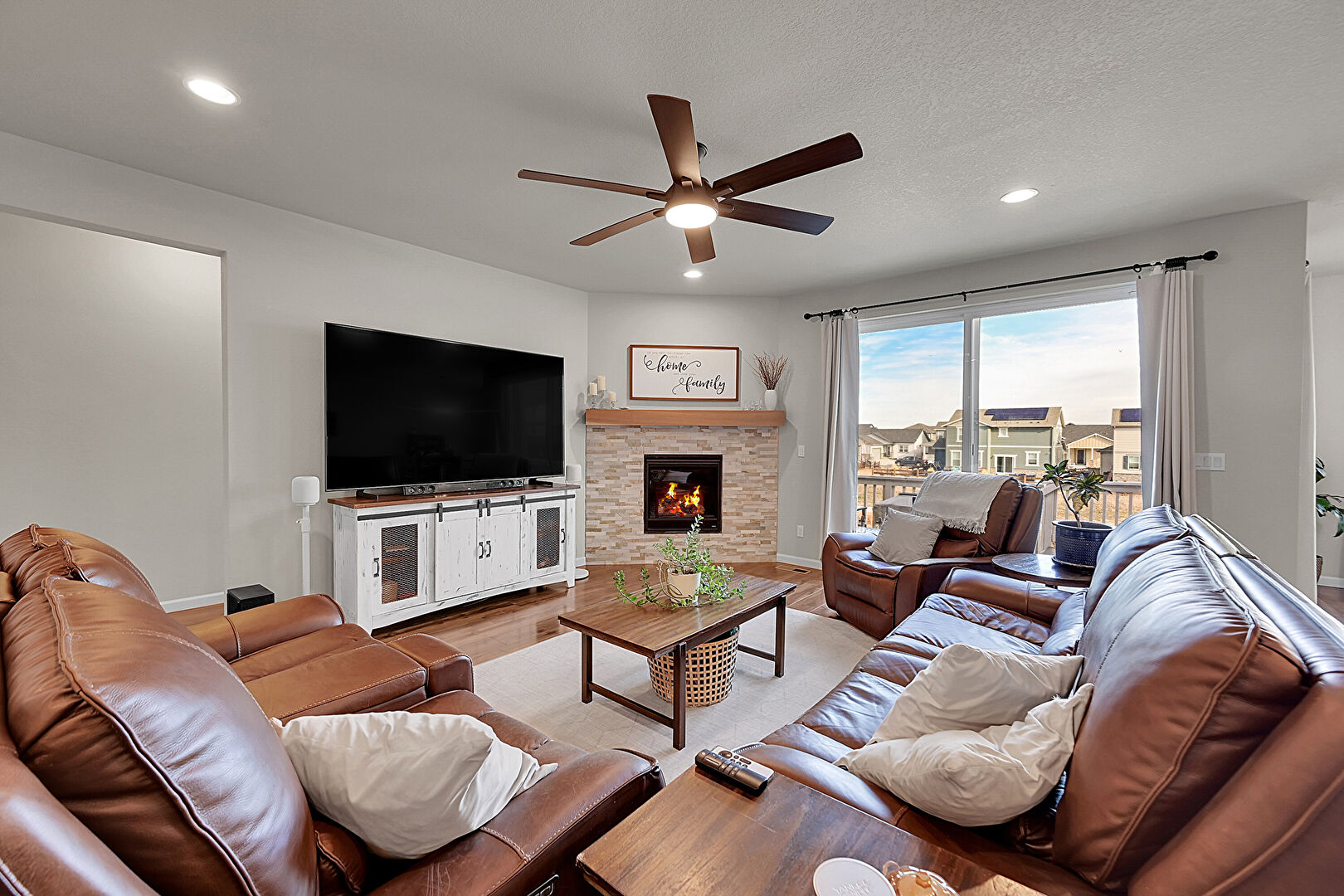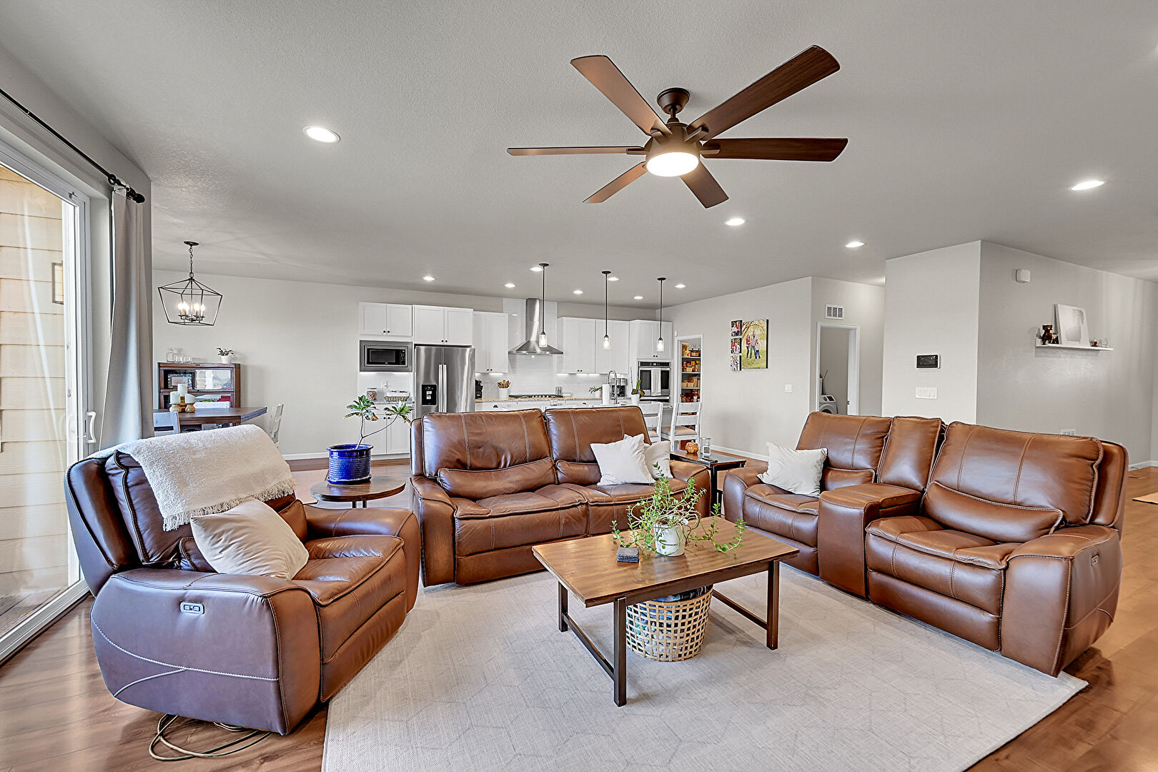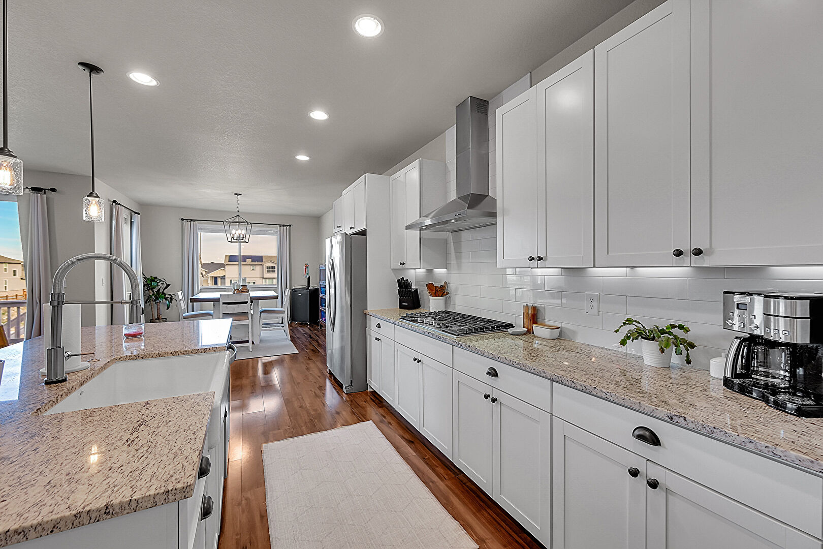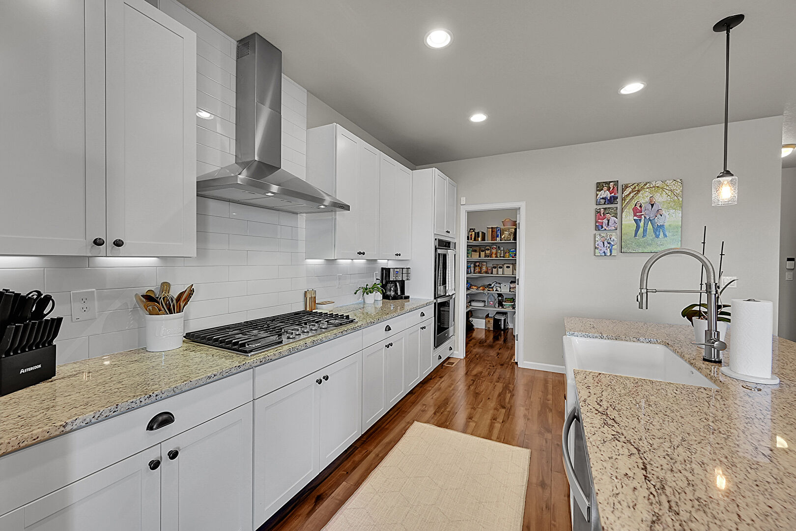 Baseboards Wall, Ceiling Fan, Double Oven, Drywall, Fireplace, Kitchen Bar, Kitchen Island, Natural Light, Notable Chandelier, One Wall Kitchen, Opens To Living Area, Pendant Lighting, Recessed Lighting, Shaker Cabinets, Stone Countertops, Textured Ceiling, Wood Finish Floor, Ceiling Fan, Drywall, Kitchen Bar, One Wall Kitchen, Opens To Living Area, Wood Finish Floor