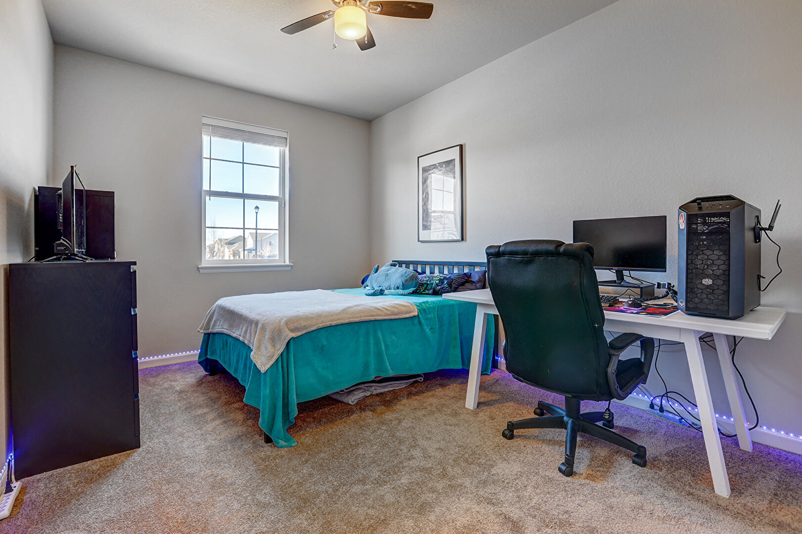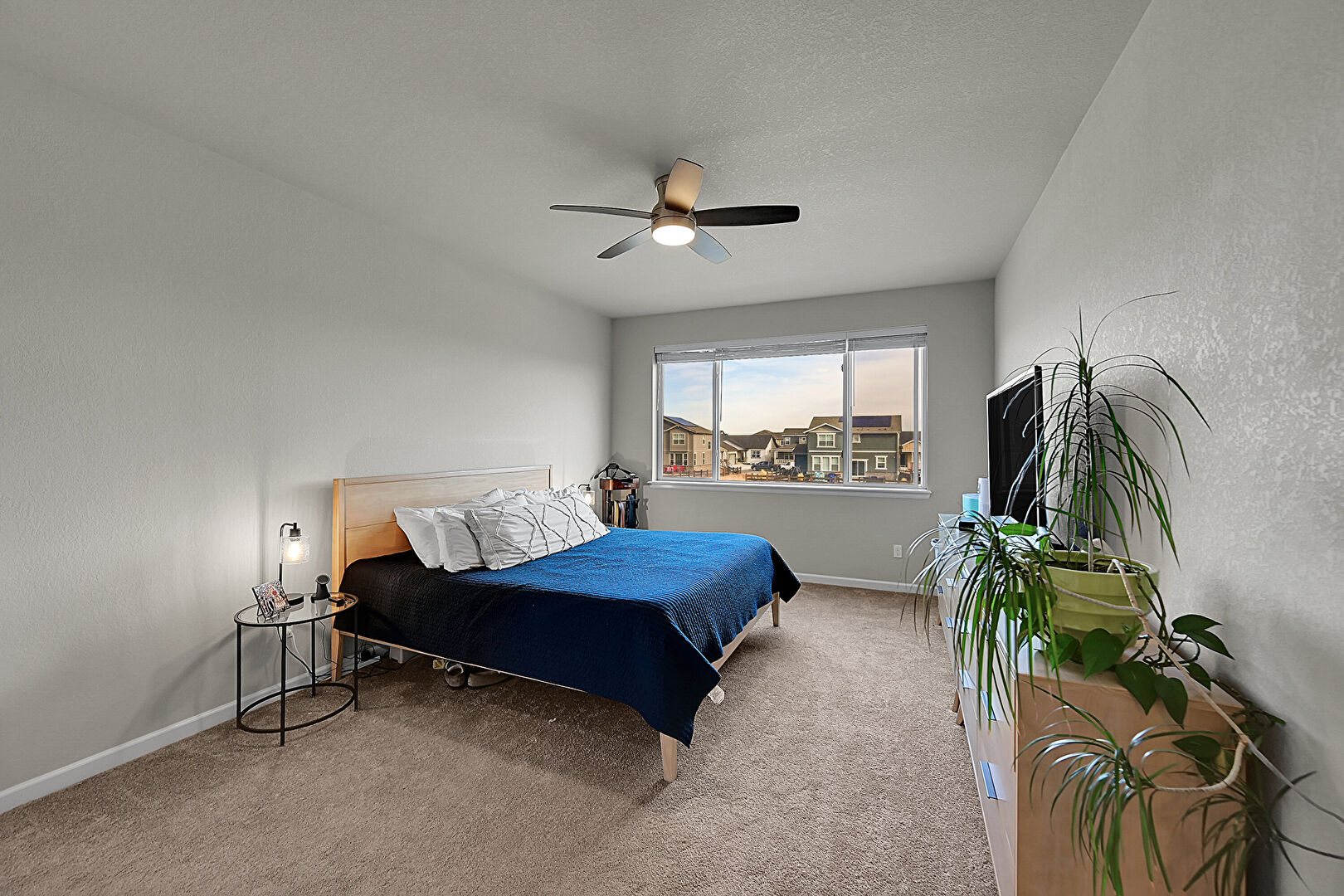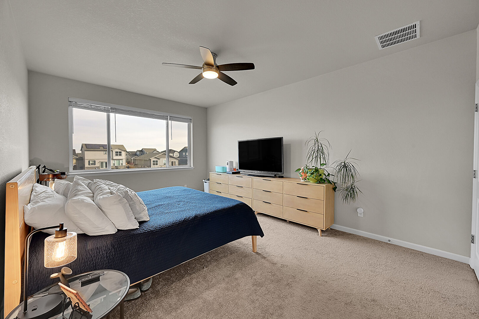 Baseboards Wall, Carpet, Ceiling Fan, Drywall, Ensuite Bathroom, Natural Light, Textured Ceiling, Textured Wall, Ceiling Fan, Vent