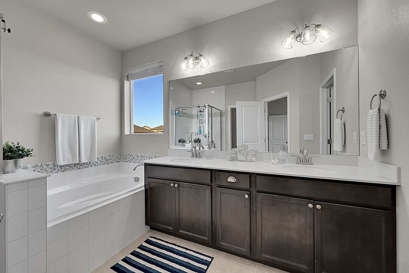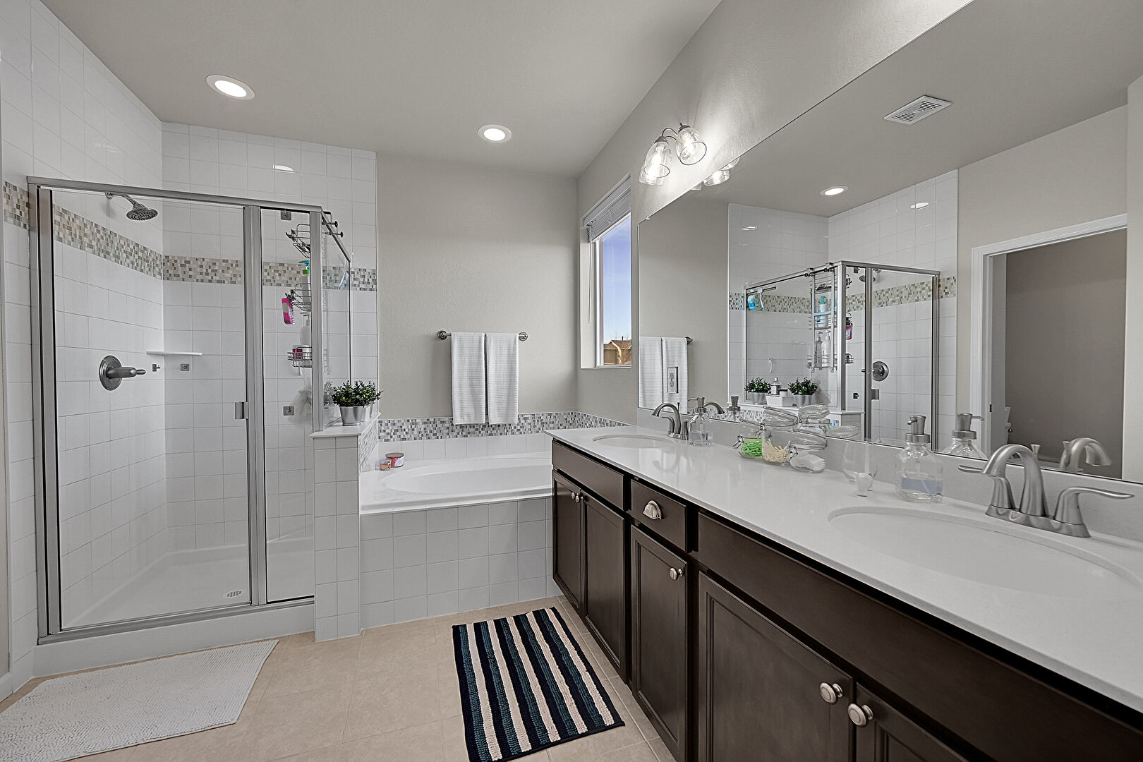 Double Vanity, Full Bathroom, Natural Light, Recessed Lighting, Tile Floor, Vent, Drywall