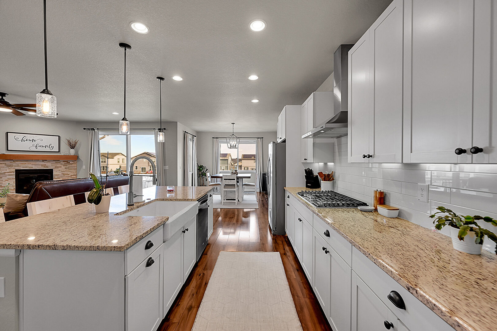 Baseboards Wall, Ceiling Fan, Double Oven, Drywall, Fireplace, L Shaped Kitchen, Natural Light, Notable Chandelier, One Wall Kitchen, Recessed Lighting, Textured Ceiling, Vent, Wood Finish Floor, Ceiling Fan, Drywall, Natural Light, Recessed Lighting, Wood Finish Floor