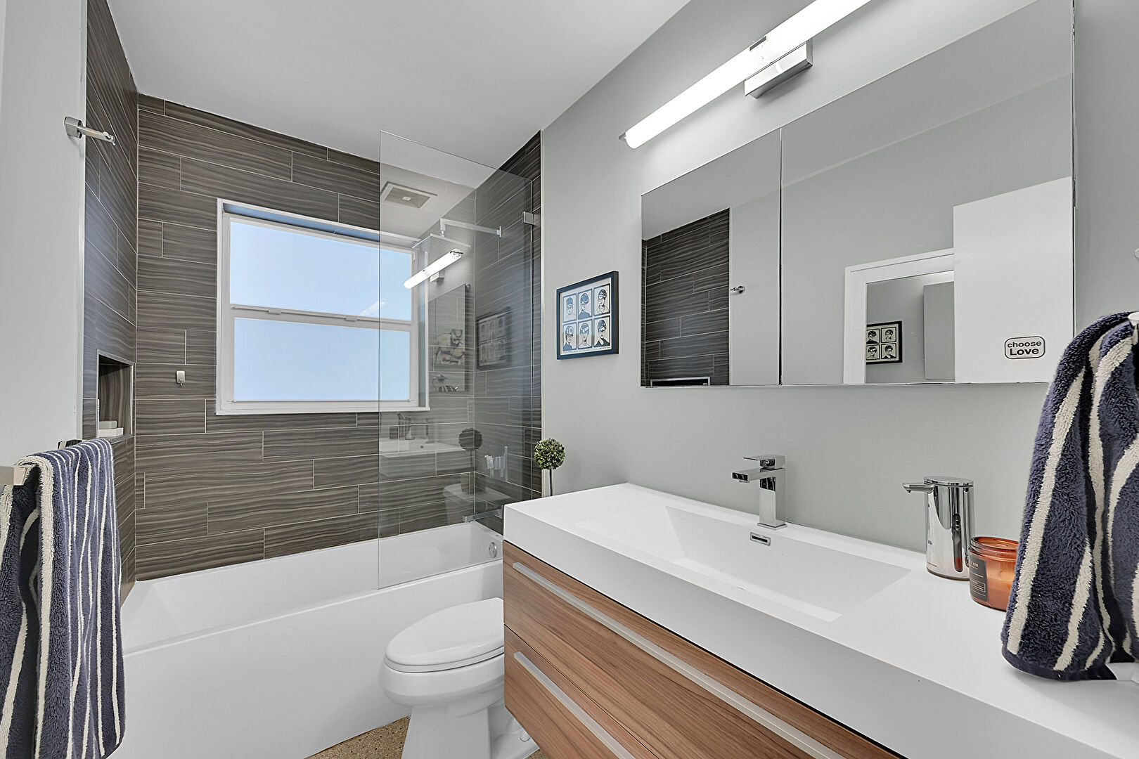 Aggregate Floor, Baseboards Wall, Combined Bath Shower, Drywall, Full Bathroom, Half Bathroom, Natural Light, Vanity, Vent, Vanity, Wall Mounted Ac