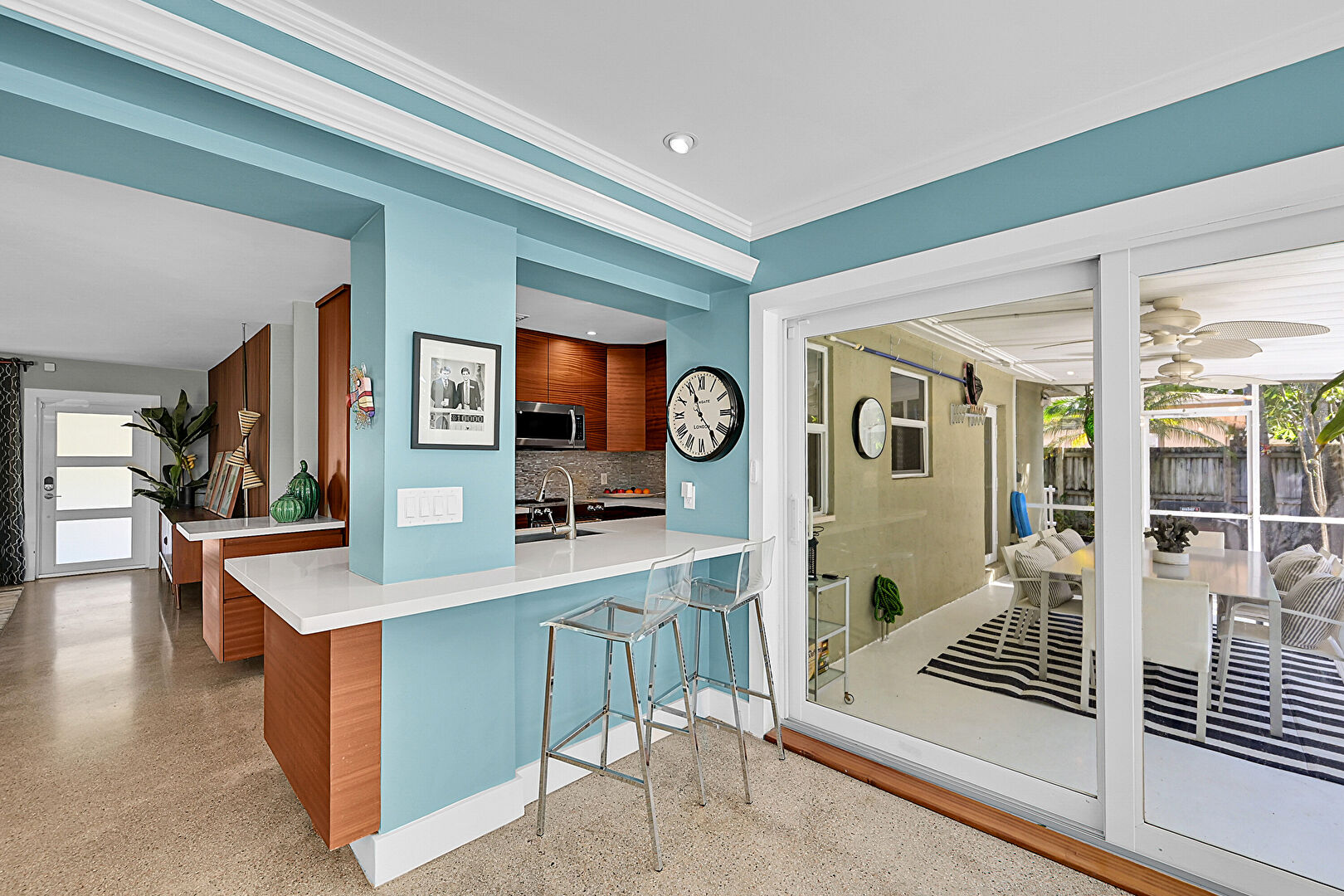 Aggregate Floor, Baseboards Wall, Ceiling Fan, Drywall, Flat Panel Cabinets, Kitchen Bar, Kitchen Peninsula, Medium Brown Cabinets, Natural Light, Pass Through Window, Pendant Lighting, Recessed Lighting, Stone Countertops, Sunroom, U Shaped Kitchen, Vent, Wine Cooler, Aggregate Floor, Crown Molding, Drywall, Flat Panel Cabinets