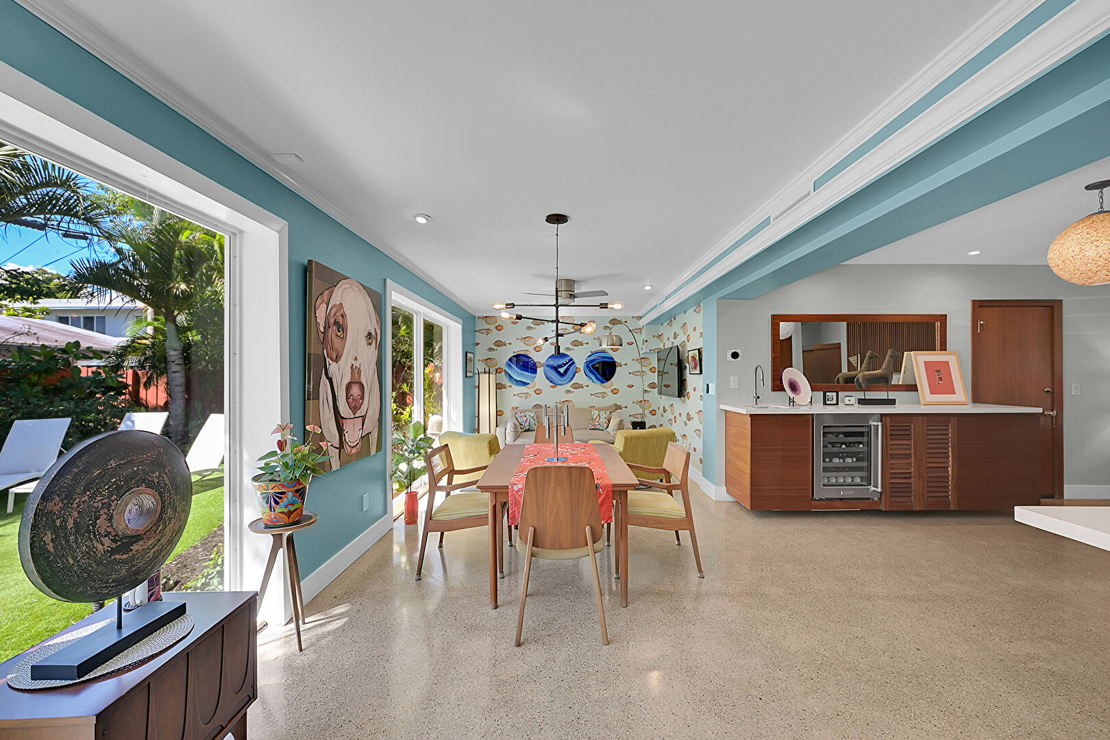 Aggregate Floor, Baseboards Wall, Crown Molding, Drywall, Natural Light, Notable Chandelier, Recessed Lighting, Wallpaper Wall, Wine Cooler, Drywall, Recessed Lighting