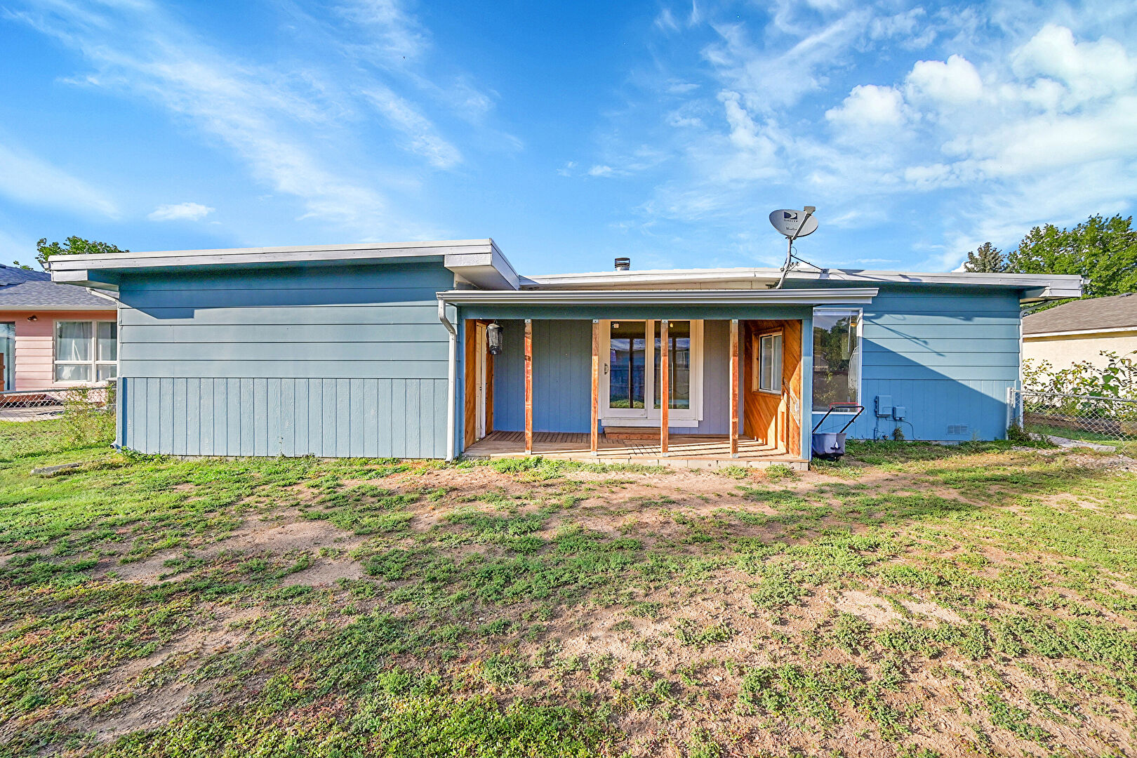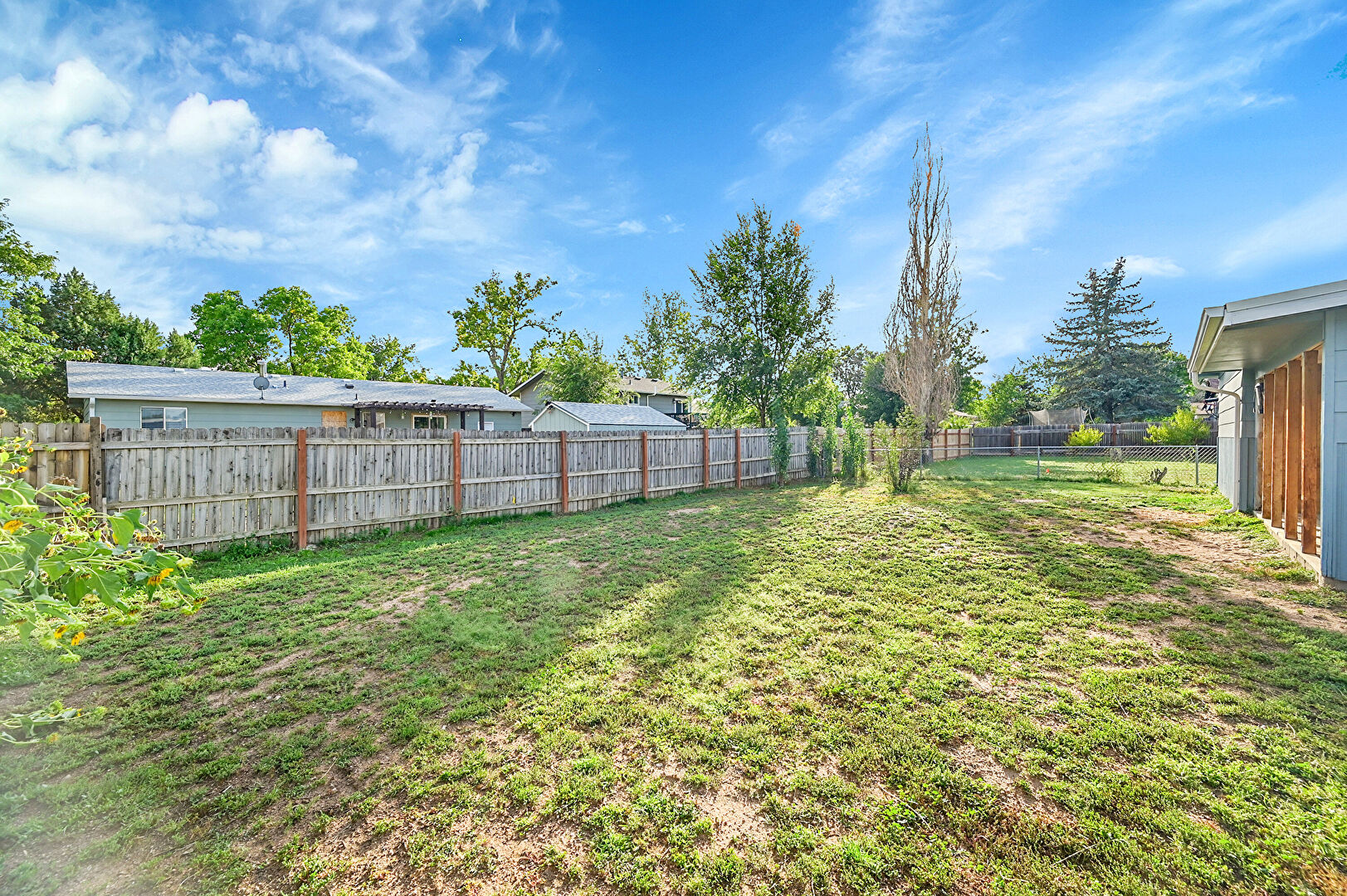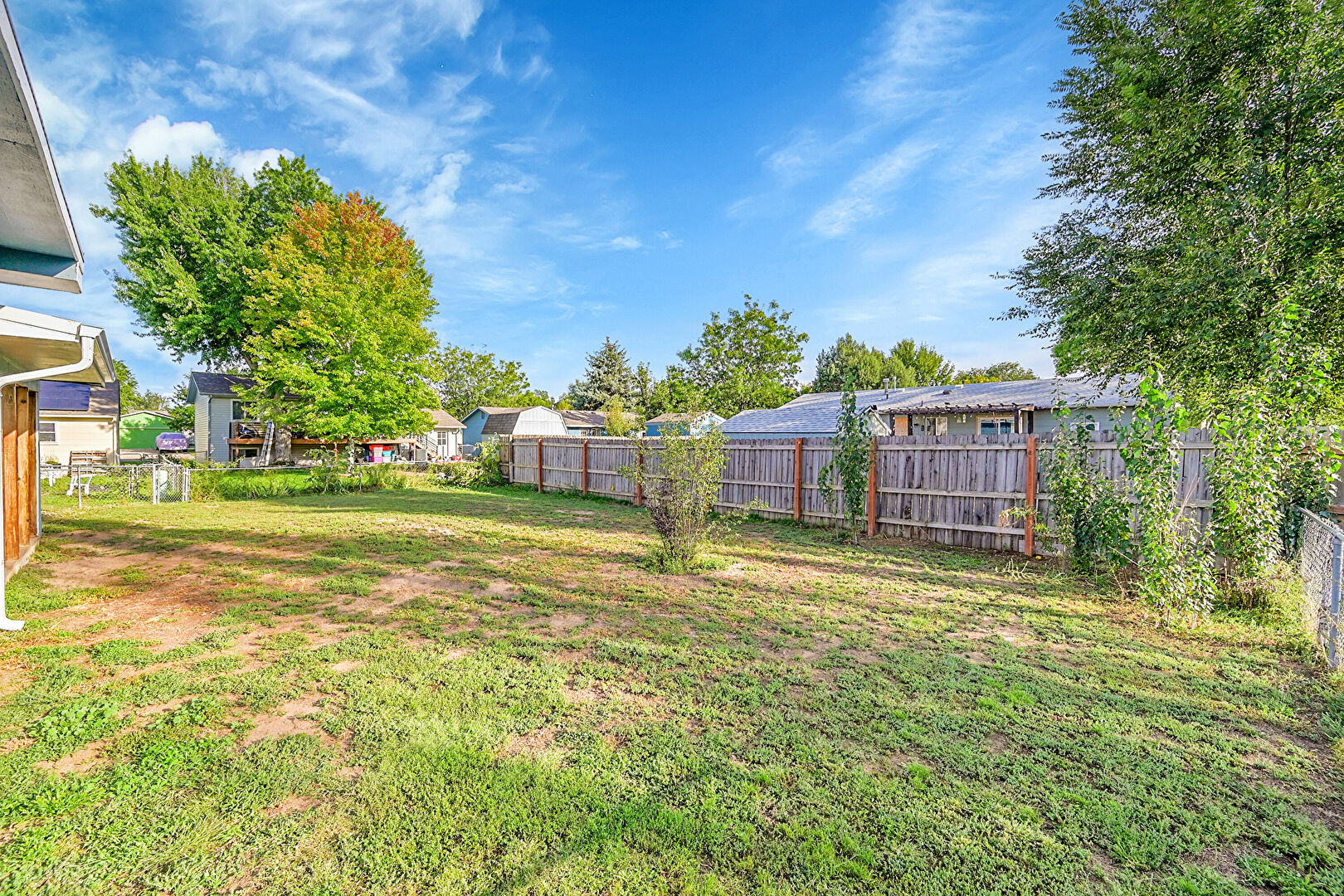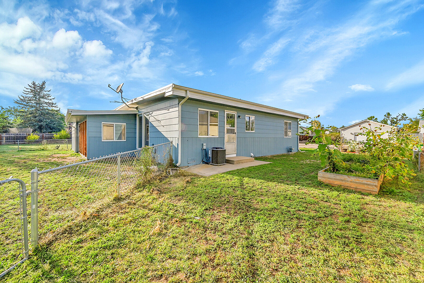 Downspout, Fence, Horizontal Siding, Lawn, Patio, Residential View, Satellite Dish, Fence, Gutters, Lawn