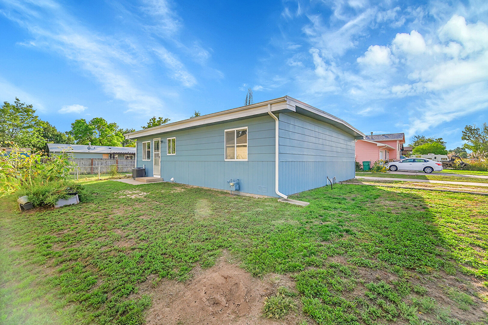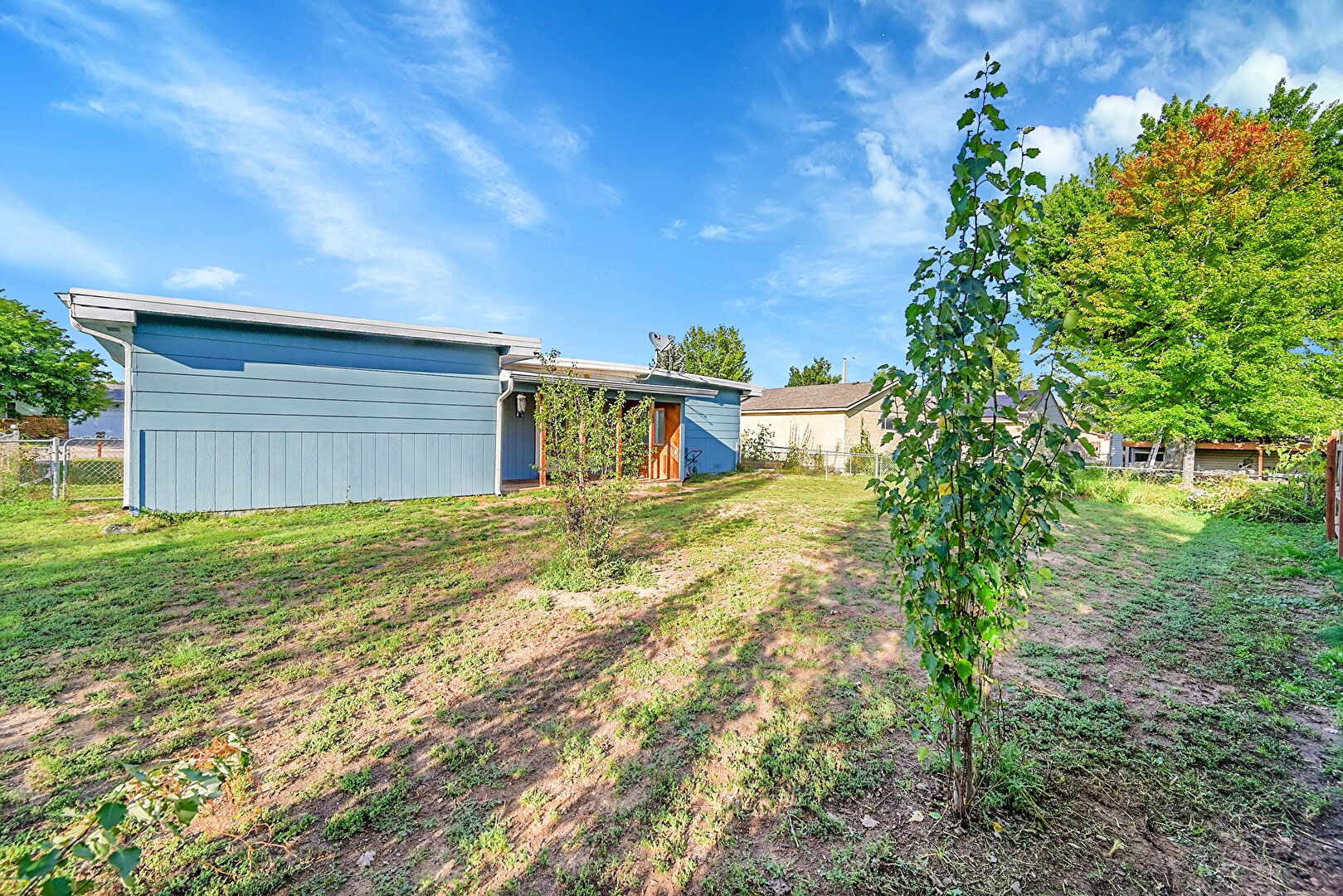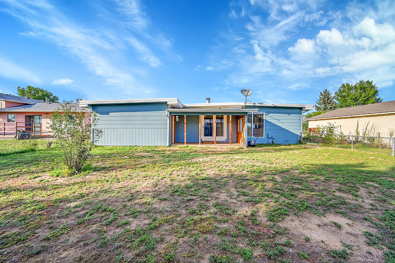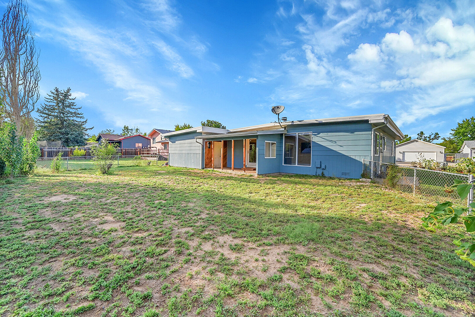 Downspout, Fence, Horizontal Siding, Lawn, Patio, Residential View, Satellite Dish, Fence, Gutters, Lawn