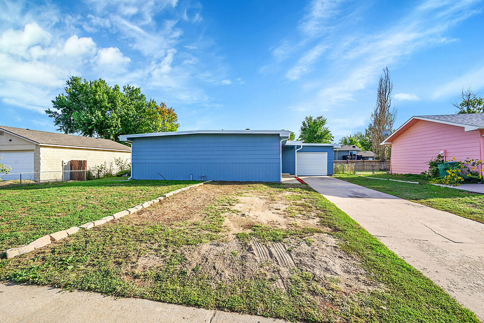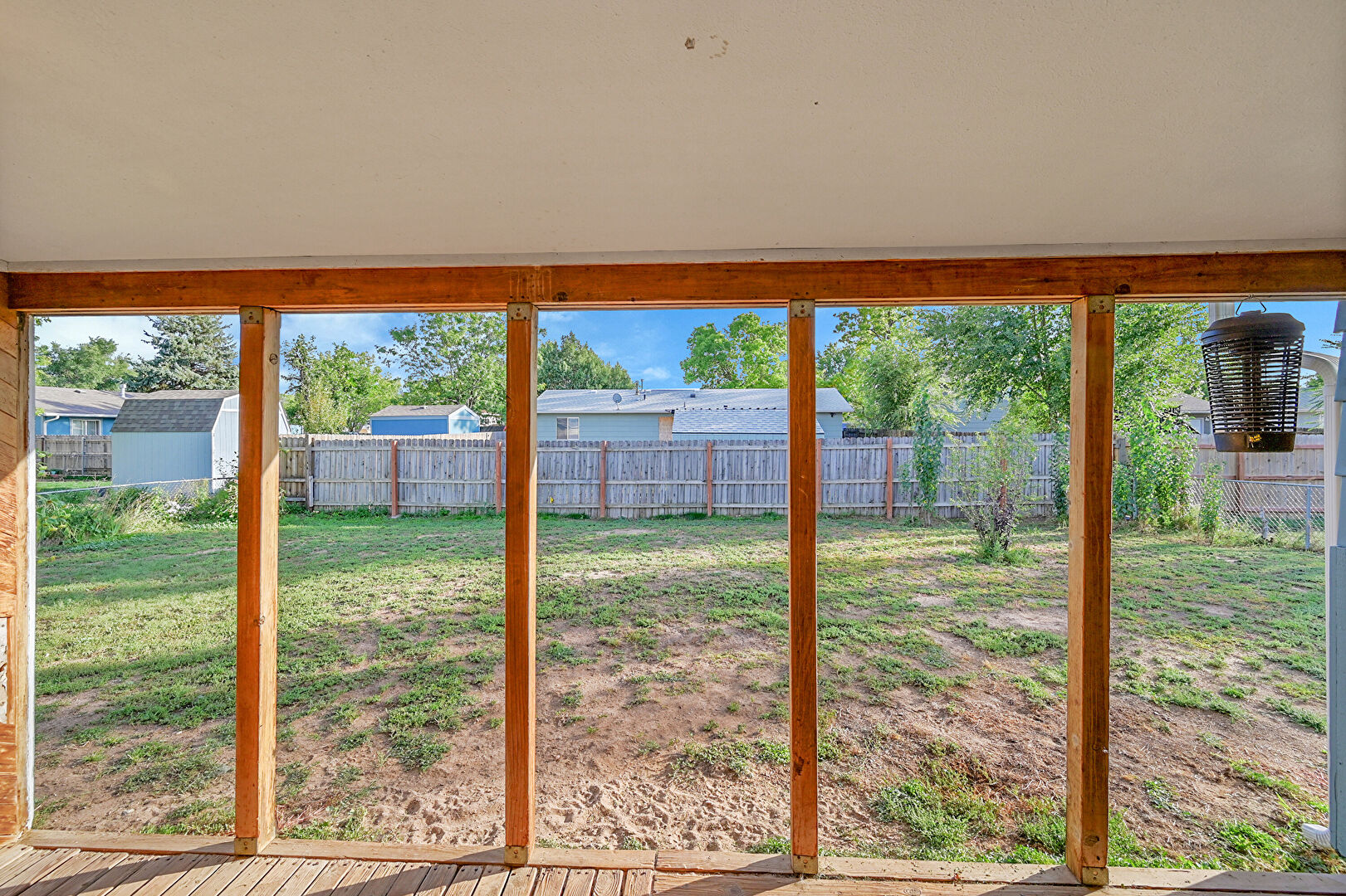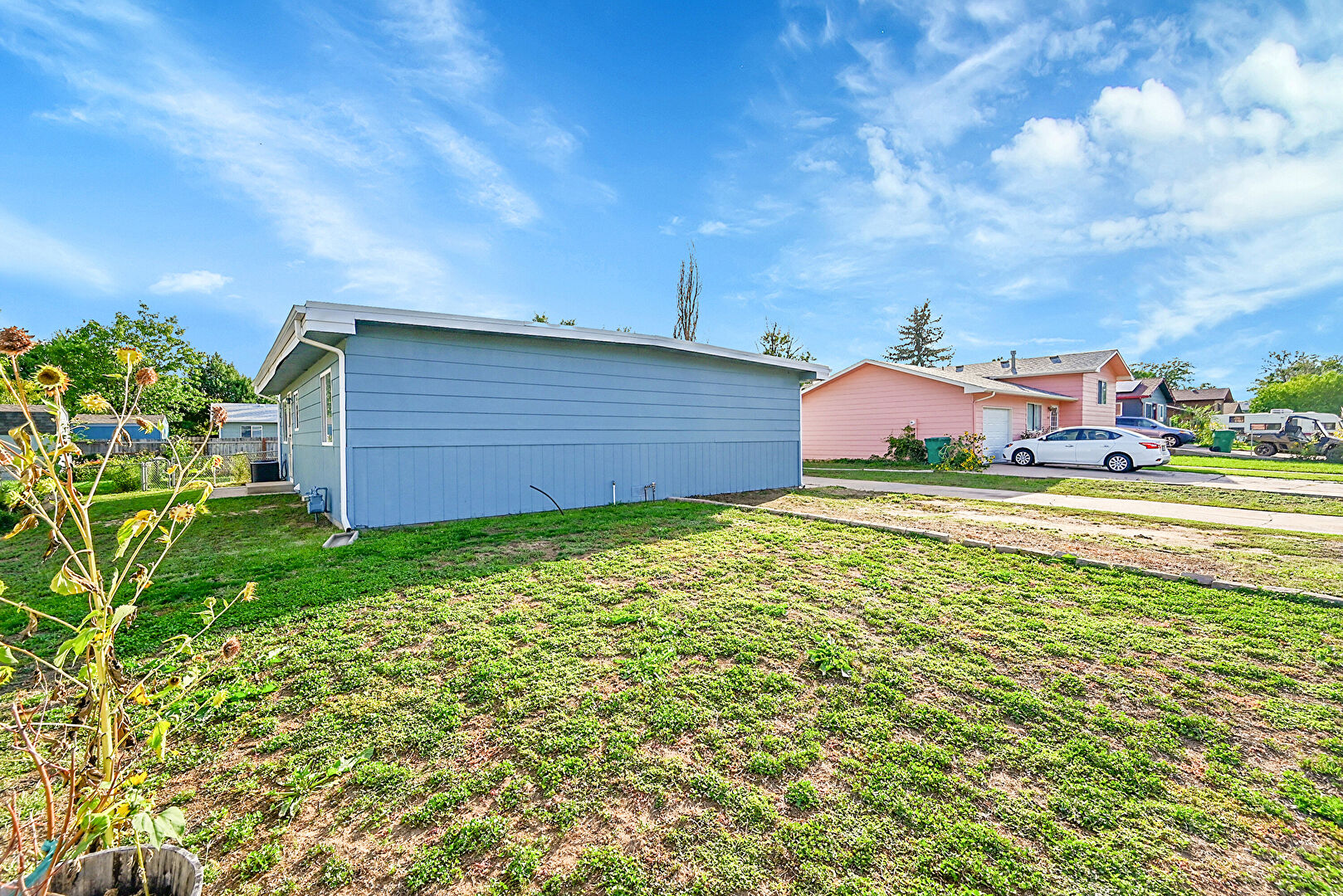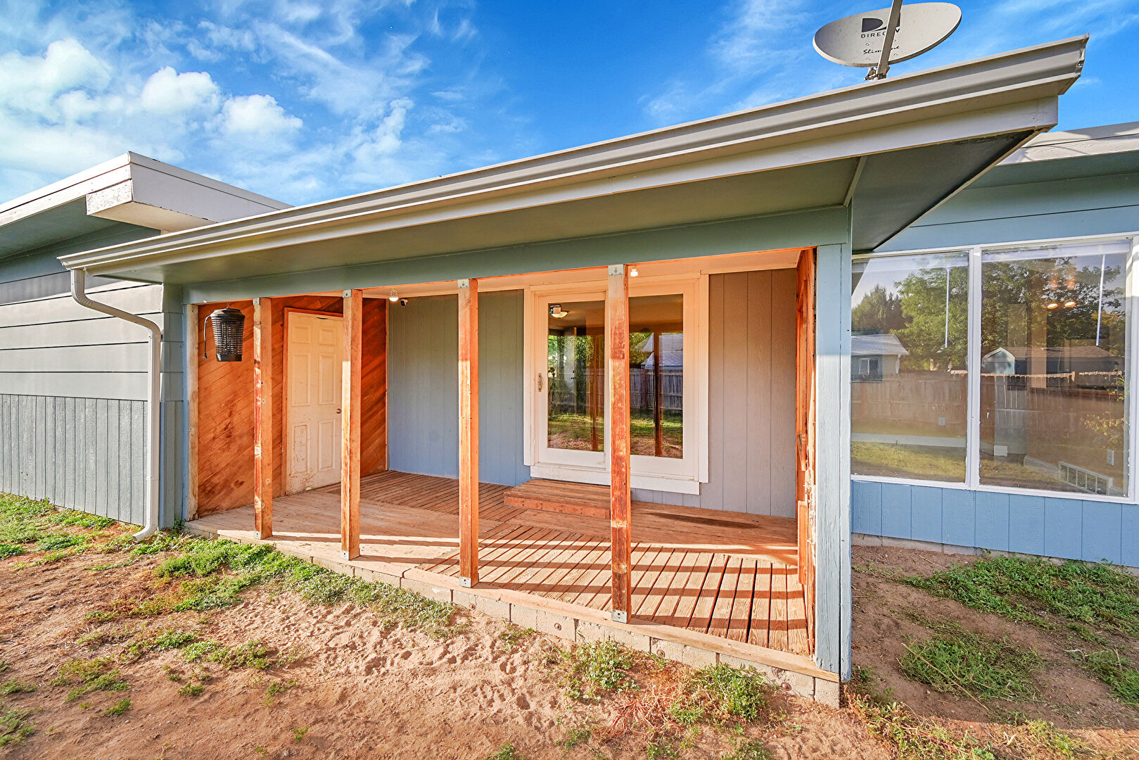 Downspout, Fence, Horizontal Siding, Lawn, Patio, Residential View, Satellite Dish, Fence, Gutters, Lawn