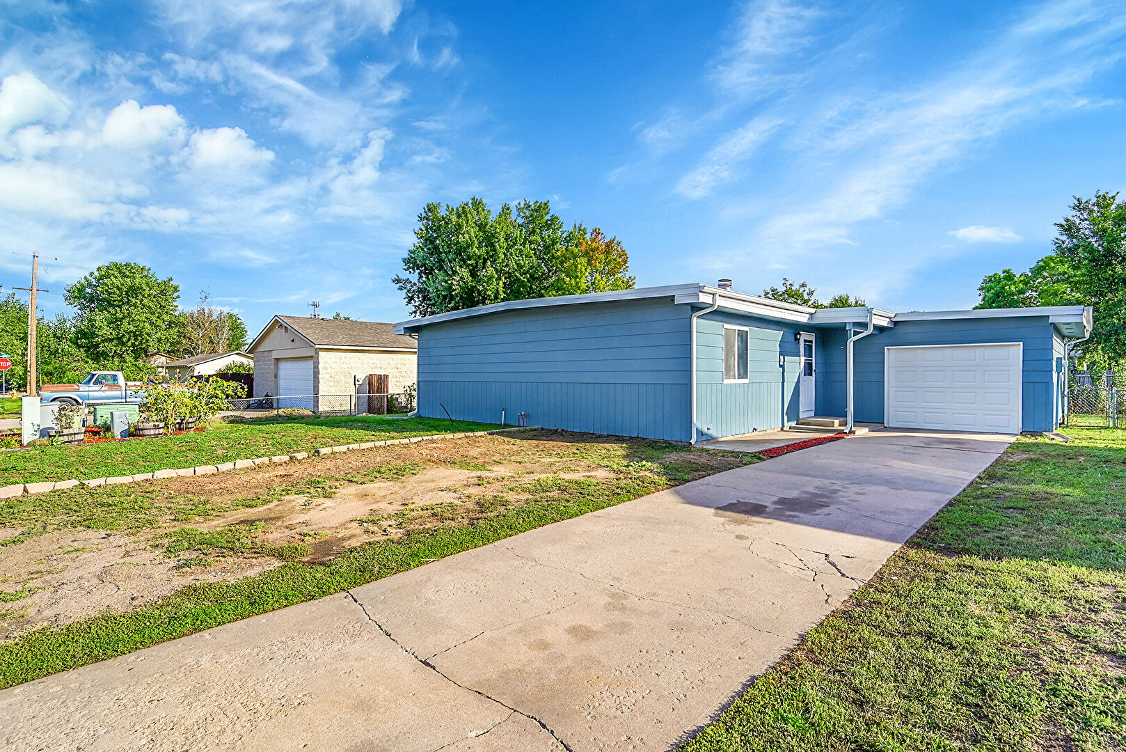 Detached Garage, Downspout, Driveway, Fence, Gutters, Horizontal Siding, Lawn, Stoop, Vertical Siding, Fence, Horizontal Siding, Lawn