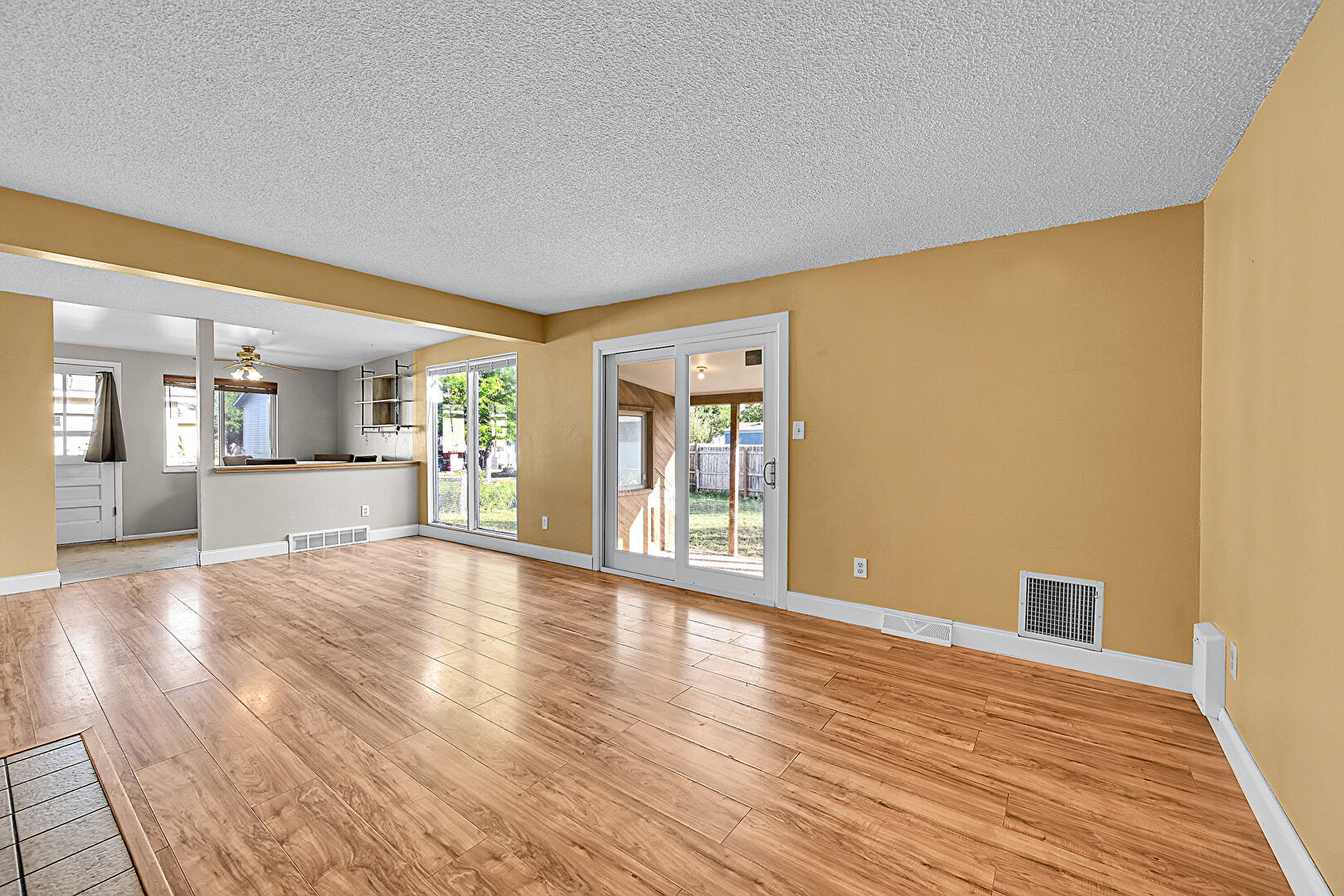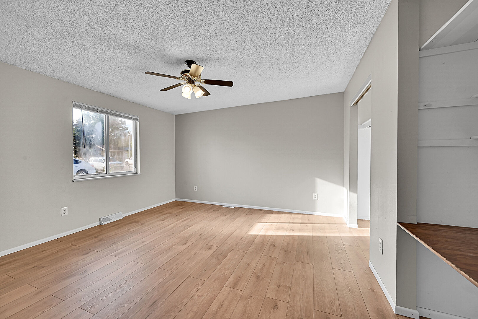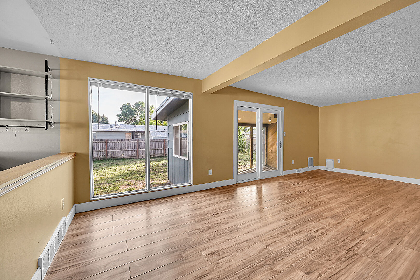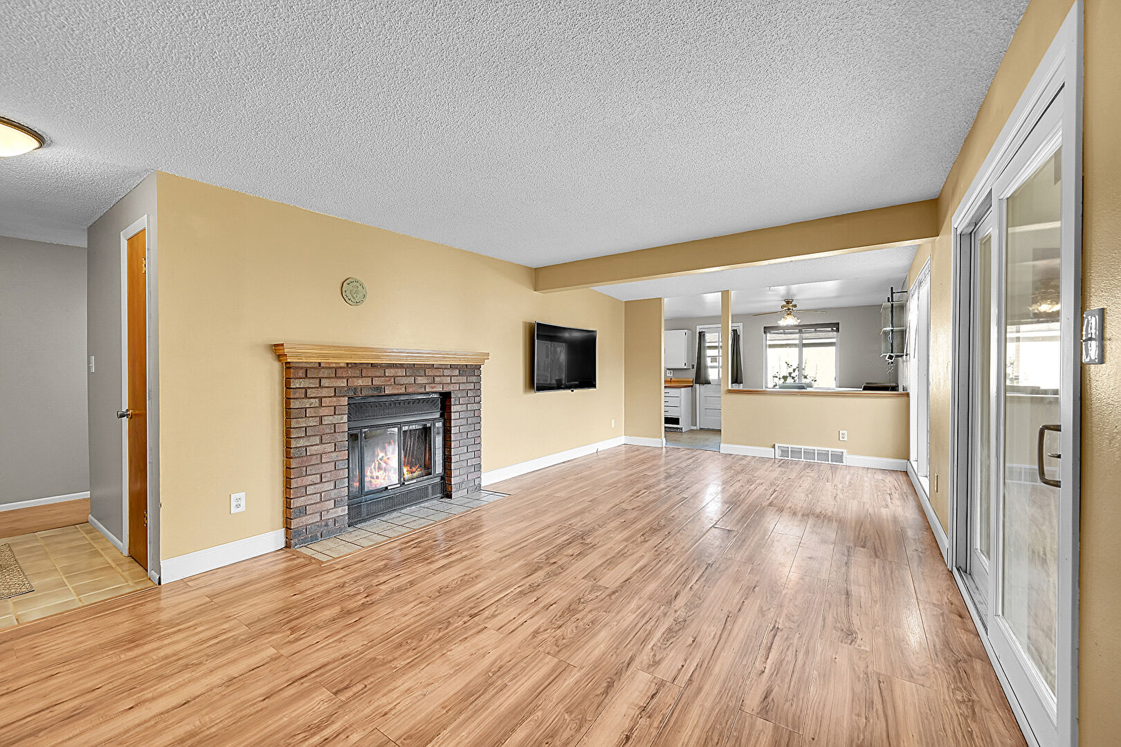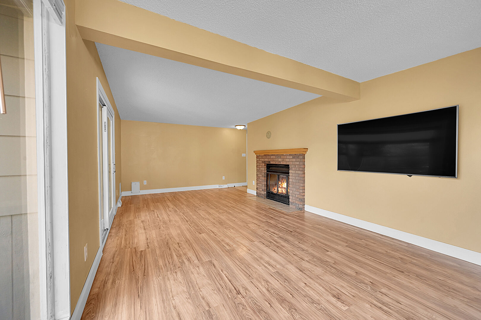 Baseboards Wall, Beamed Ceiling, Ceiling Fan, Drywall, Fireplace, Natural Light, Textured Ceiling, Vent, Wood Finish Floor, Beamed Ceiling, Vent, Wood Finish Floor
