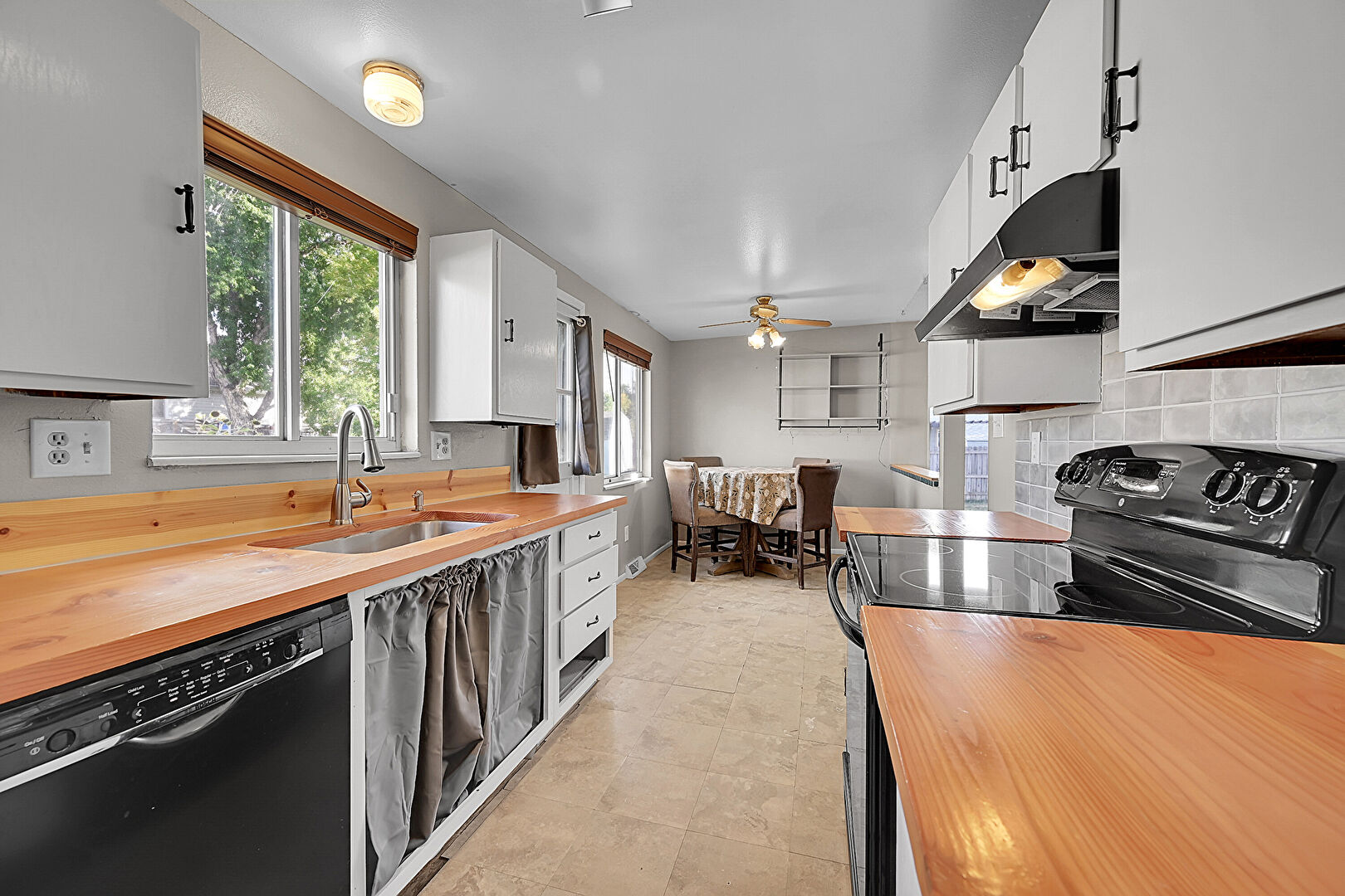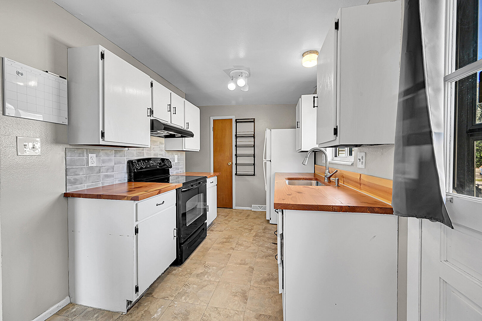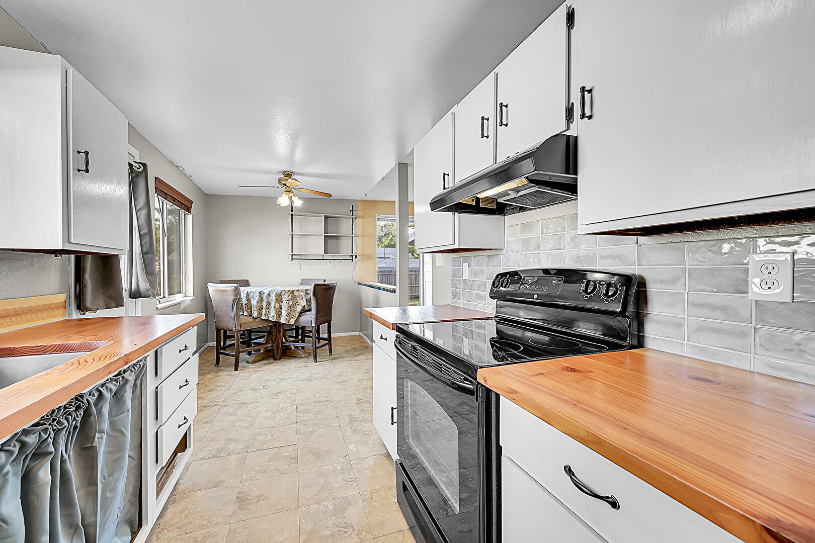 Baseboards Wall, Butcher Block Countertops, Ceiling Fan, Drywall, Galley Kitchen, Natural Light, Tile Floor, Visible Hinge Cabinets, Drywall, Galley Kitchen, Natural Light, Vent, Visible Hinge Cabinets