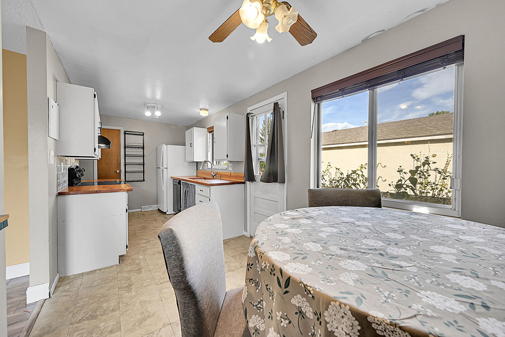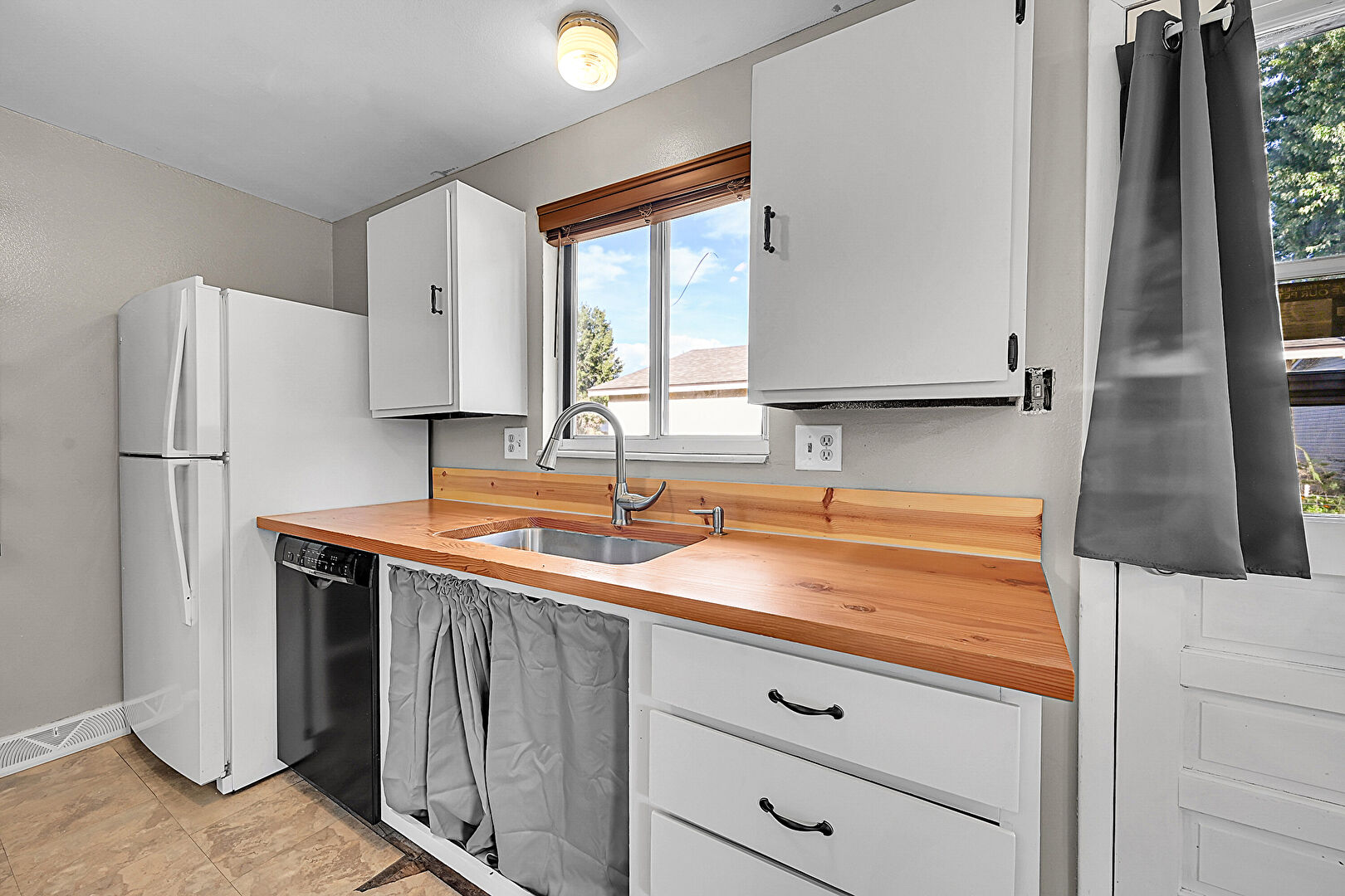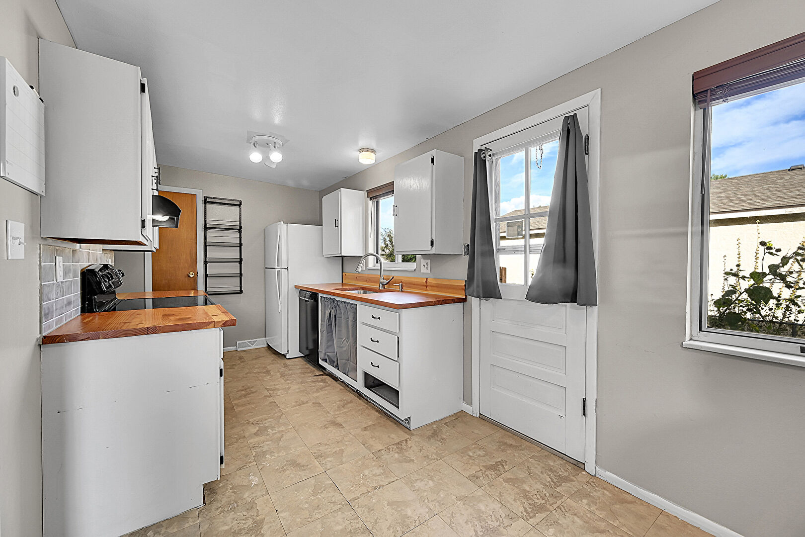 Baseboards Wall, Butcher Block Countertops, Ceiling Fan, Drywall, Galley Kitchen, Natural Light, Tile Floor, Visible Hinge Cabinets, Drywall, Galley Kitchen, Natural Light, Vent, Visible Hinge Cabinets