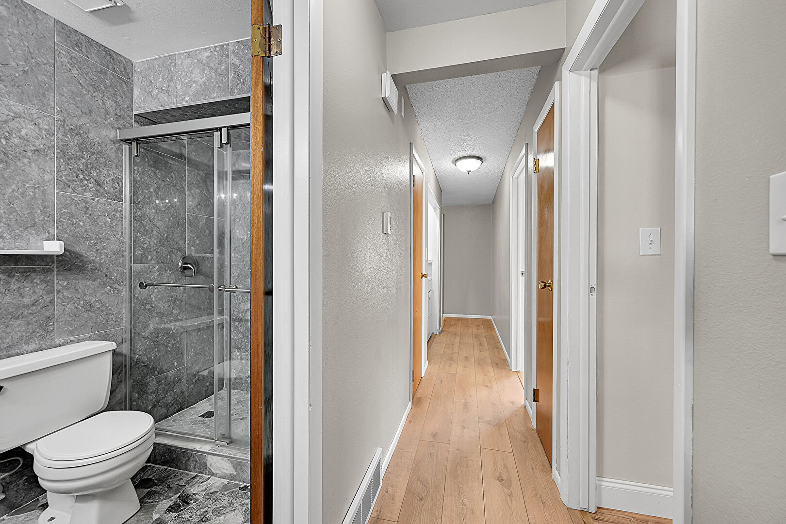 Baseboards Wall, Full Bathroom, Textured Ceiling, Textured Wall, Vent, Wood Finish Floor, Tile Wall