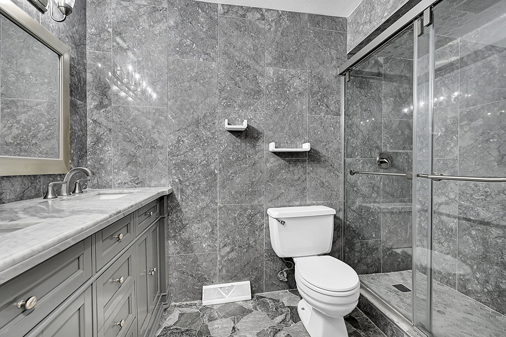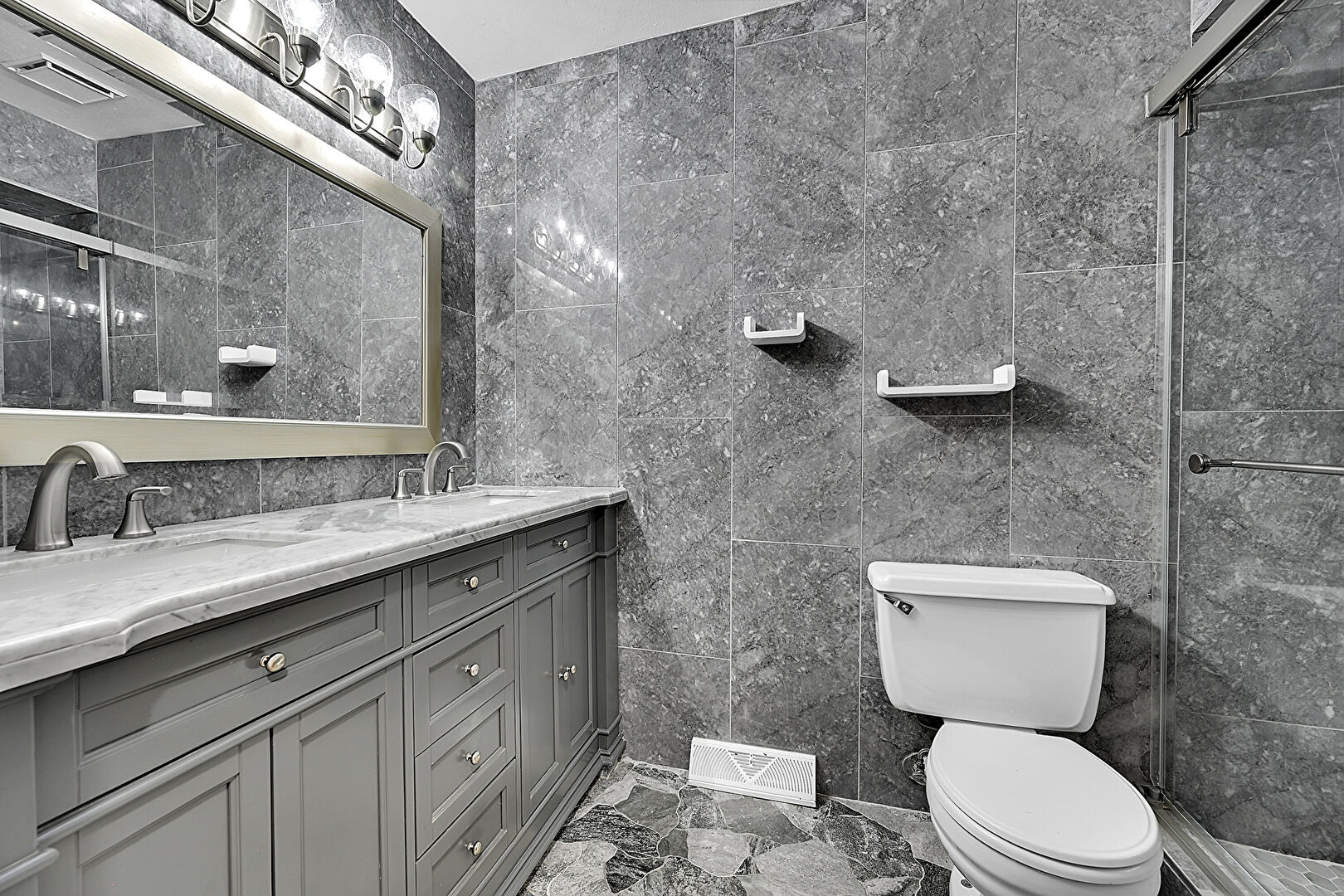 Double Vanity, Marble Finish Floor, Tile Wall, Vanity, Vent, Full Bathroom