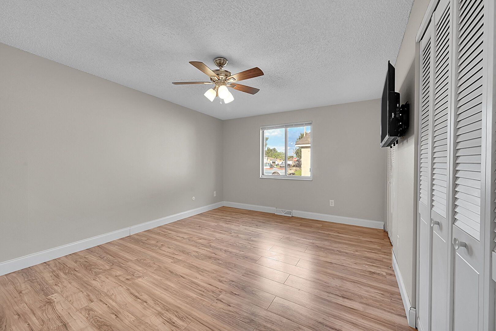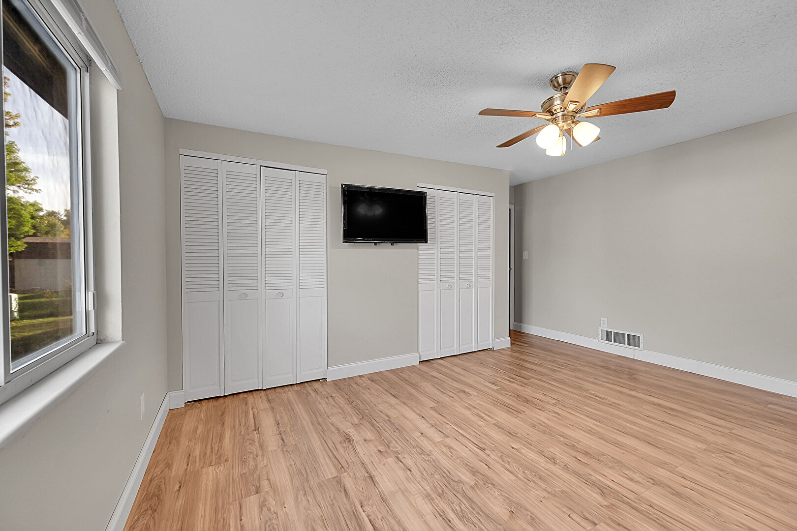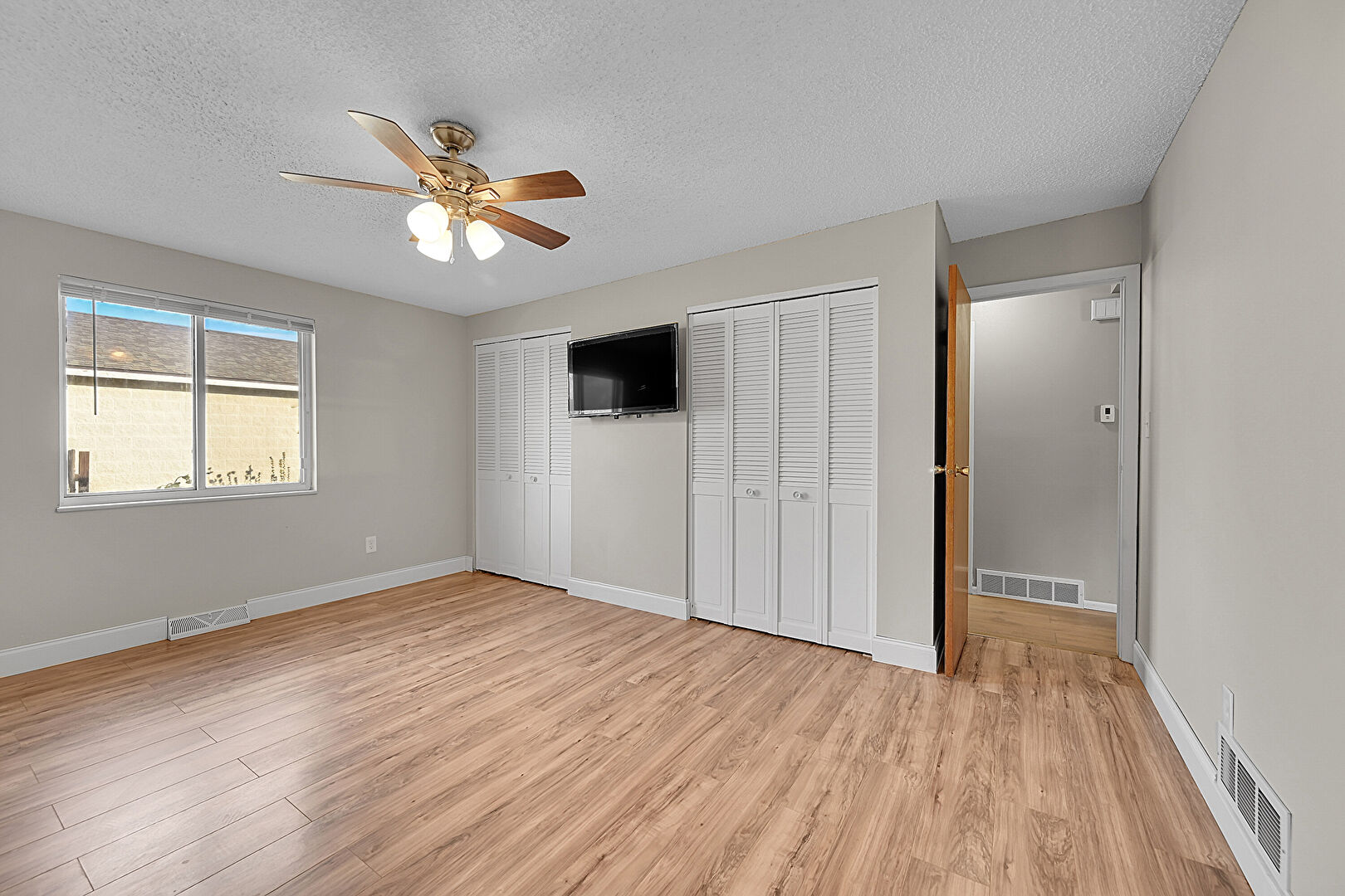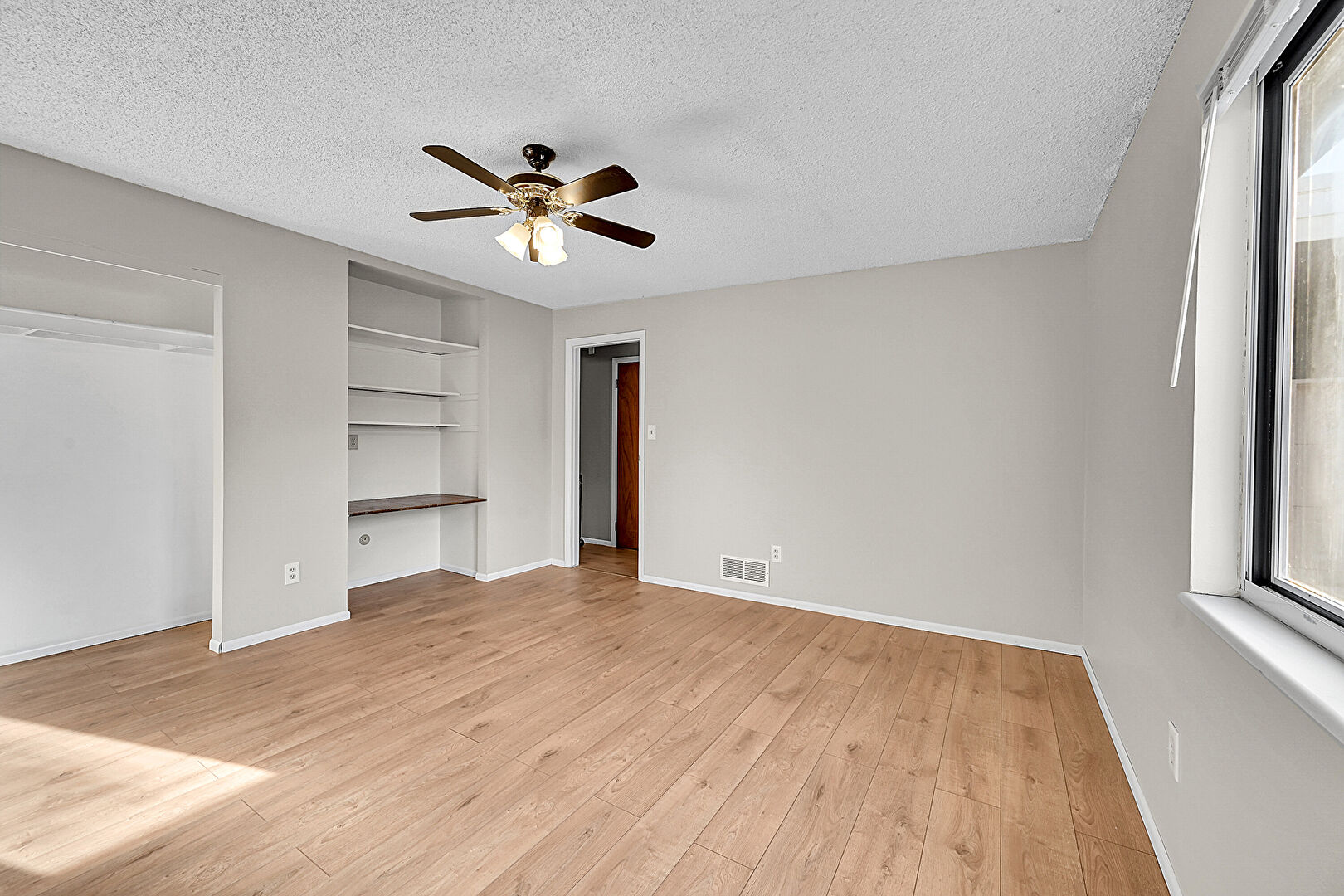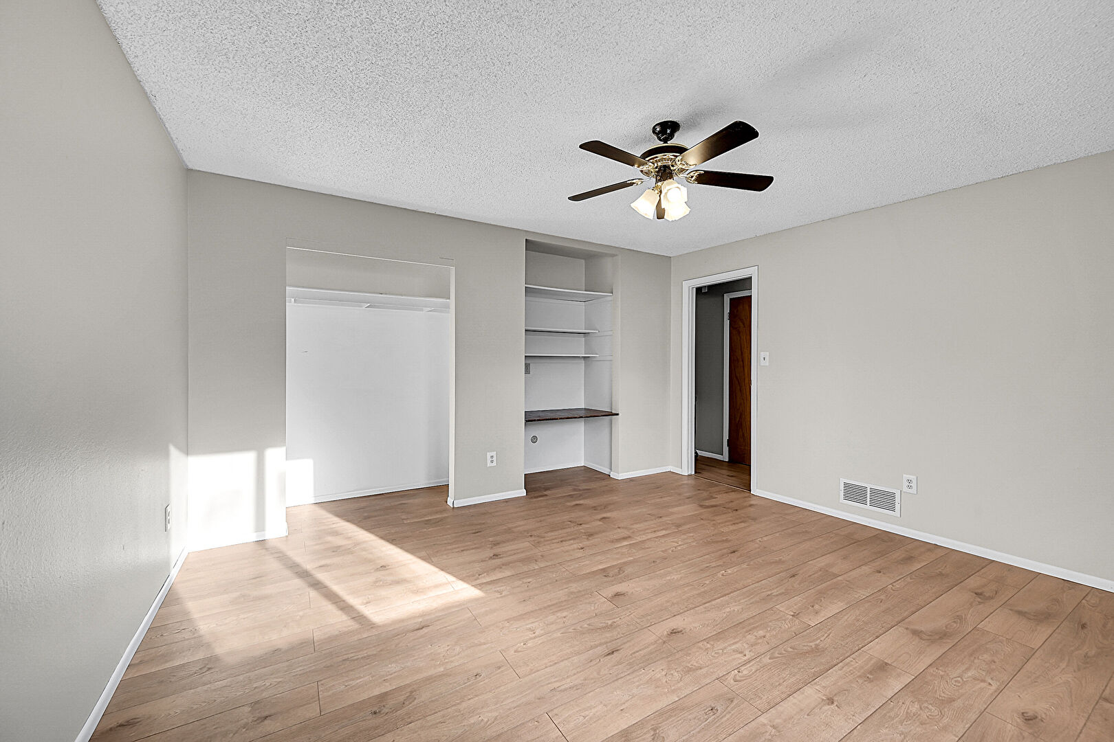 Baseboards Wall, Built In Desk, Ceiling Fan, Closet, Drywall, Natural Light, Office Area, Textured Ceiling, Two Closets, Vent, Wood Finish Floor, Drywall, Office Area, Textured Ceiling, Vent, Wood Finish Floor