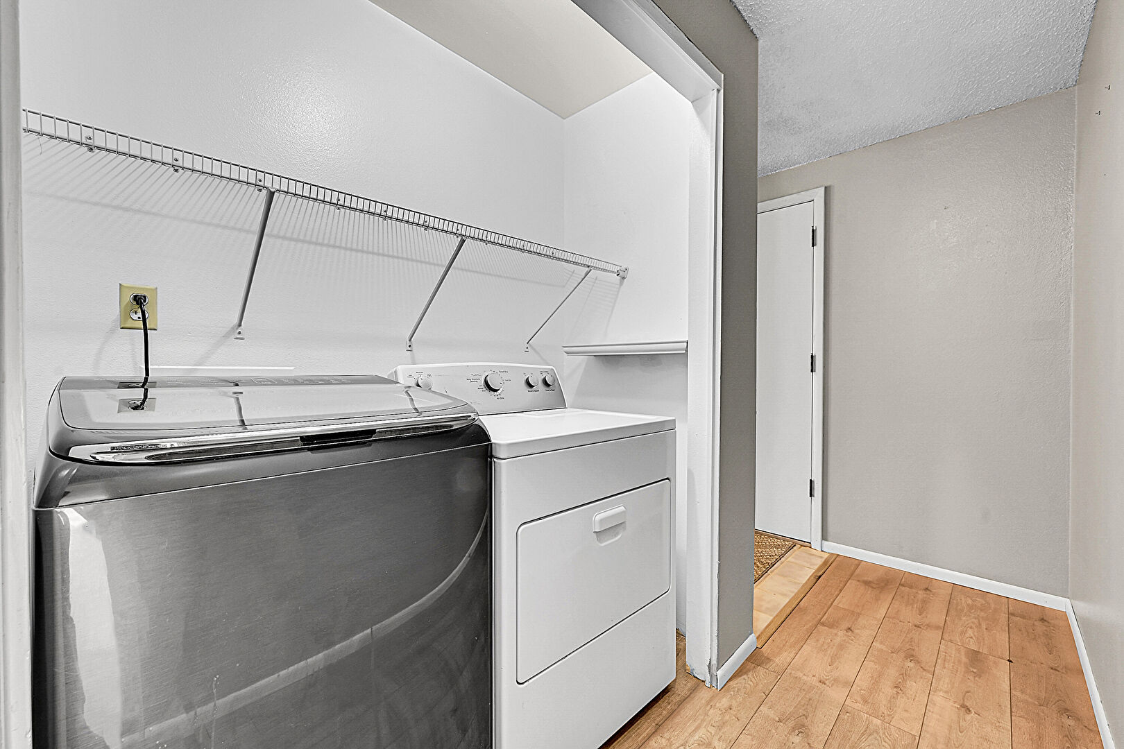 Baseboards Wall, Drywall, Laundry, Textured Ceiling, Wood Finish Floor