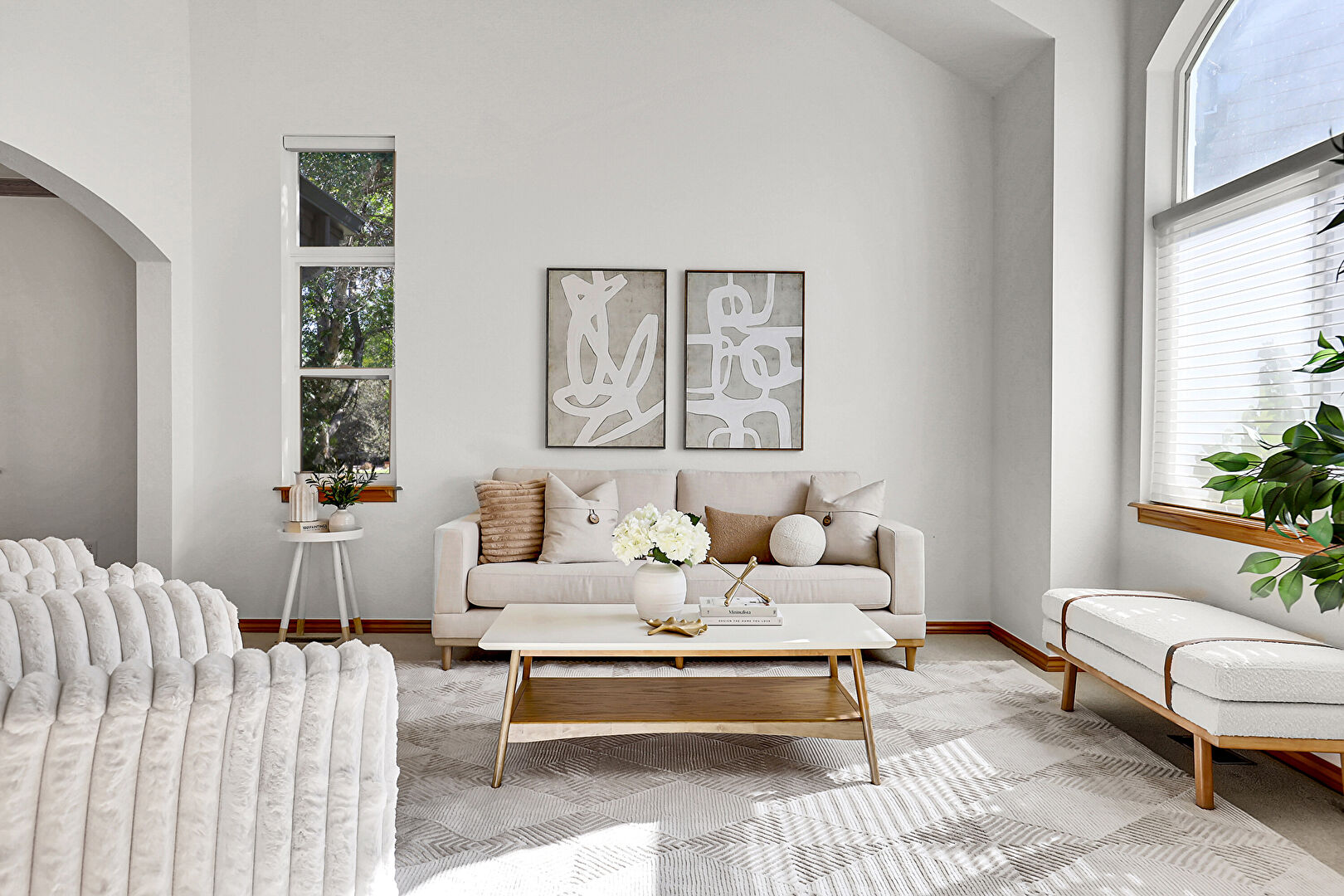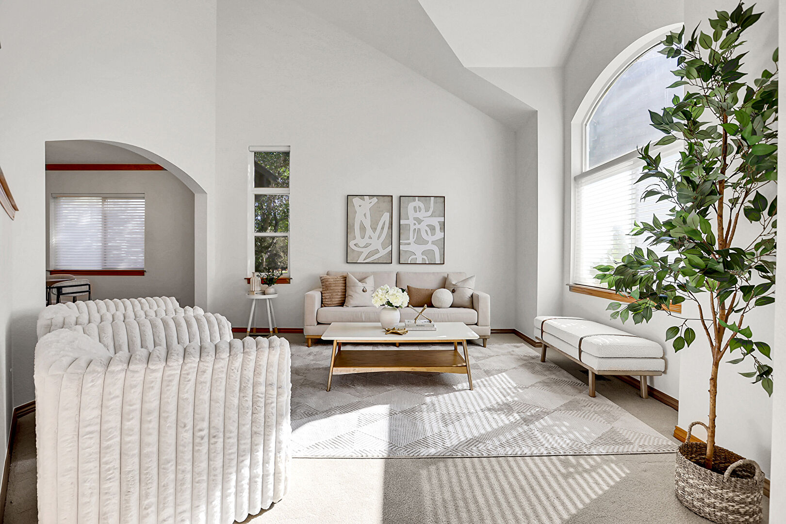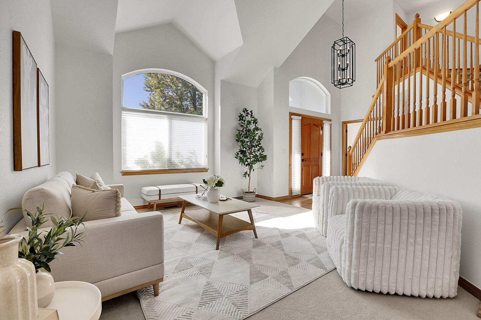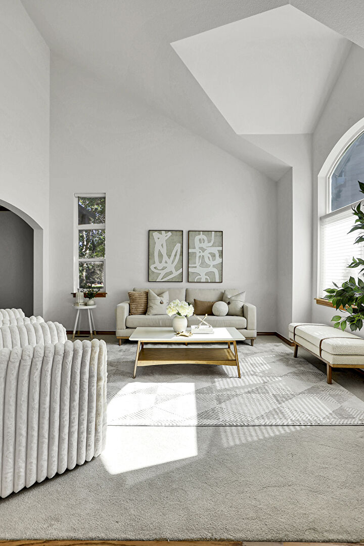 Baseboards Wall, Carpet, Drywall, High Ceiling, Natural Light, Vaulted Ceiling