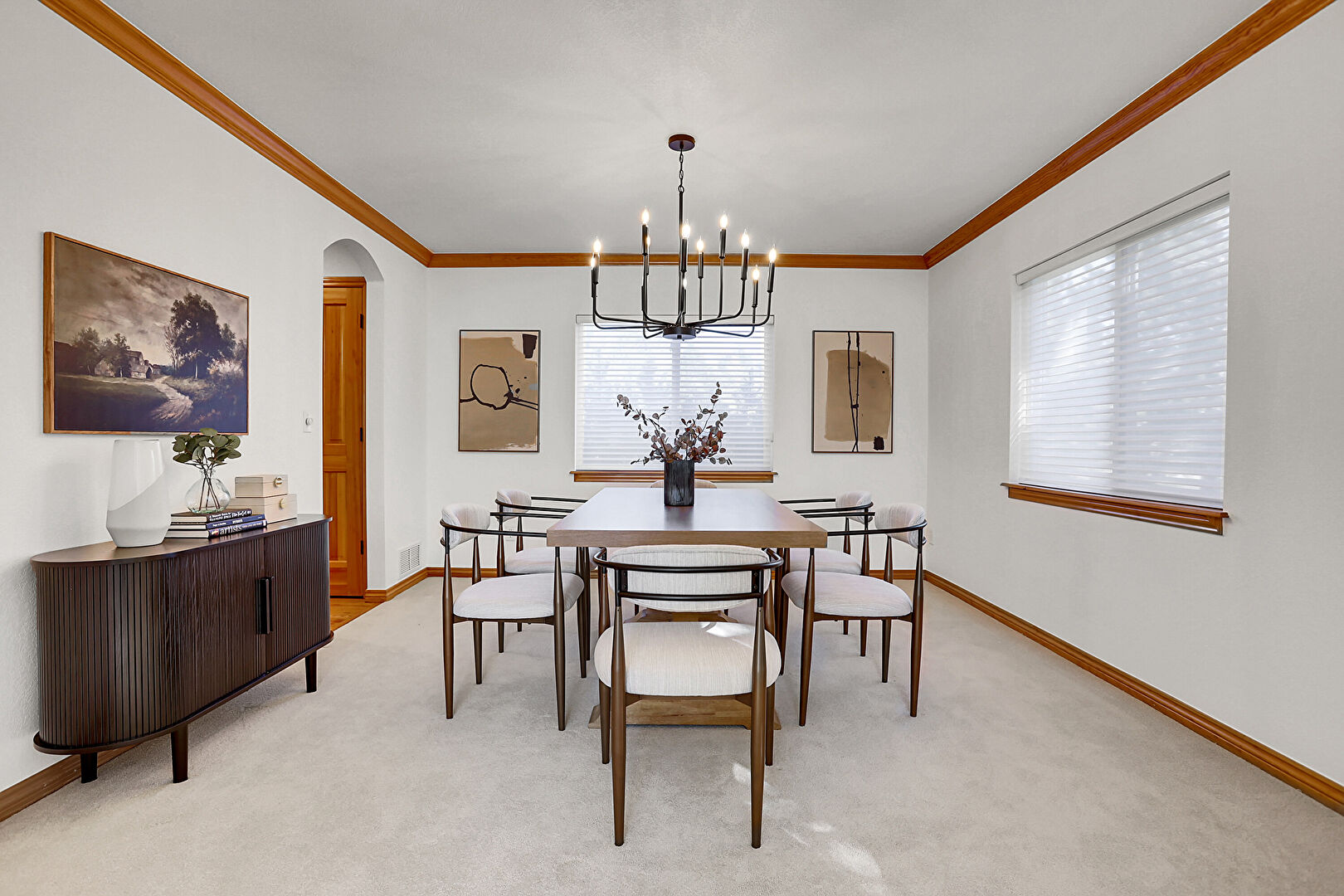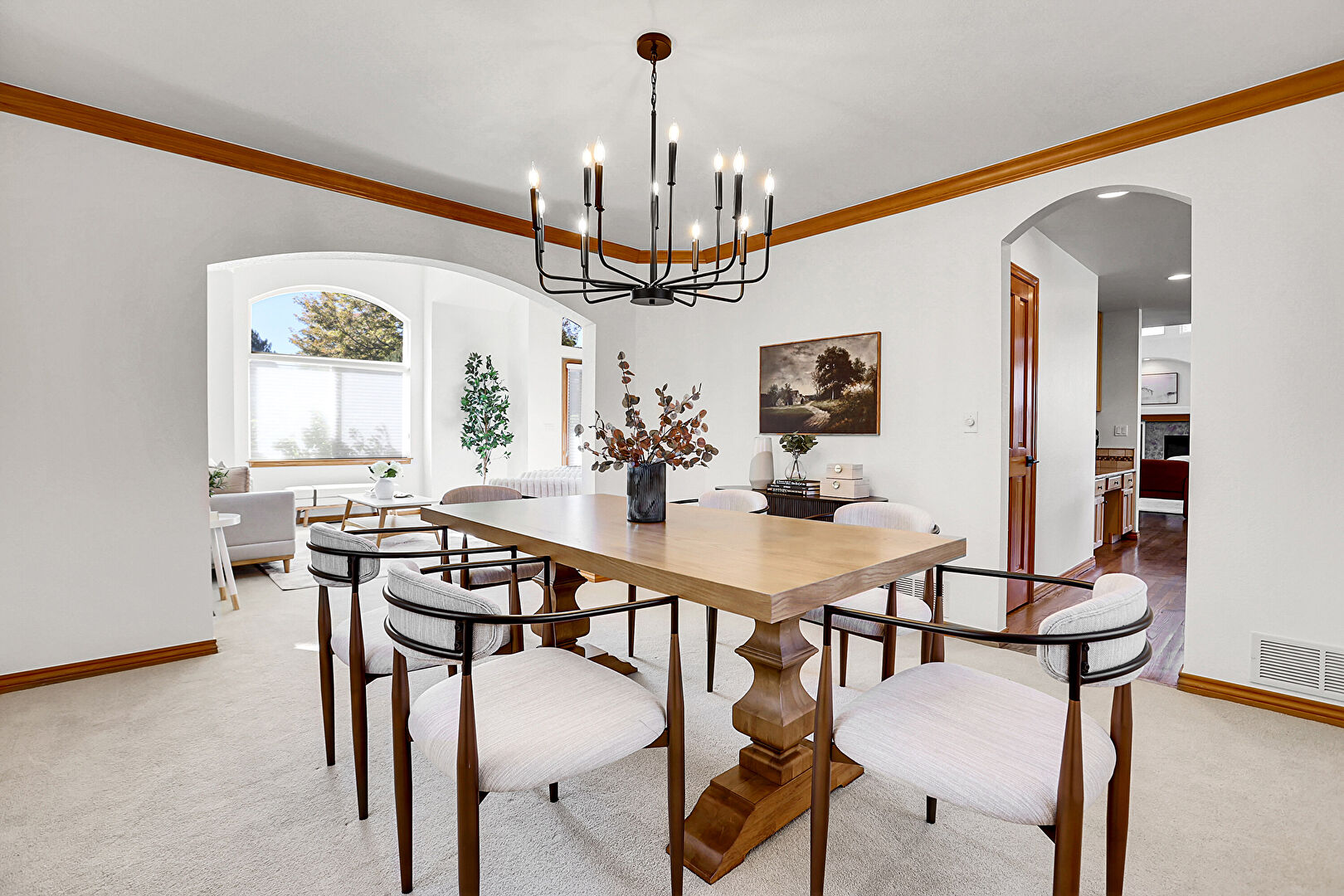 Arched Walkways, Baseboards Wall, Carpet, Crown Molding, Drywall, Natural Light, Notable Chandelier, Vent, Wood Finish Floor, Natural Light, Recessed Lighting