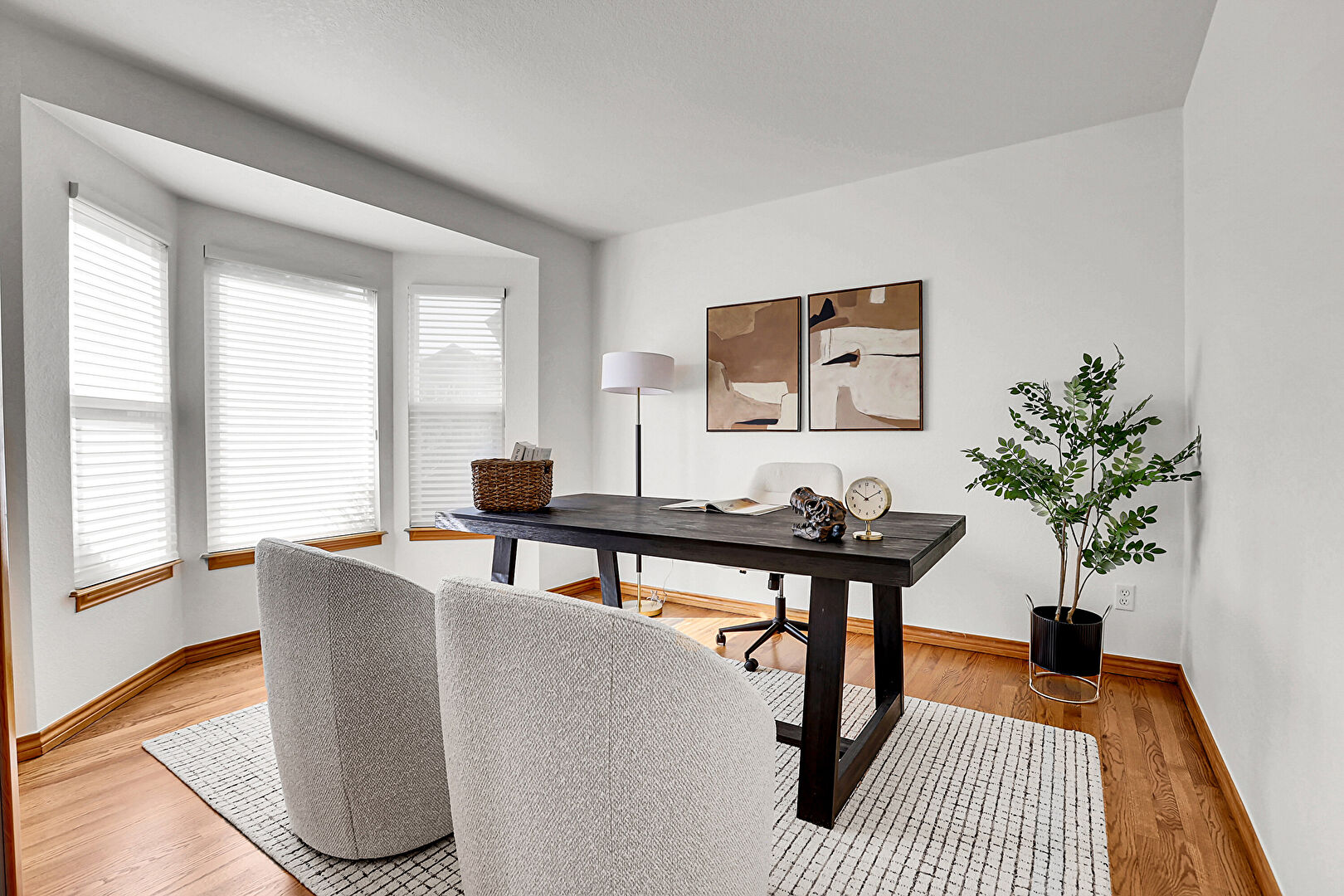 Baseboards Wall, Drywall, Natural Light, Wood Finish Floor, Office Area