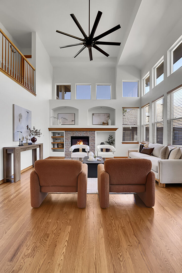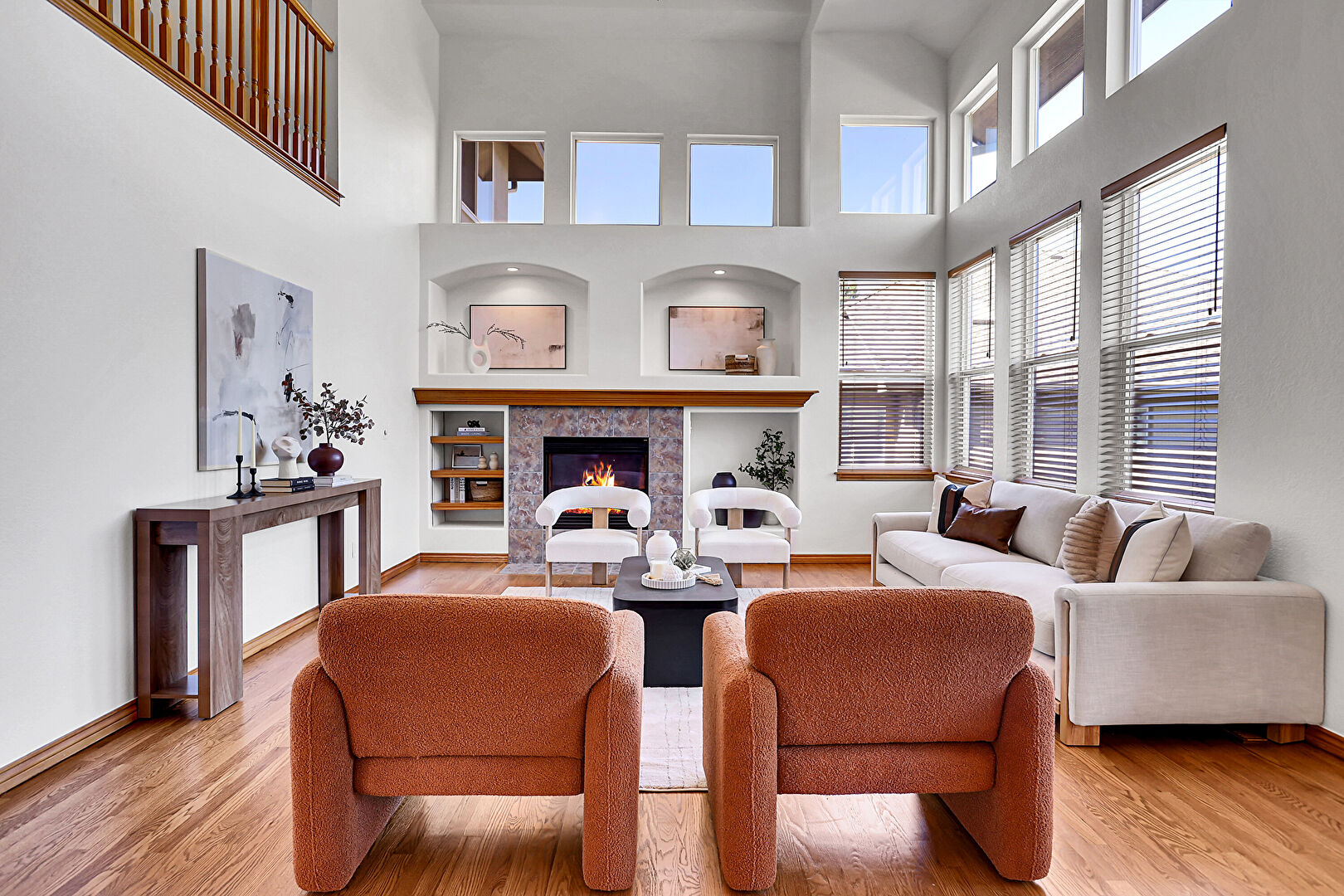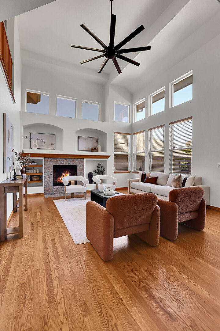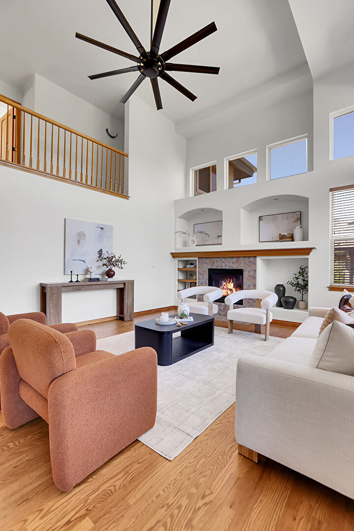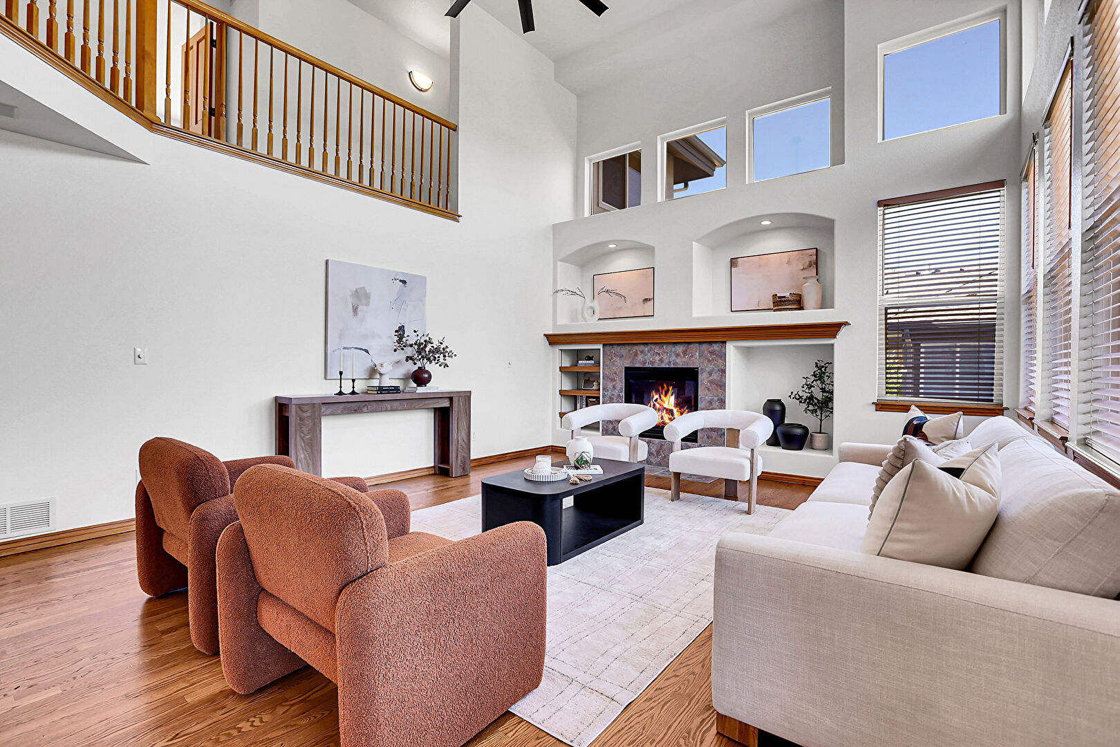 Arched Walkways, Baseboards Wall, Built In Shelves, Carpet, Ceiling Fan, Drywall, Fireplace, High Ceiling, Natural Light, Stairs, Vaulted Ceiling, Vent, Wood Finish Floor, Baseboards Wall, Carpet, Ceiling Fan, Drywall, High Ceiling, Natural Light, Notable Chandelier, Wood Finish Floor