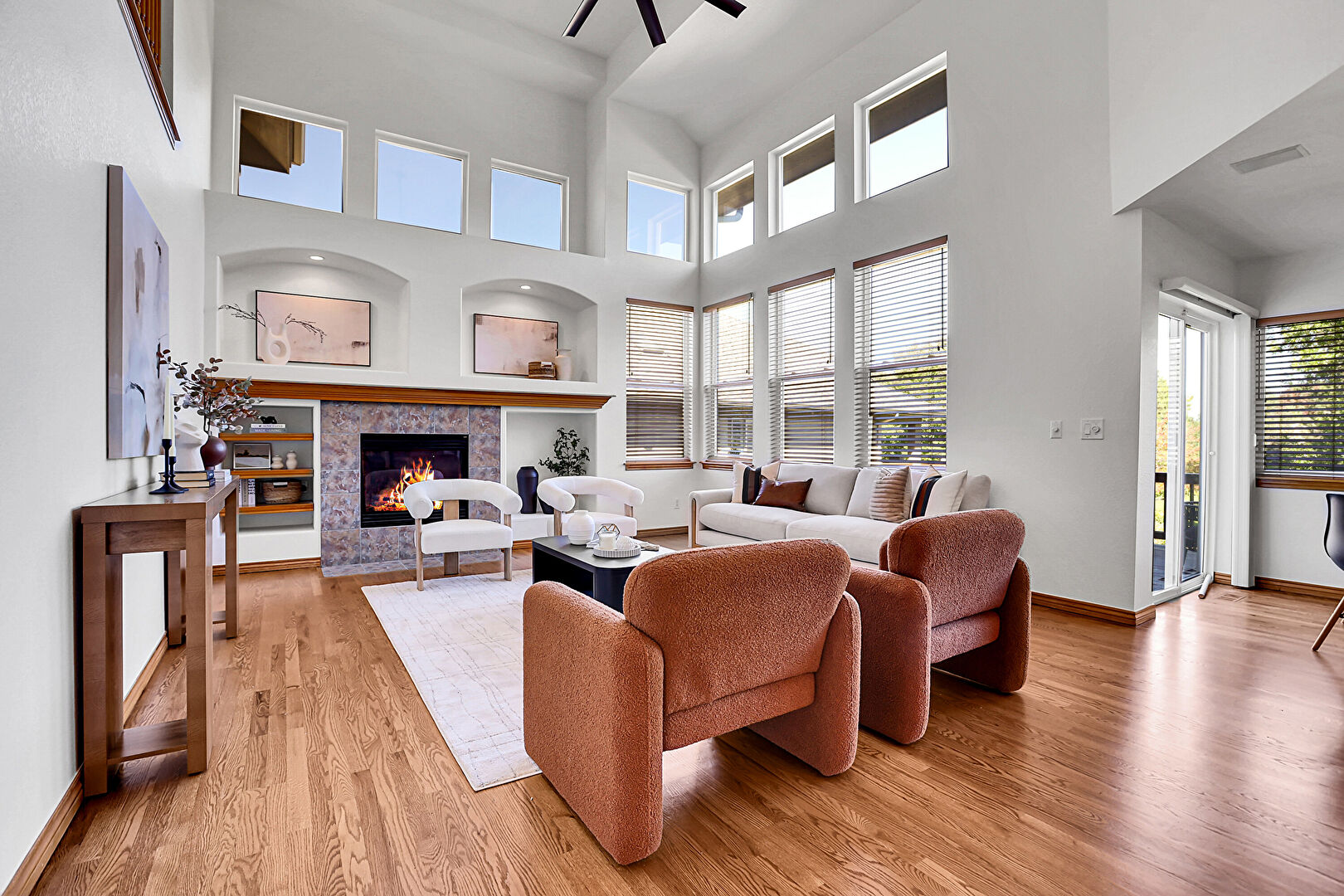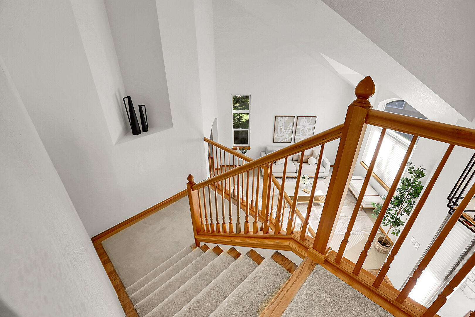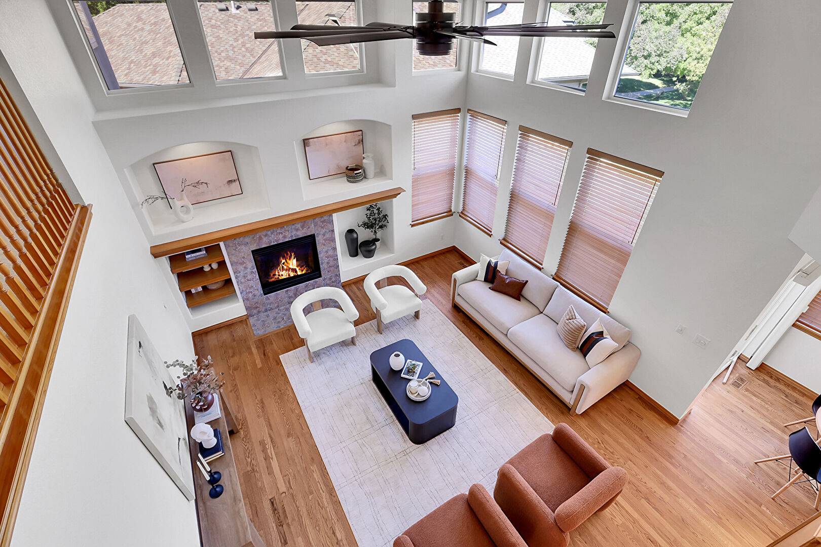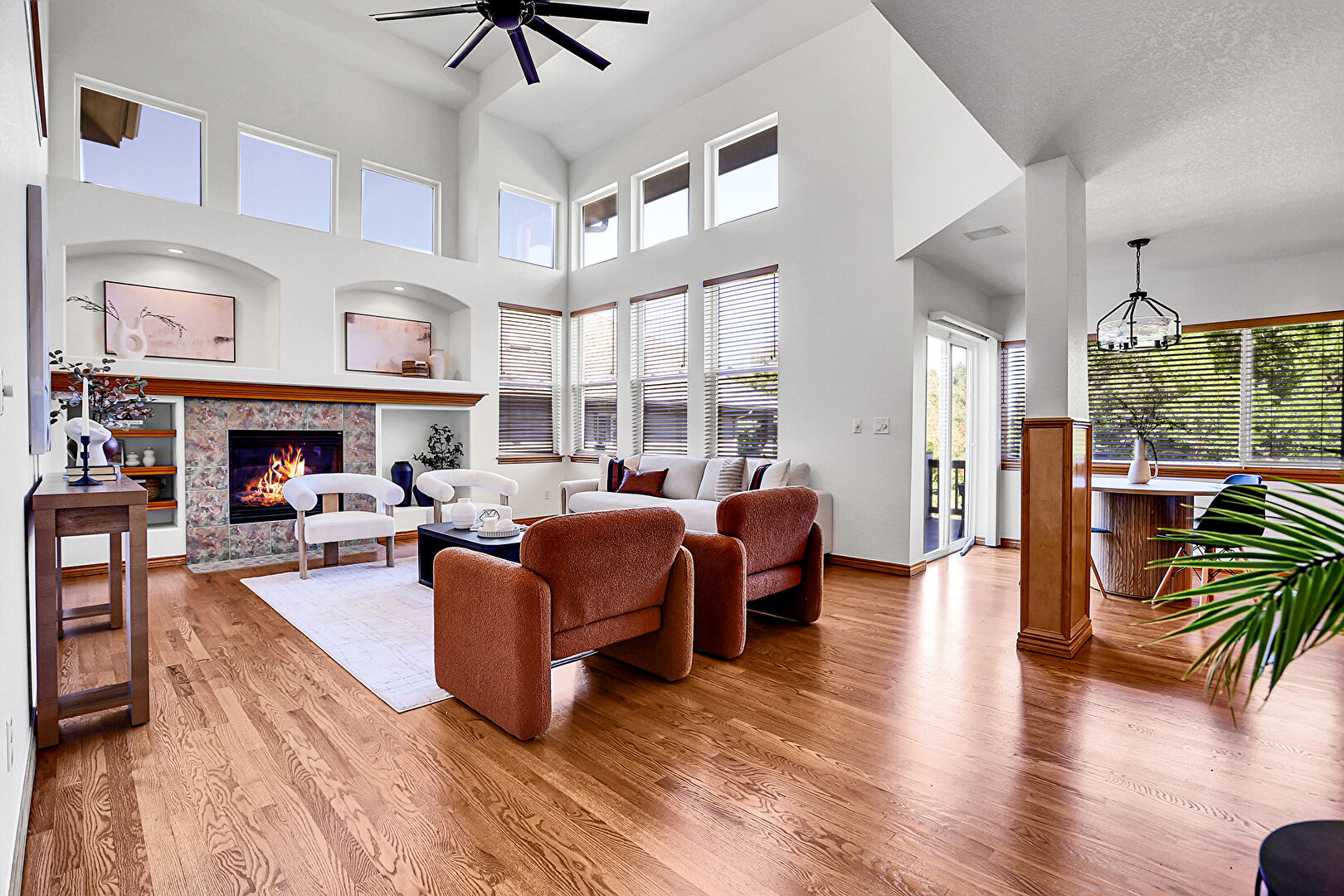 Arched Walkways, Baseboards Wall, Built In Shelves, Carpet, Ceiling Fan, Drywall, Fireplace, High Ceiling, Natural Light, Stairs, Vaulted Ceiling, Vent, Wood Finish Floor, Baseboards Wall, Carpet, Ceiling Fan, Drywall, High Ceiling, Natural Light, Notable Chandelier, Wood Finish Floor