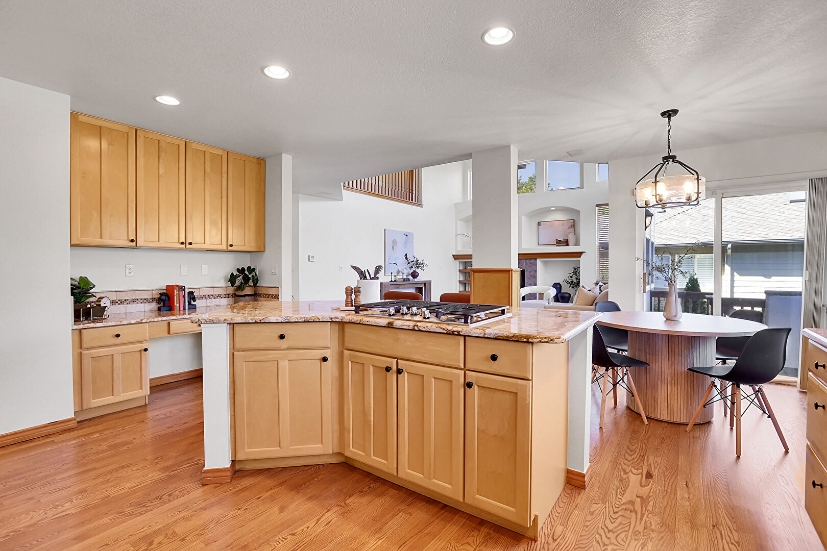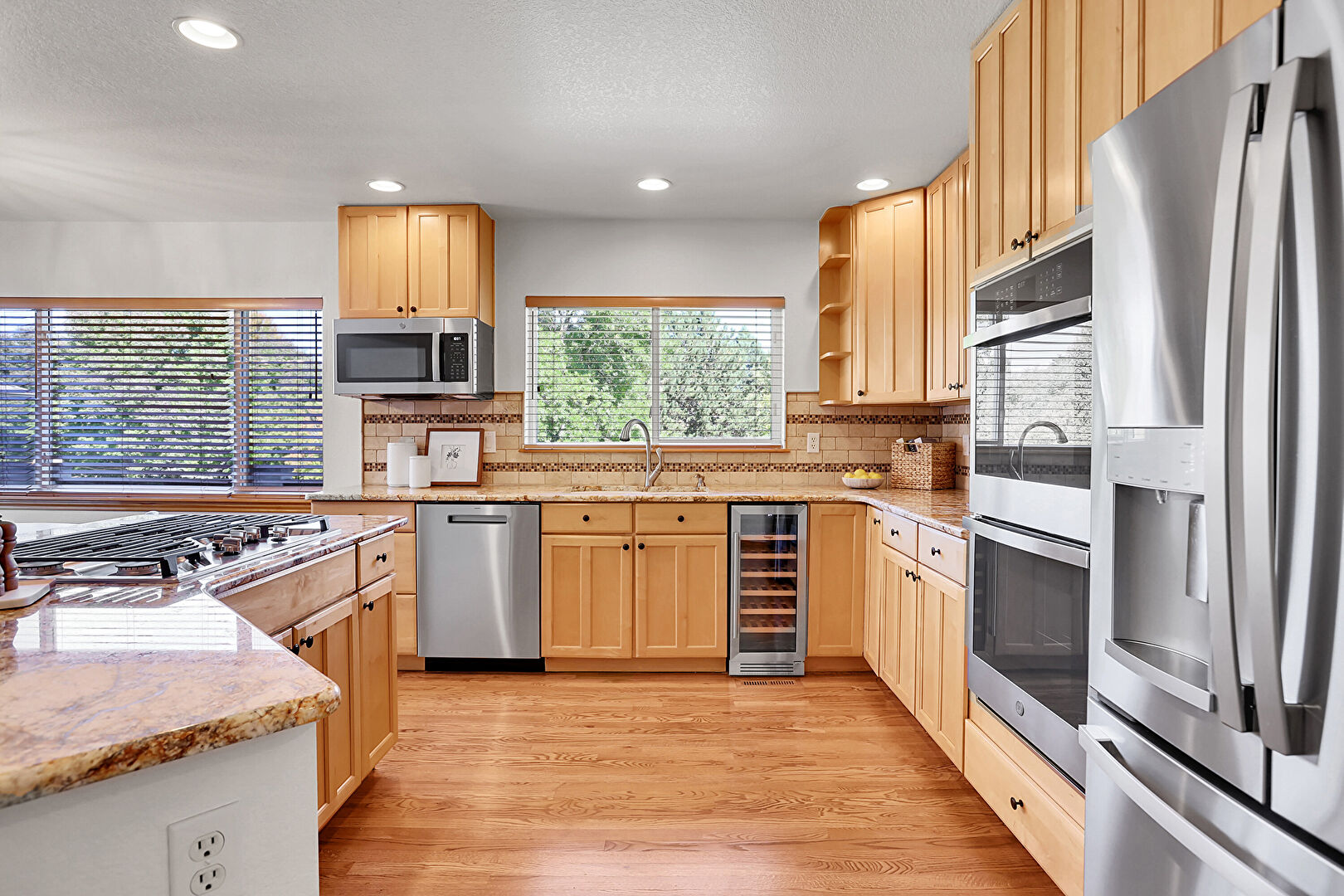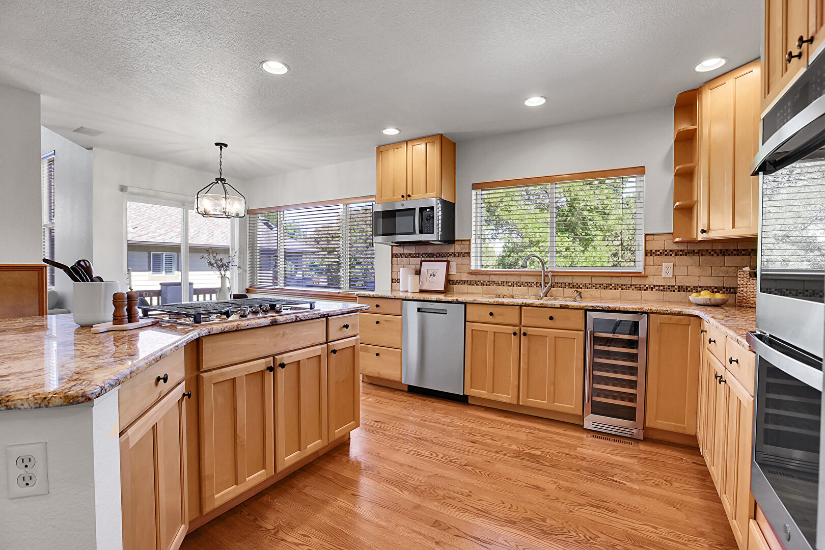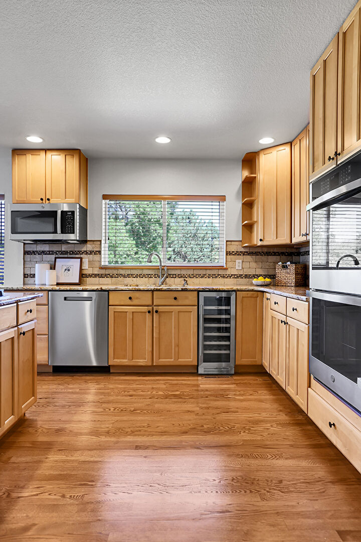 Arched Walkways, Baseboards Wall, Double Oven, Drywall, Kitchen Bar, Kitchen Island, L Shaped Kitchen, Natural Light, Notable Chandelier, Open Shelves, Opens To Living Area, Pendant Lighting, Recessed Lighting, Shaker Cabinets, Stone Countertops, Textured Ceiling, Wine Cooler, Wood Finish Floor, Pendant Lighting, Recessed Lighting, Wine Cooler, Wood Finish Floor