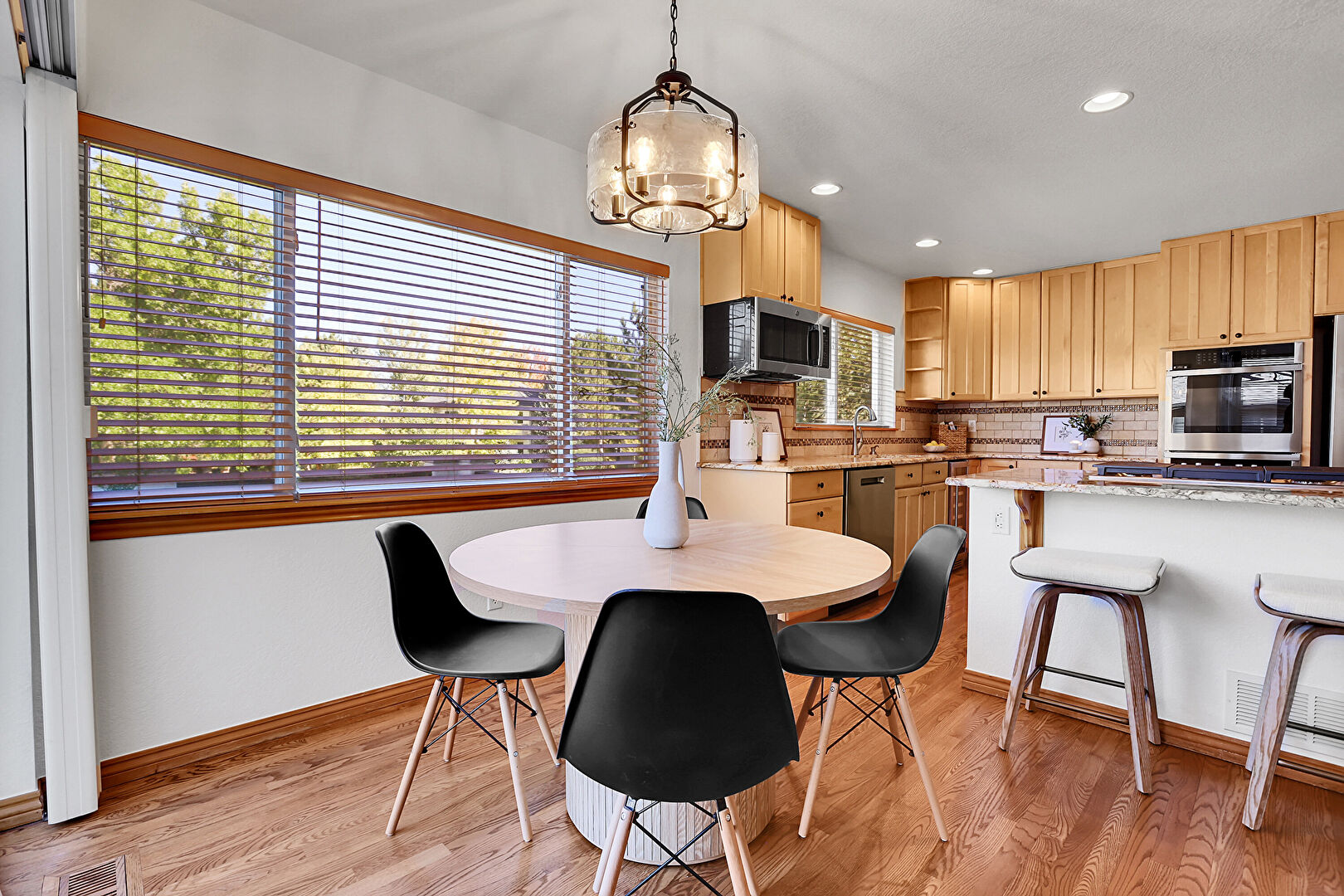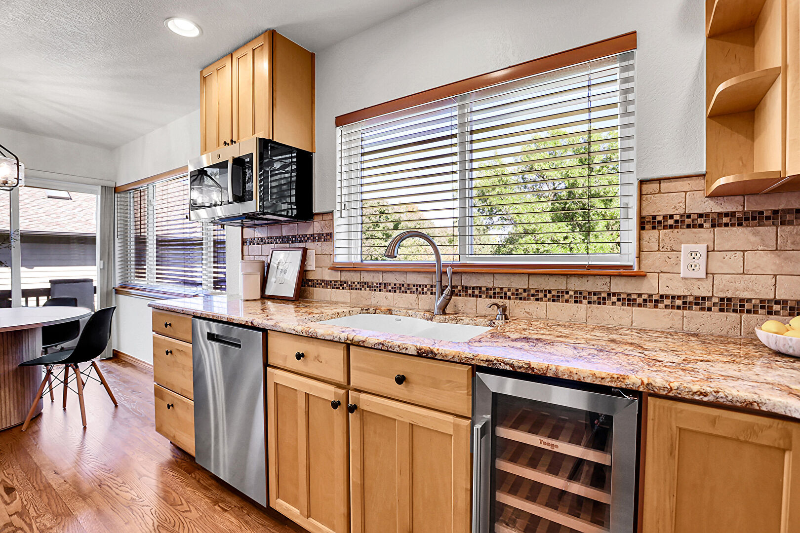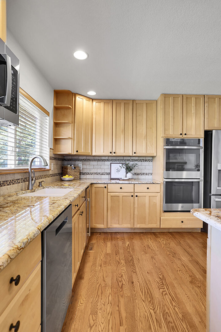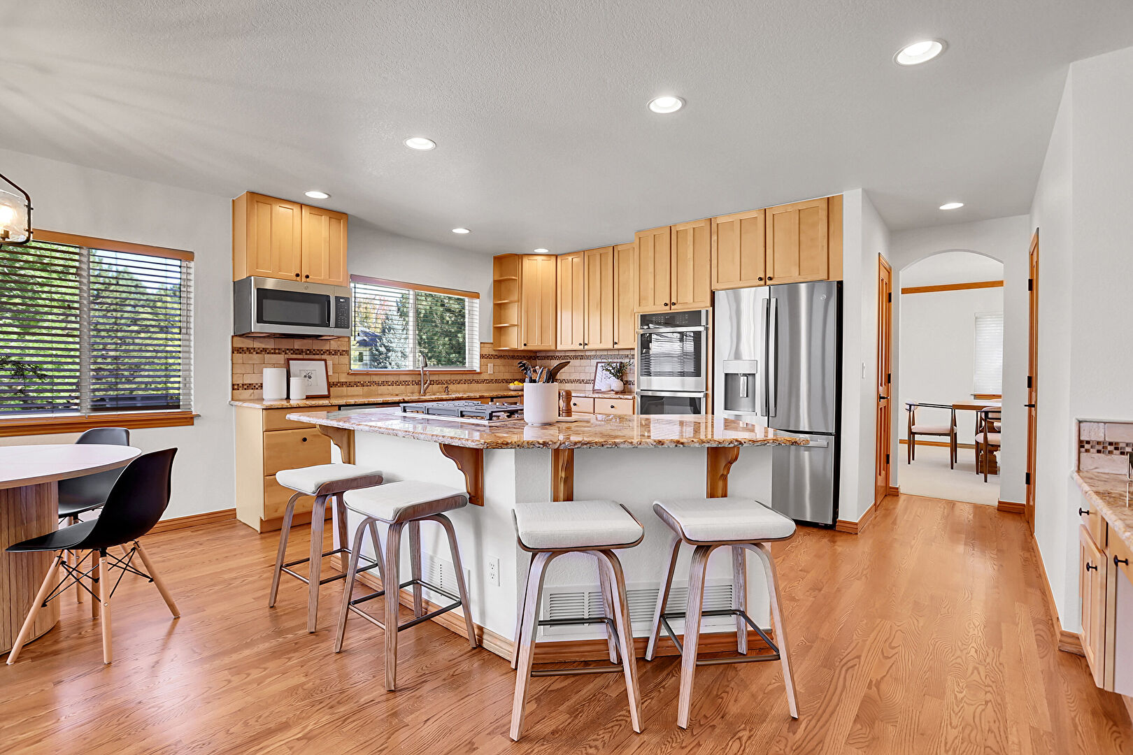 Arched Walkways, Baseboards Wall, Double Oven, Drywall, Kitchen Bar, Kitchen Island, L Shaped Kitchen, Natural Light, Notable Chandelier, Open Shelves, Opens To Living Area, Pendant Lighting, Recessed Lighting, Shaker Cabinets, Stone Countertops, Textured Ceiling, Wine Cooler, Wood Finish Floor, Pendant Lighting, Recessed Lighting, Wine Cooler, Wood Finish Floor