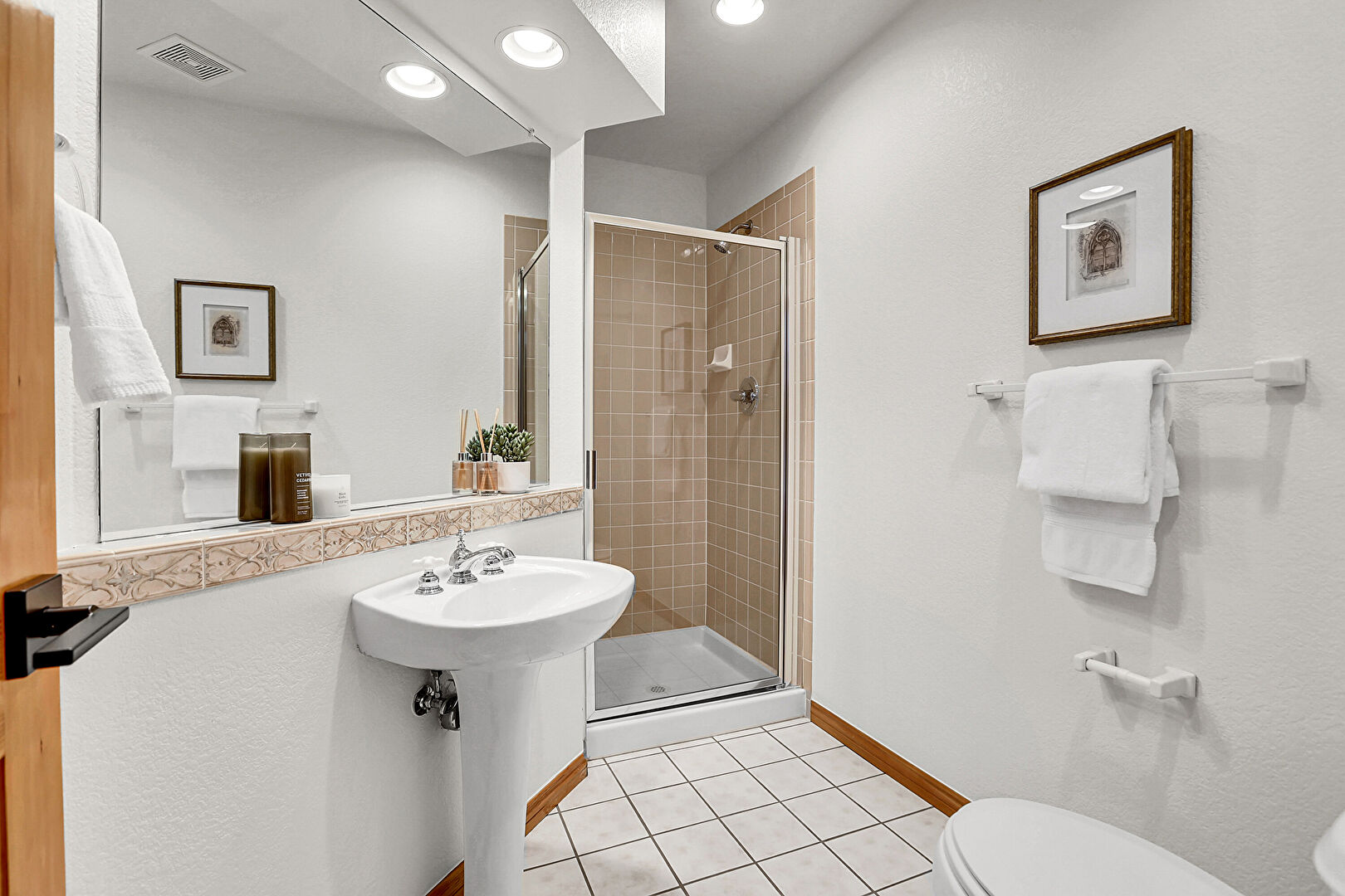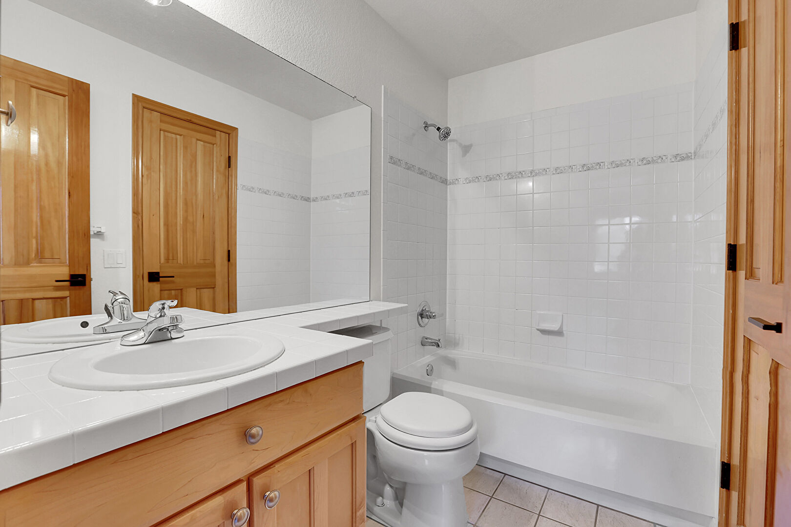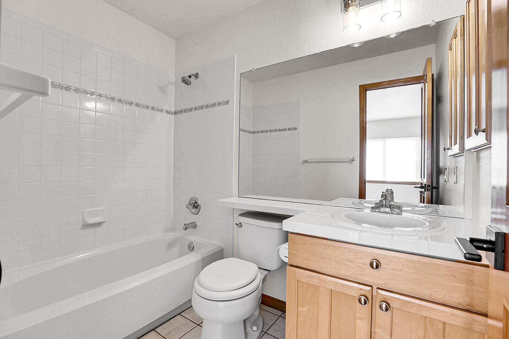 Baseboards Wall, Combined Bath Shower, Full Bathroom, Natural Light, Recessed Lighting, Textured Wall, Tile Floor, Vanity, Full Bathroom, Tile Floor, Vent