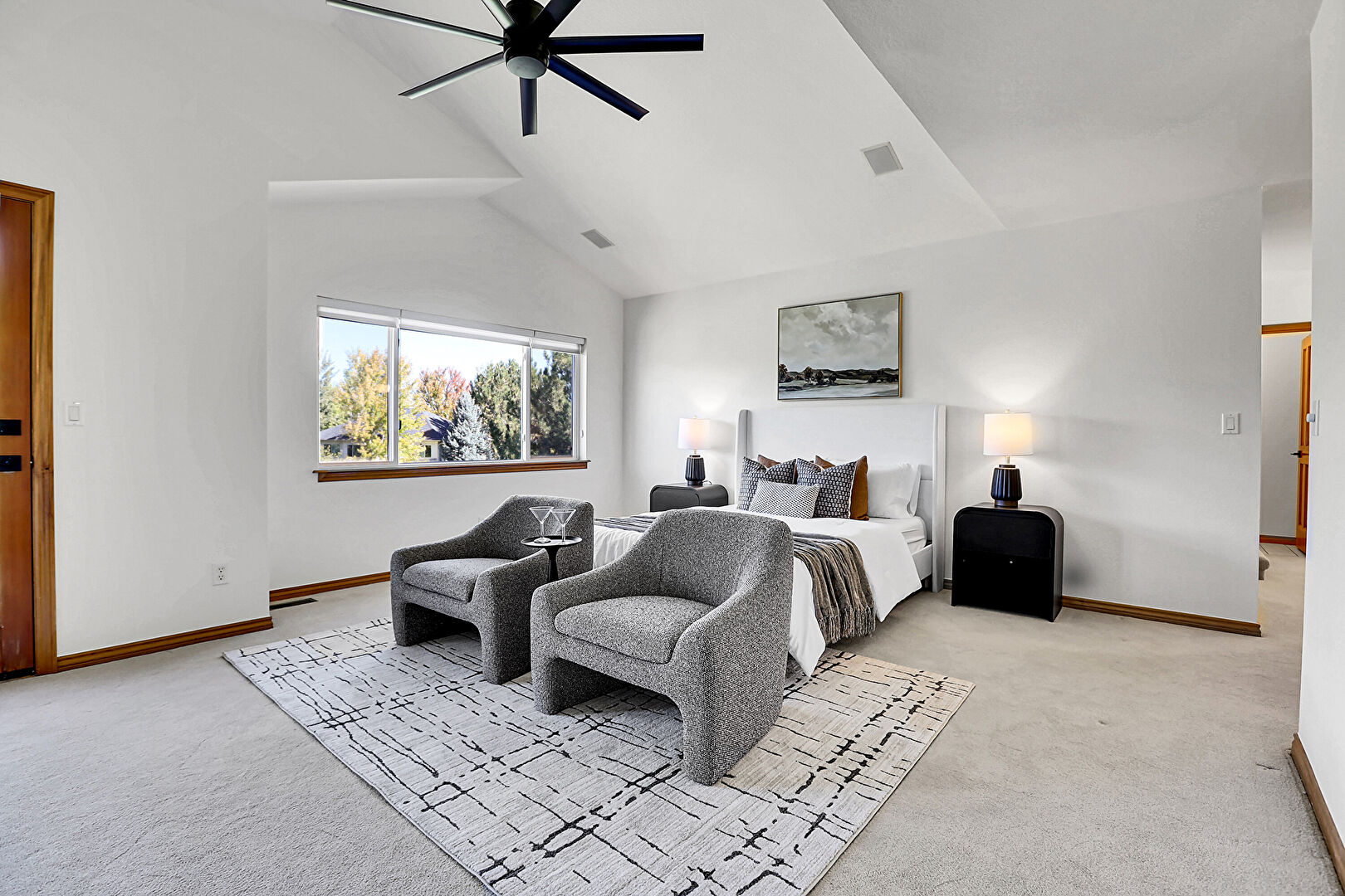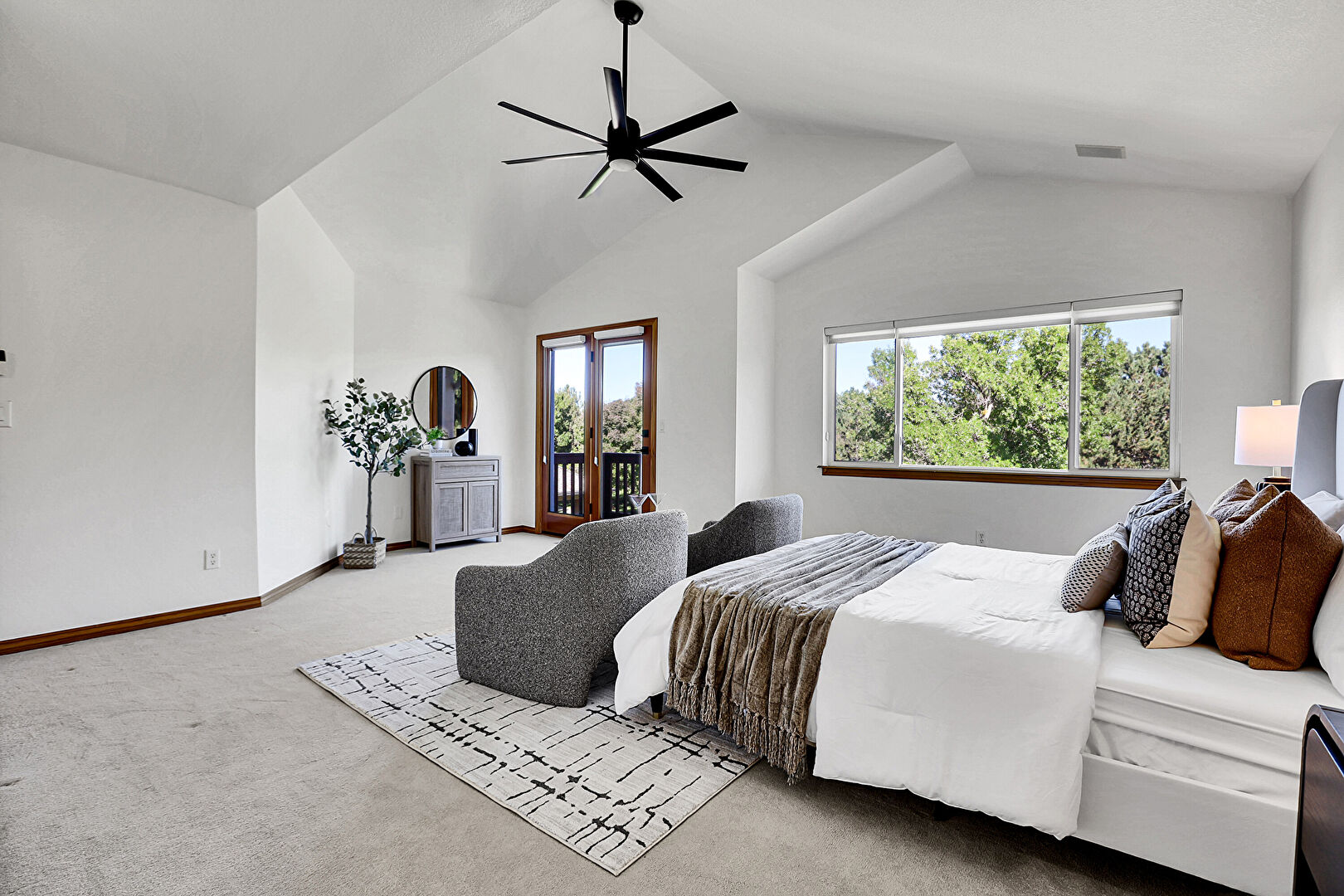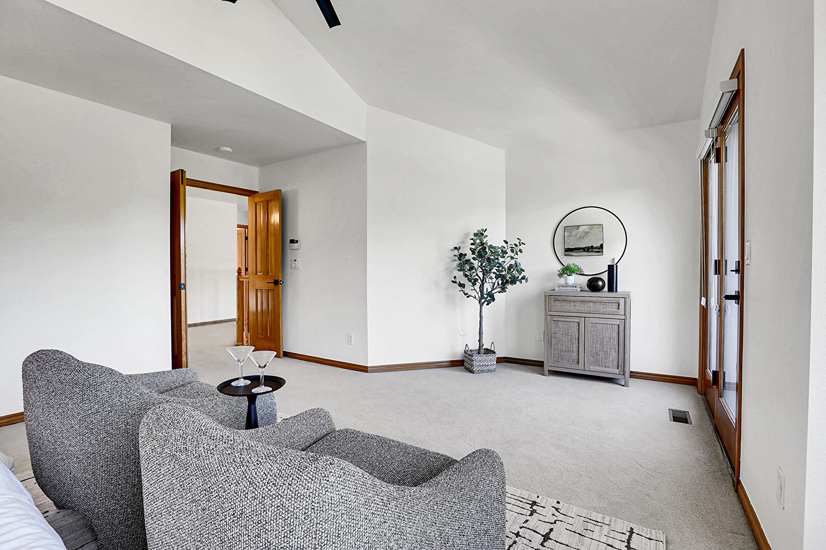 Access To Exterior, Baseboards Wall, Carpet, Cathedral Ceiling, Ceiling Fan, Drywall, High Ceiling, Natural Light, Vaulted Ceiling, Vent, Baseboards Wall, French Doors, Vaulted Ceiling, Vent