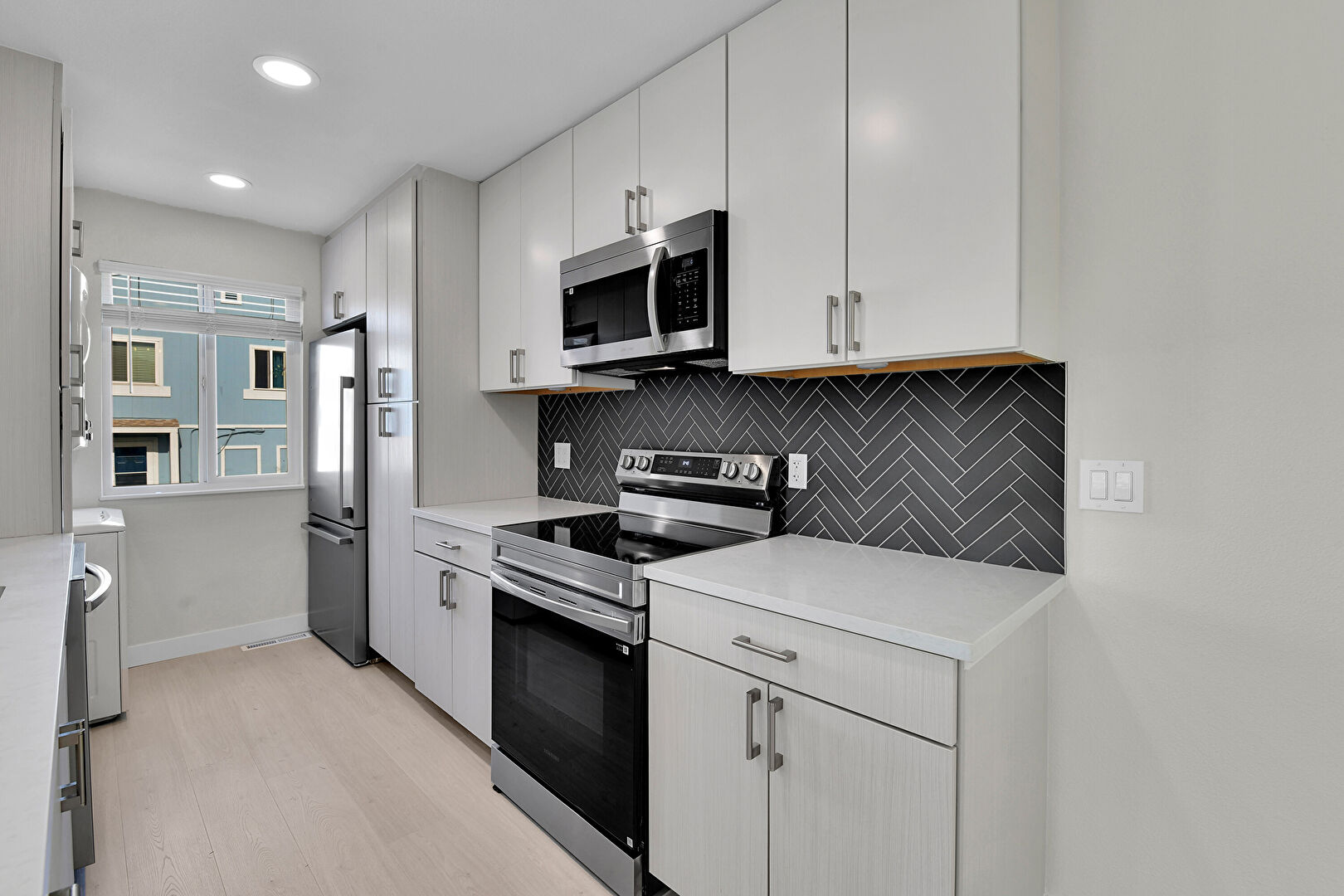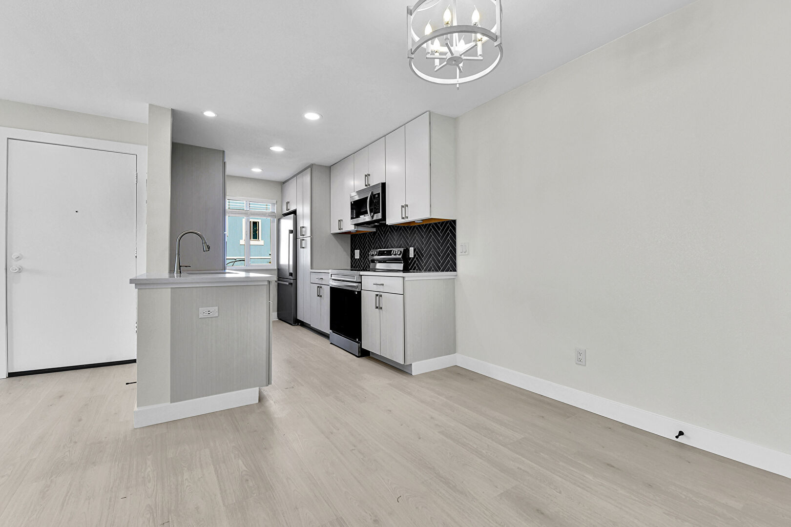 Baseboards Wall, Drywall, Flat Panel Cabinets, Galley Kitchen, Kitchen Peninsula, Natural Light, Notable Chandelier, One Wall Kitchen, Opens To Living Area, Pendant Lighting, Recessed Lighting, Vent, Wood Finish Floor, Baseboards Wall, Kitchen Island