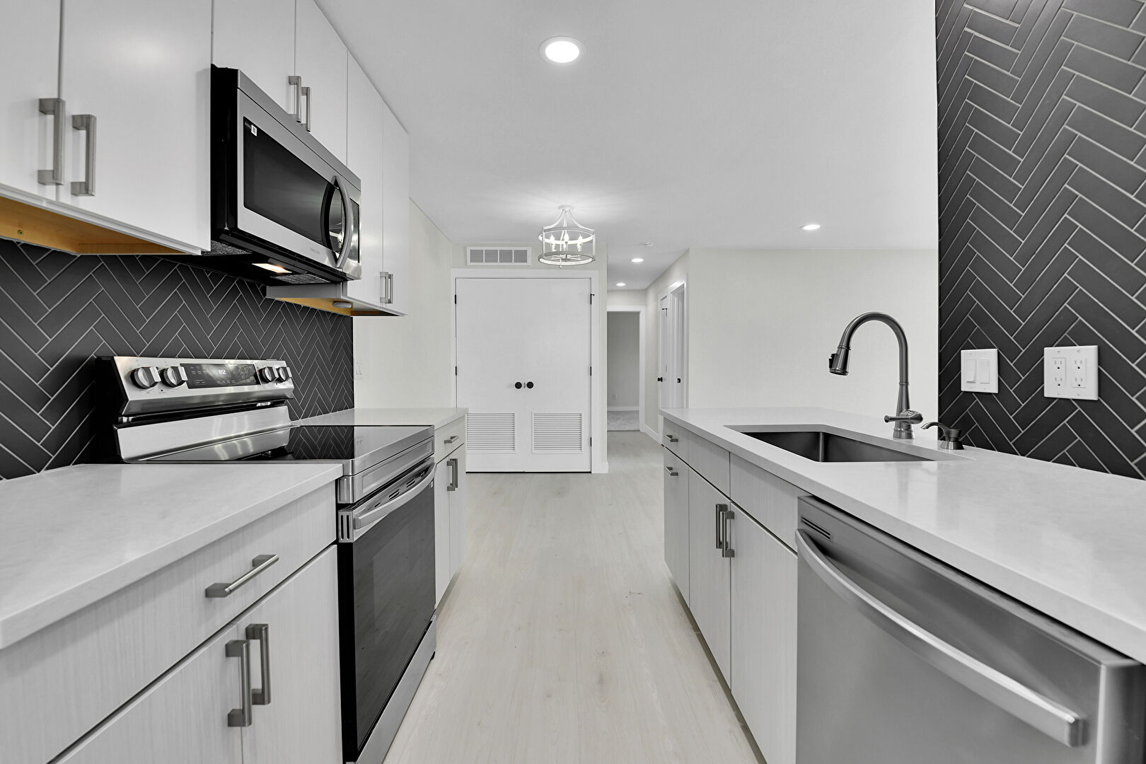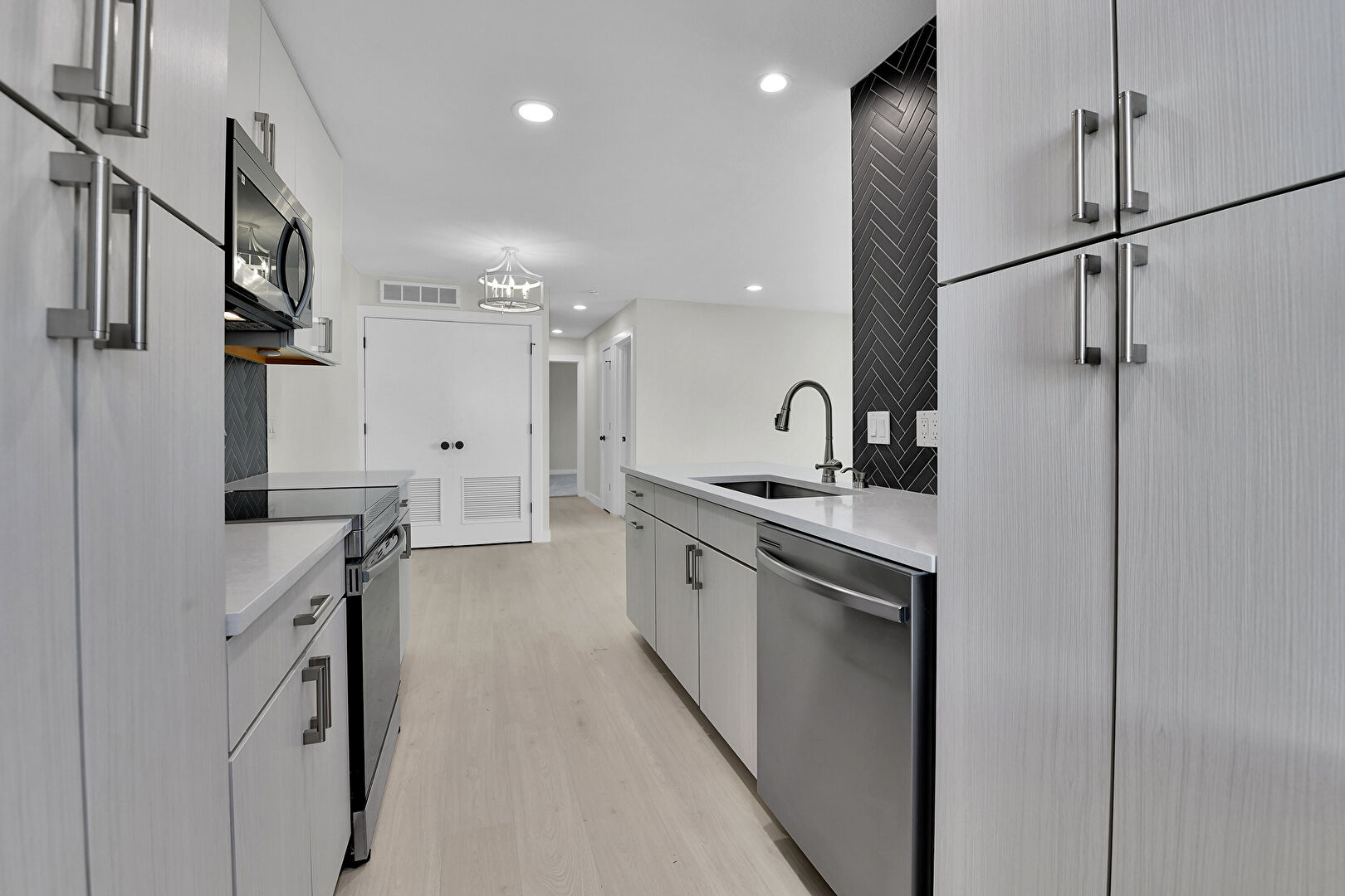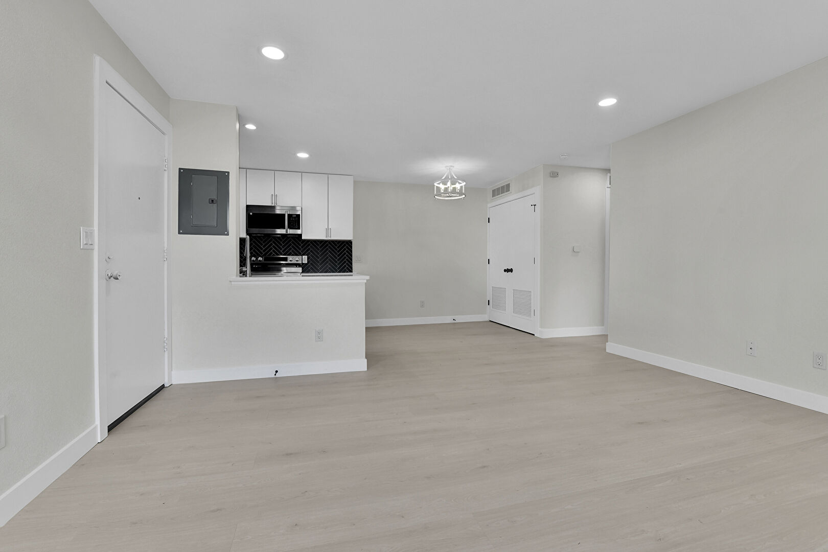 Baseboards Wall, Drywall, Galley Kitchen, Kitchen Peninsula, Natural Light, Notable Chandelier, Opens To Living Area, Recessed Lighting, Vent, Wood Finish Floor, Baseboards Wall, Electric Panel, Natural Light, Wood Finish Floor