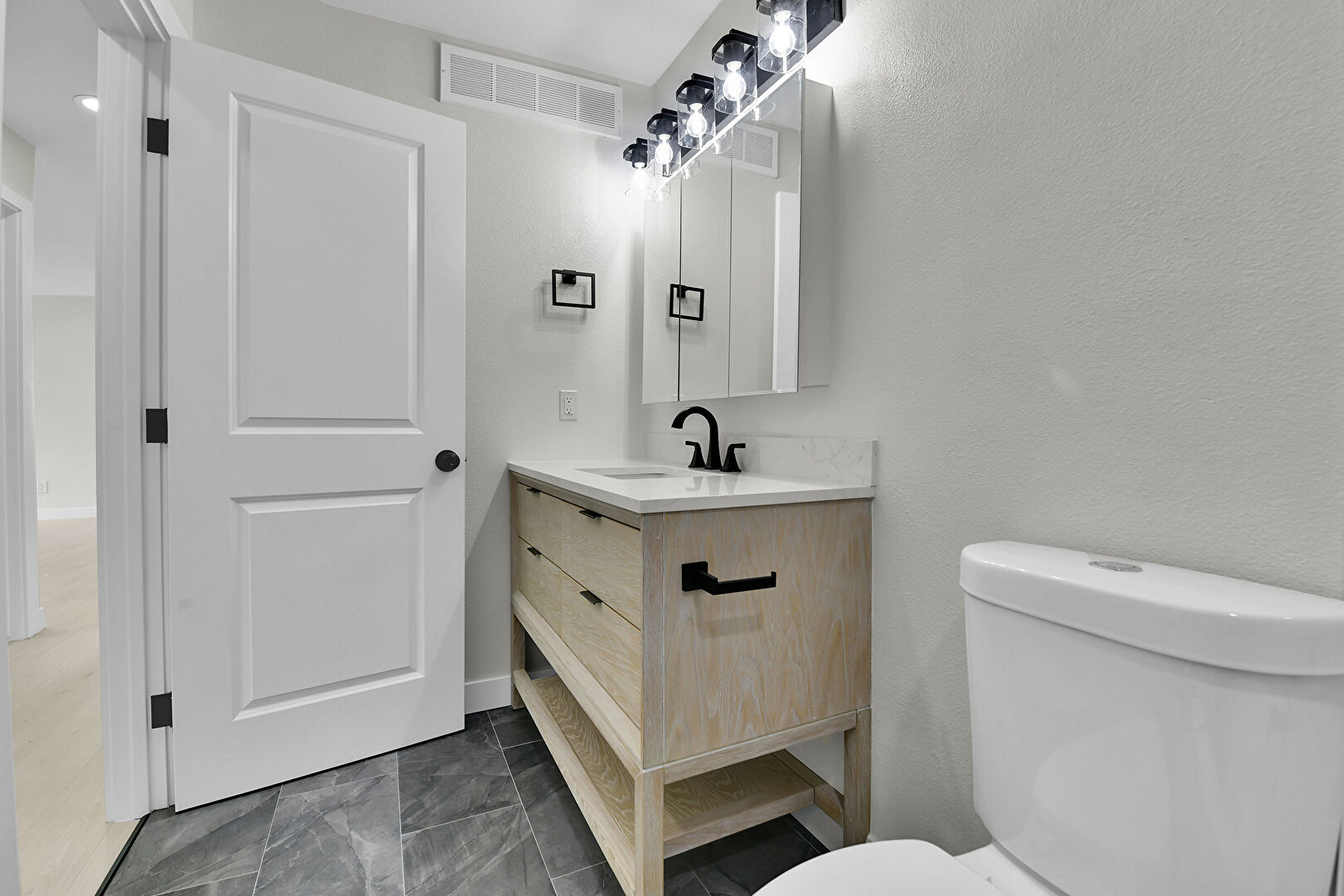 Baseboards Wall, Combined Bath Shower, Drywall, Full Bathroom, Half Bathroom, Textured Wall, Tile Floor, Vanity, Vent, Full Bathroom, Vanity