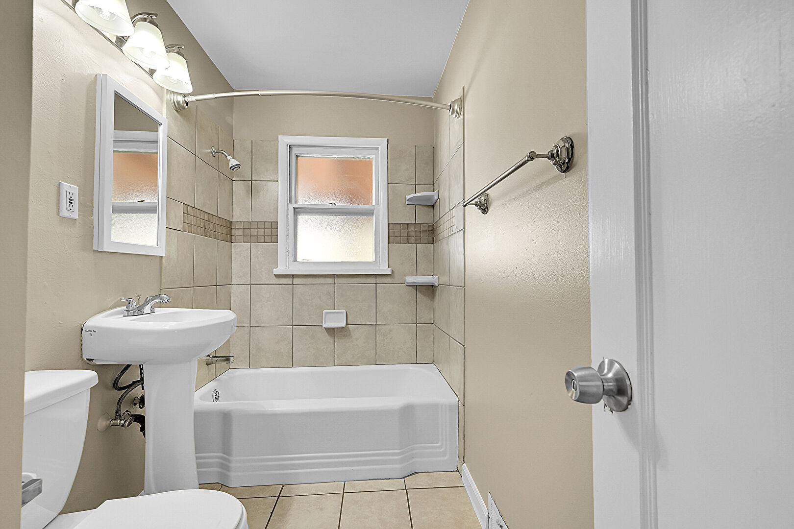 Baseboards Wall, Combined Bath Shower, Full Bathroom, Natural Light, Tile Floor, Drywall