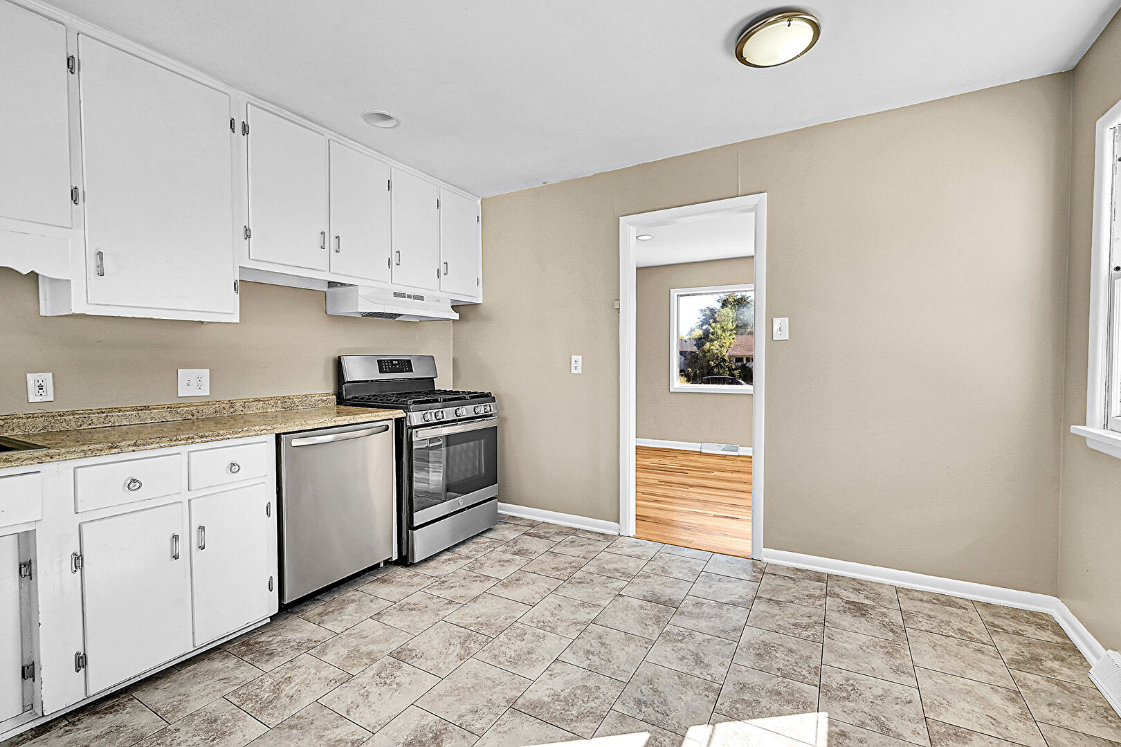 Baseboards Wall, Drywall, L Shaped Kitchen, Natural Light, Recessed Lighting, Stone Countertops, Tile Floor, Visible Hinge Cabinets, Baseboards Wall, Natural Light