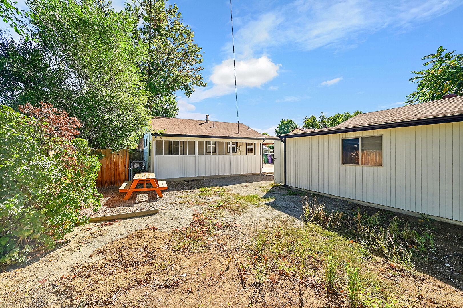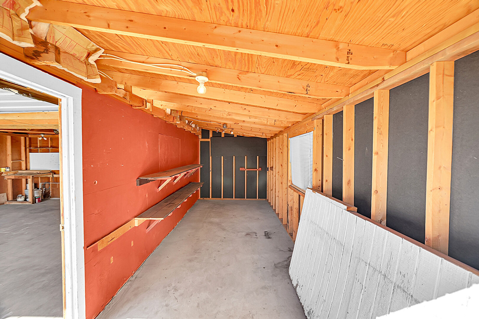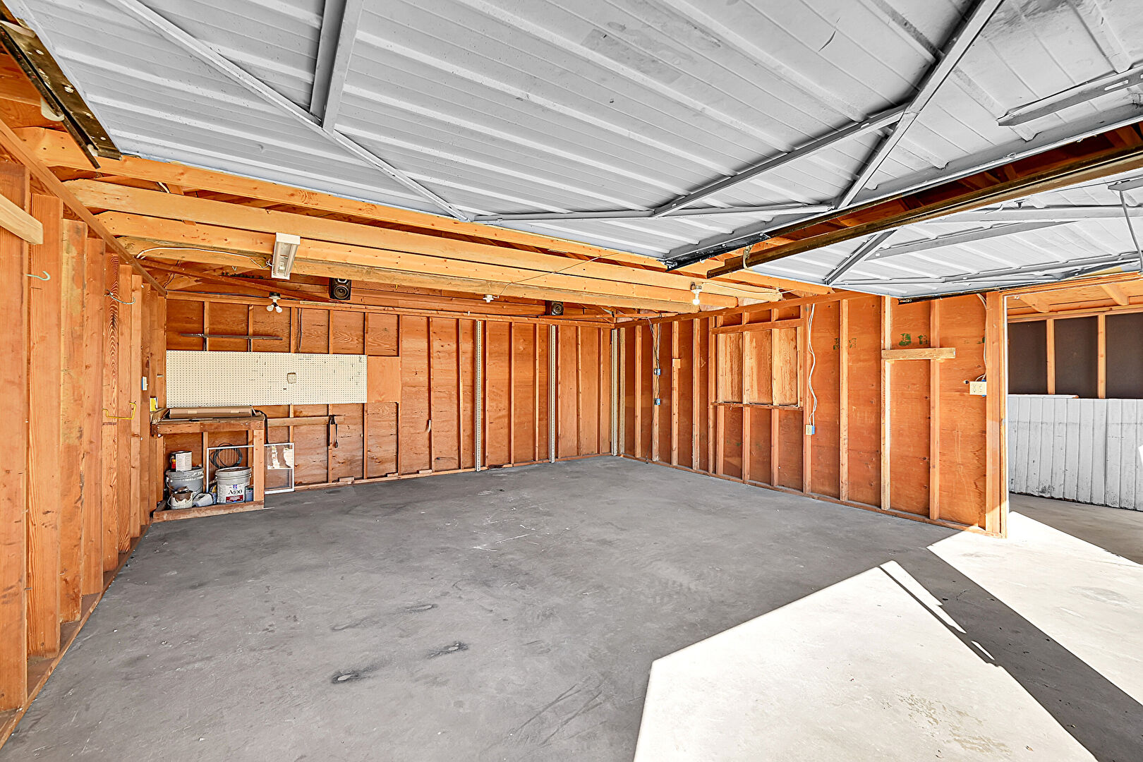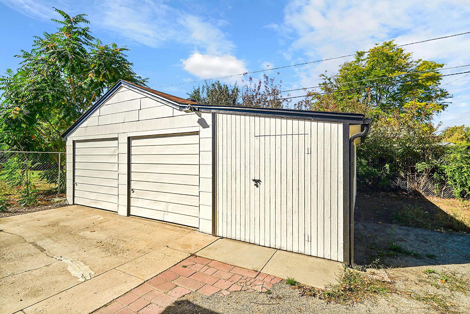Detached Garage, Driveway, Fence, Horizontal Siding, Outdoor Structure, Parking Pad, Residential View, Concrete Foundation, Driveway, Fence