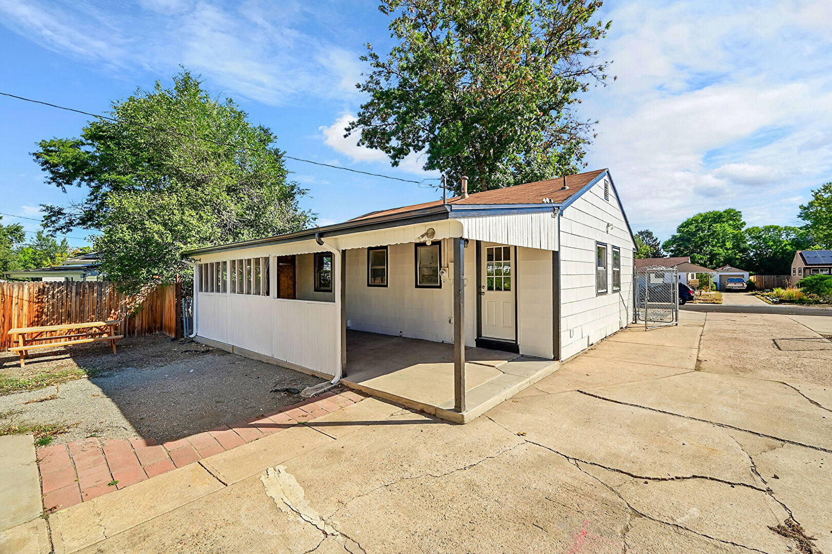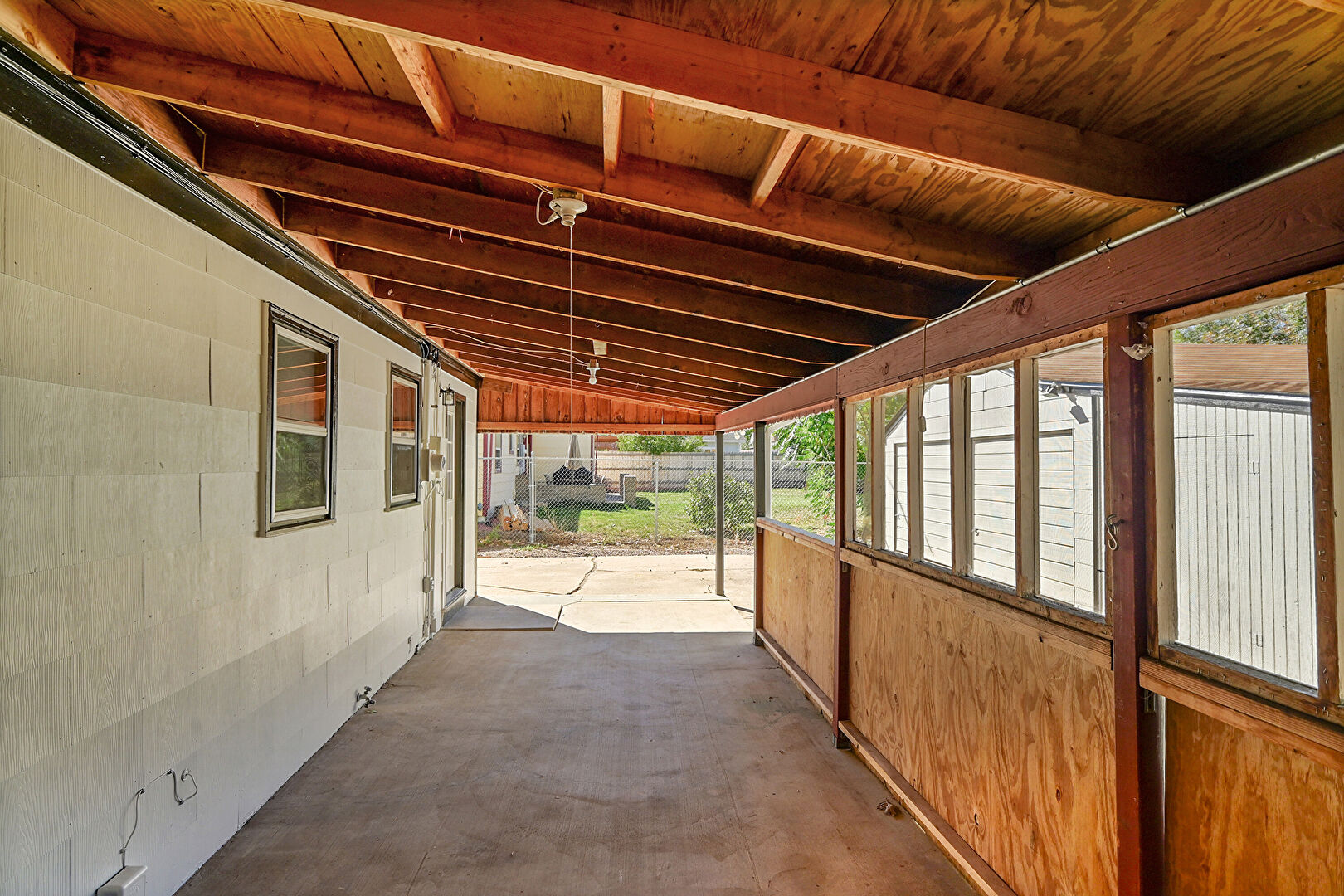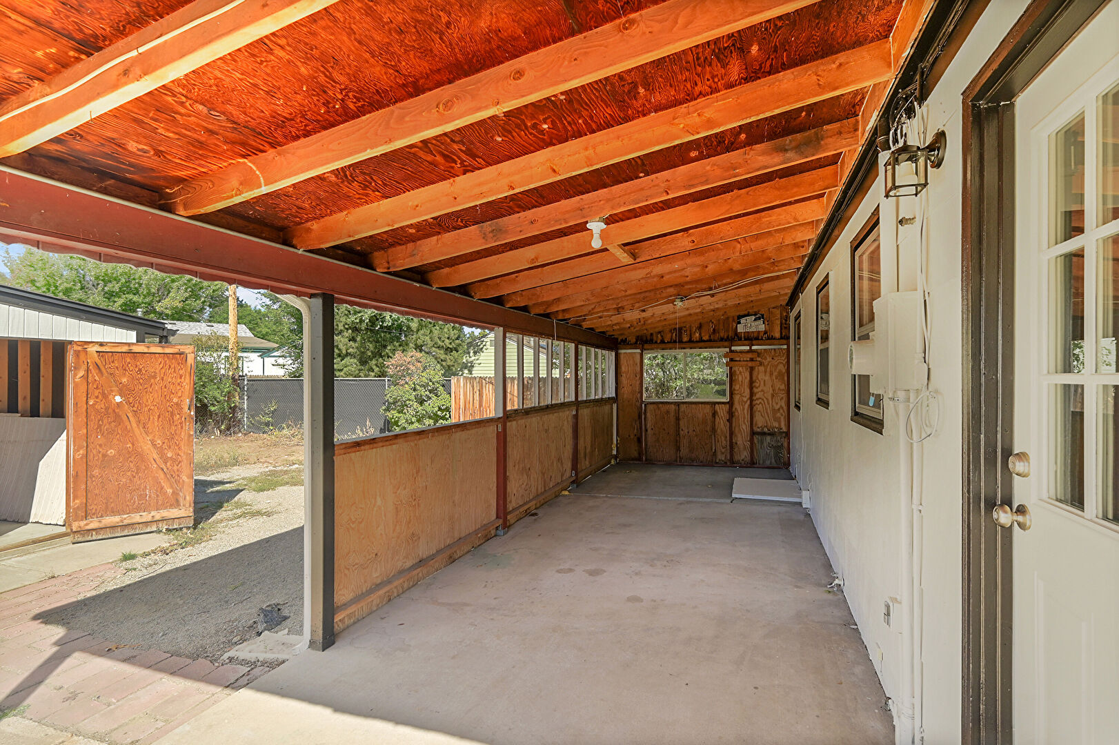 Concrete Block Siding, Concrete Foundation, Downspout, Fence, Gutters, Horizontal Siding, Parking Pad, Patio, Shingle Roof, Vertical Siding