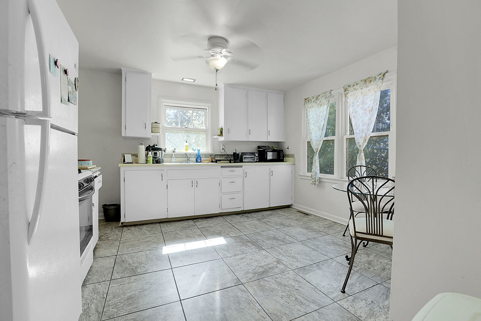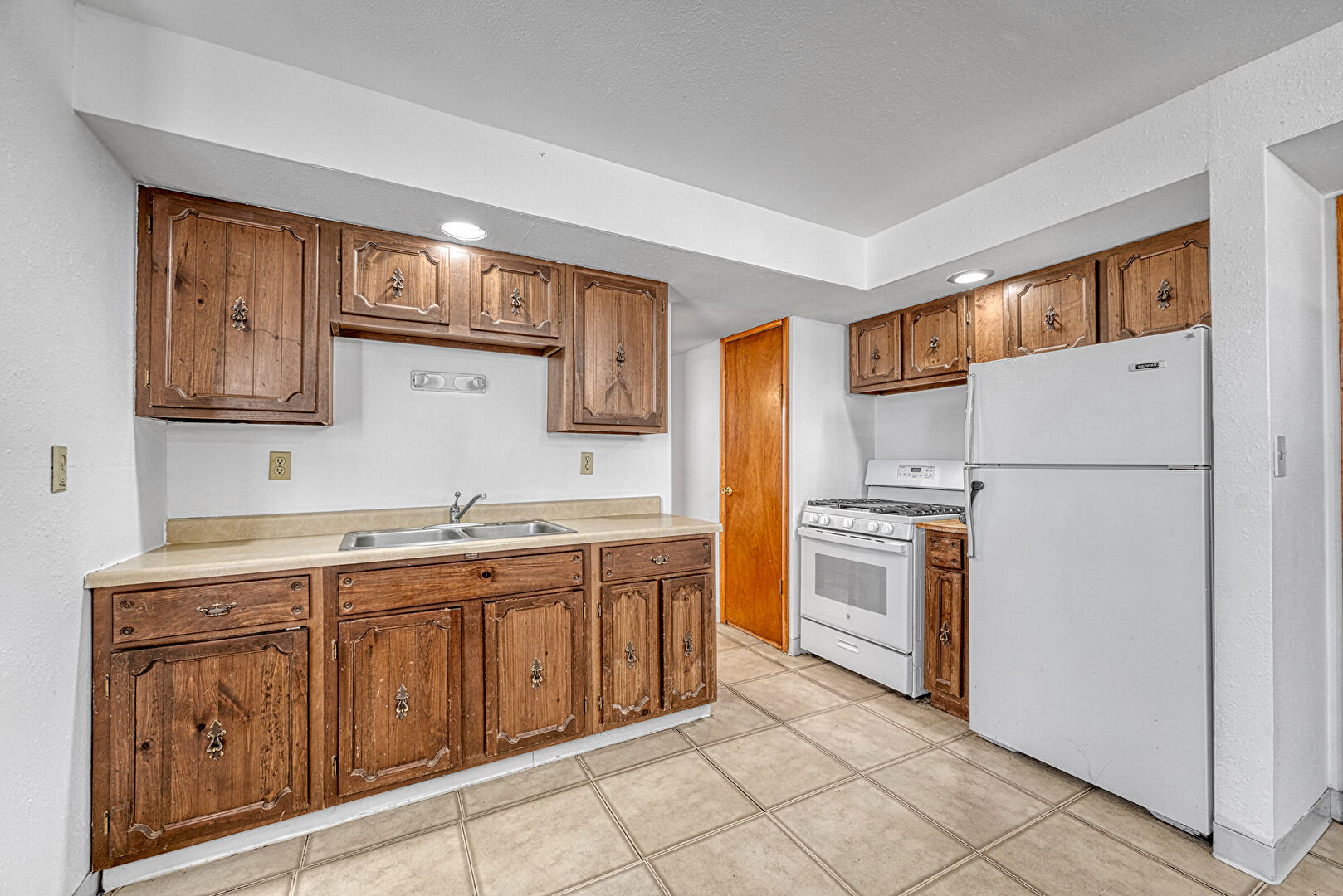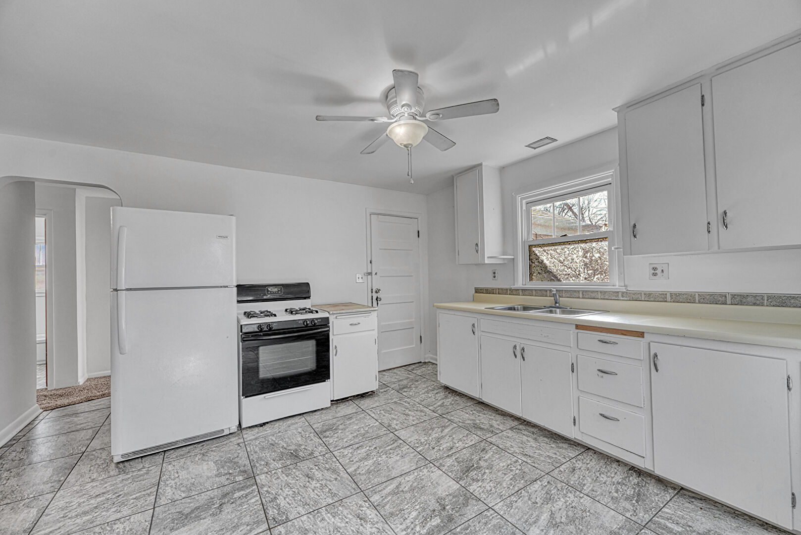Arched Cabinets, Arched Walkways, Baseboards Wall, Ceiling Fan, Drywall, Medium Brown Cabinets, Natural Light, Recessed Lighting, Tile Floor, Toaster, Vent, Visible Hinge Cabinets, Arched Cabinets, Drywall, Natural Light, Tile Floor, Visible Hinge Cabinets
