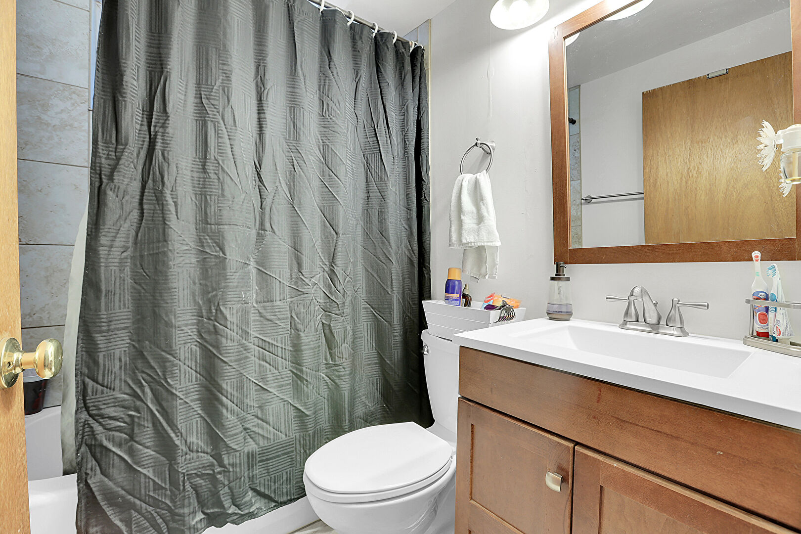 Combined Bath Shower, Drywall, Full Bathroom, Natural Light, Tile Floor, Tile Wall, Vanity, Wainscot Wall, Combined Bath Shower, Drywall