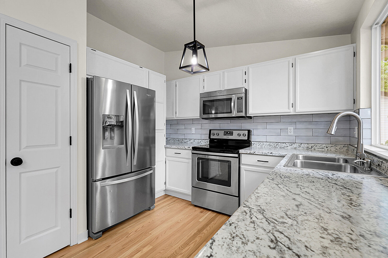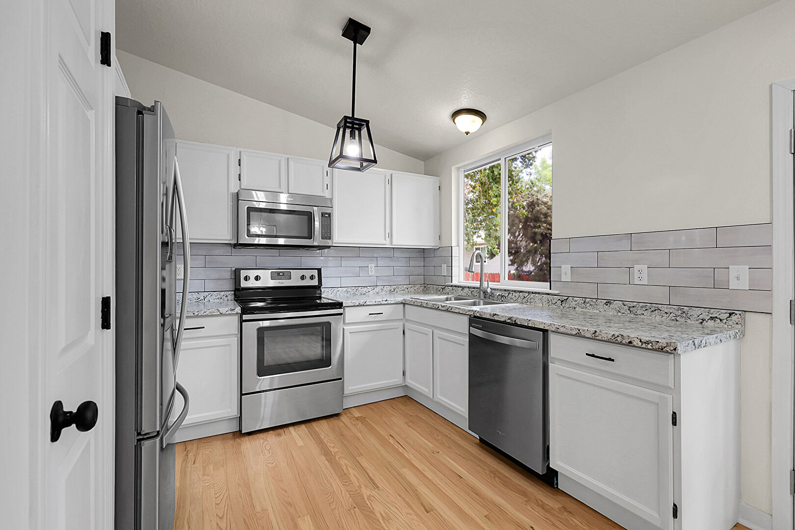 Baseboards Wall, Drywall, Natural Light, Opens To Living Area, Pendant Lighting, Recessed Lighting, Shaker Cabinets, Stone Countertops, U Shaped Kitchen, Vaulted Ceiling, Visible Hinge Cabinets, Wood Finish Floor, Shaker Cabinets, Stone Countertops, Vaulted Ceiling