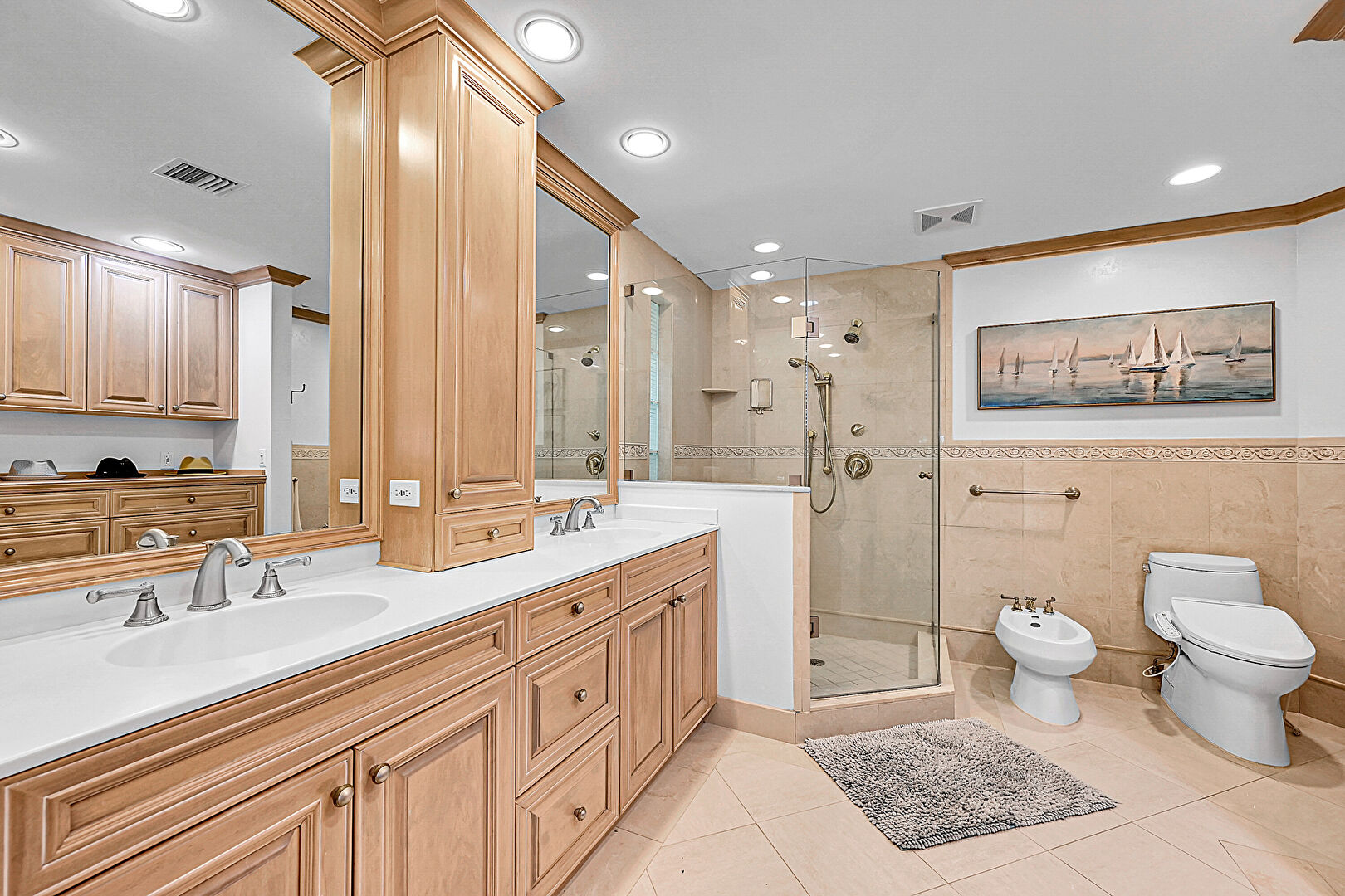 Crown Molding, Double Vanity, Drywall, Ensuite Bathroom, Full Bathroom, Natural Light, Recessed Lighting, Tile Floor, Tile Wall, Vent, Bidet, Vent