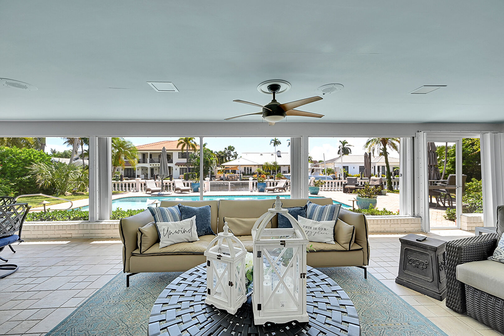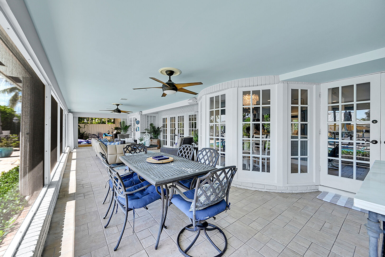 Ceiling Fan, French Doors, Outdoor Dining Area, Outdoor Living Space, Patio, Sunroom, Tile Floor, Natural Light