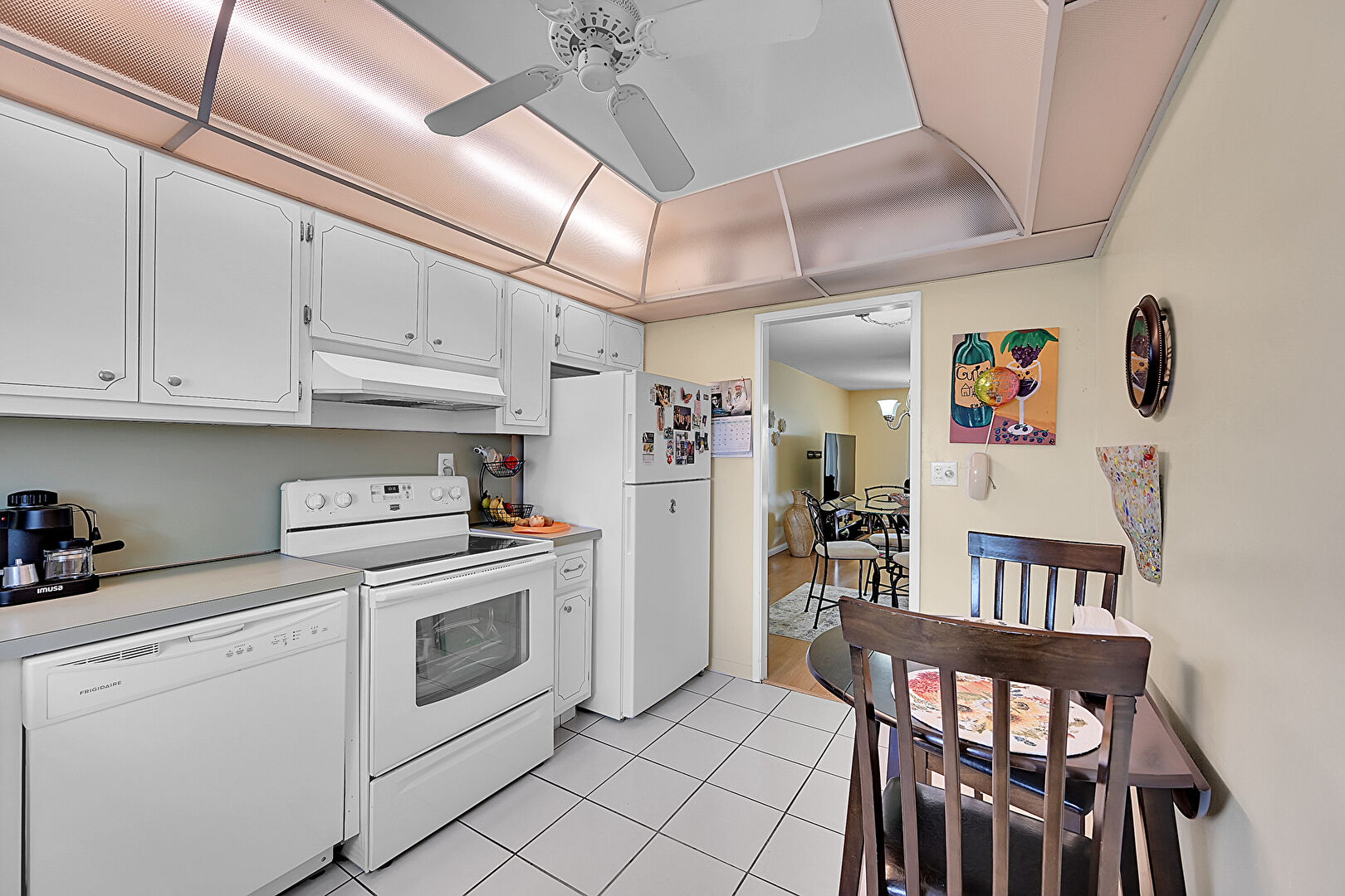 Arched Cabinets, Ceiling Fan, Drywall, Natural Light, Open Shelves, Tile Floor, Toaster, Vaulted Ceiling, Visible Hinge Cabinets, Arched Cabinets, Tile Floor