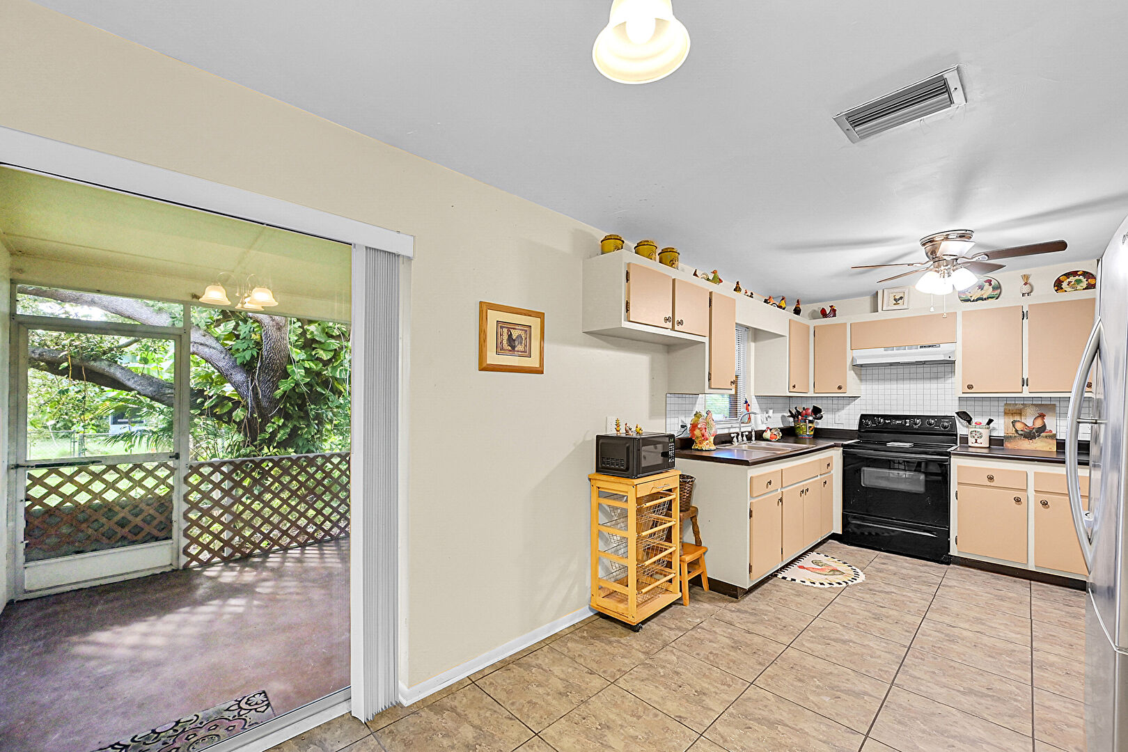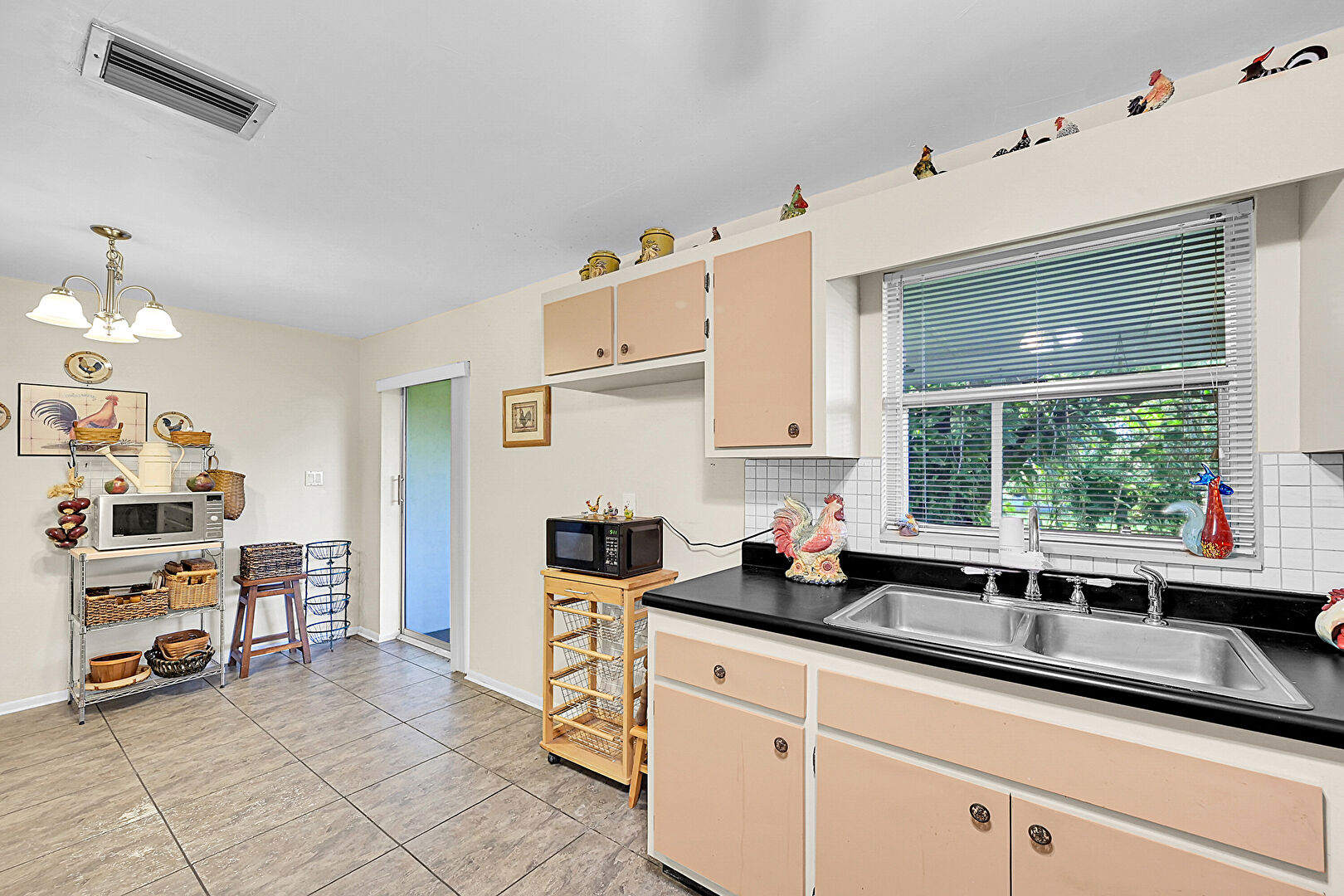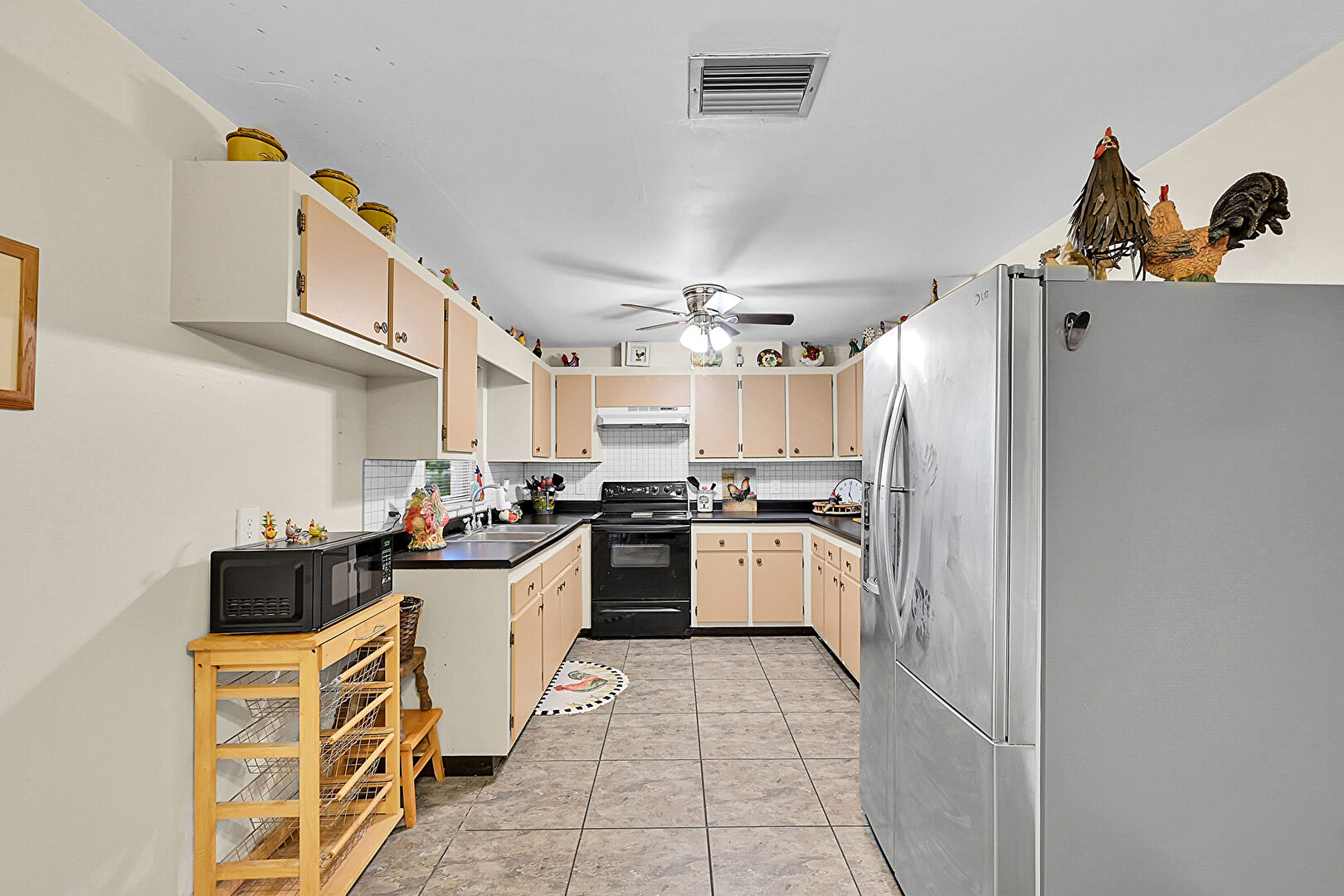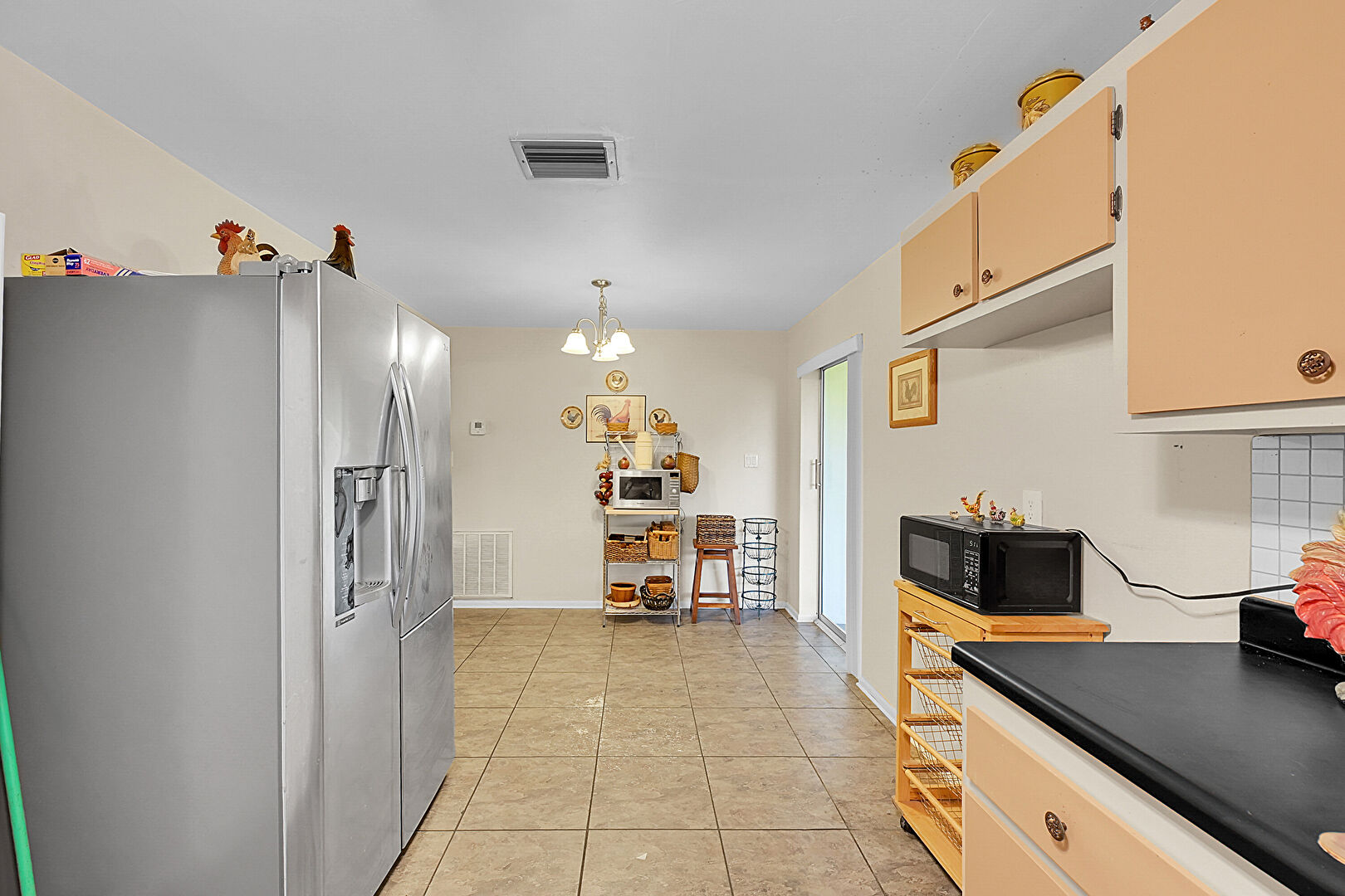 Baseboards Wall, Ceiling Fan, Cream Cabinets, Drywall, Natural Light, Notable Chandelier, Pendant Lighting, Tile Floor, U Shaped Kitchen, Vent, Visible Hinge Cabinets, Cream Cabinets, Drywall, Tile Floor, Vent