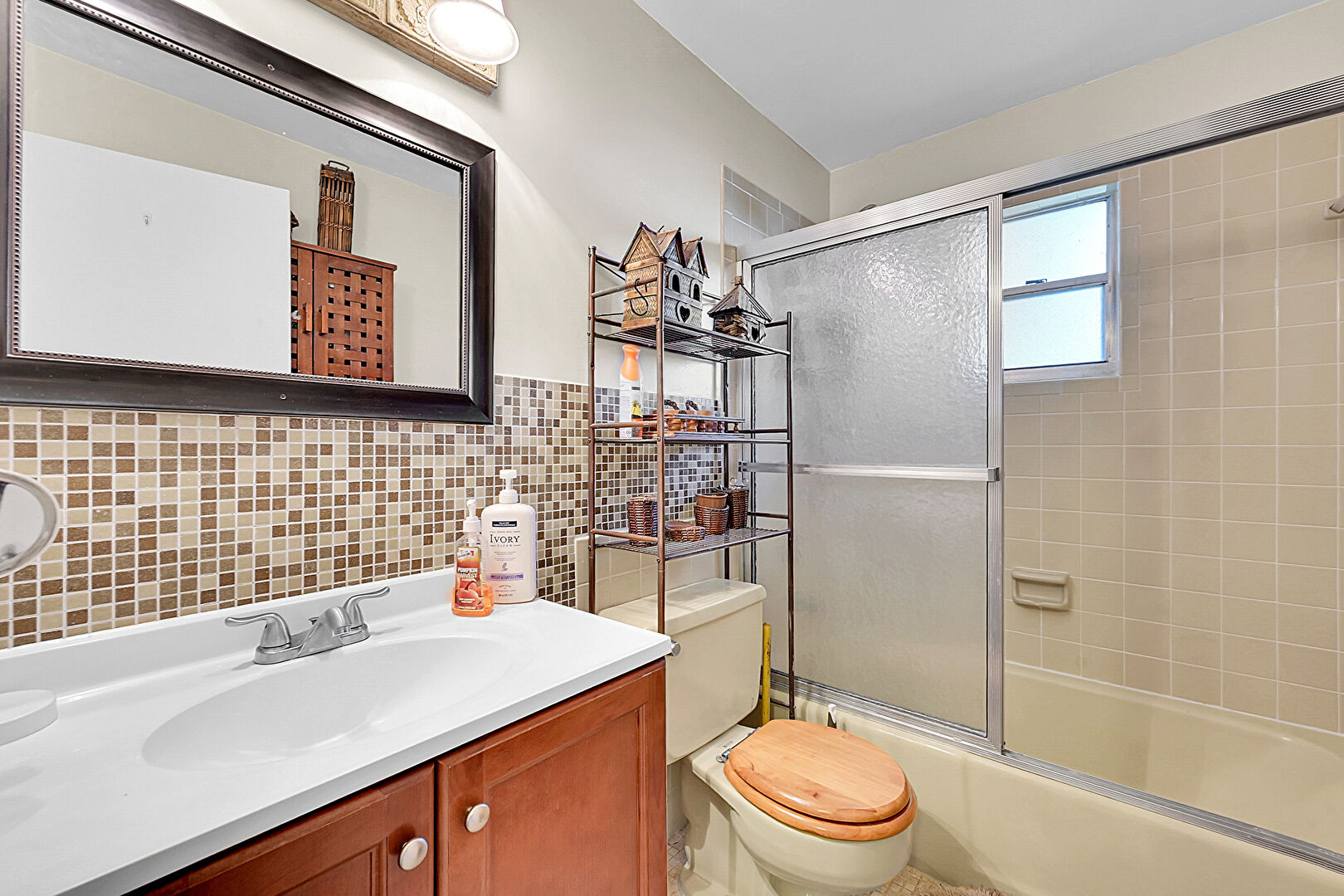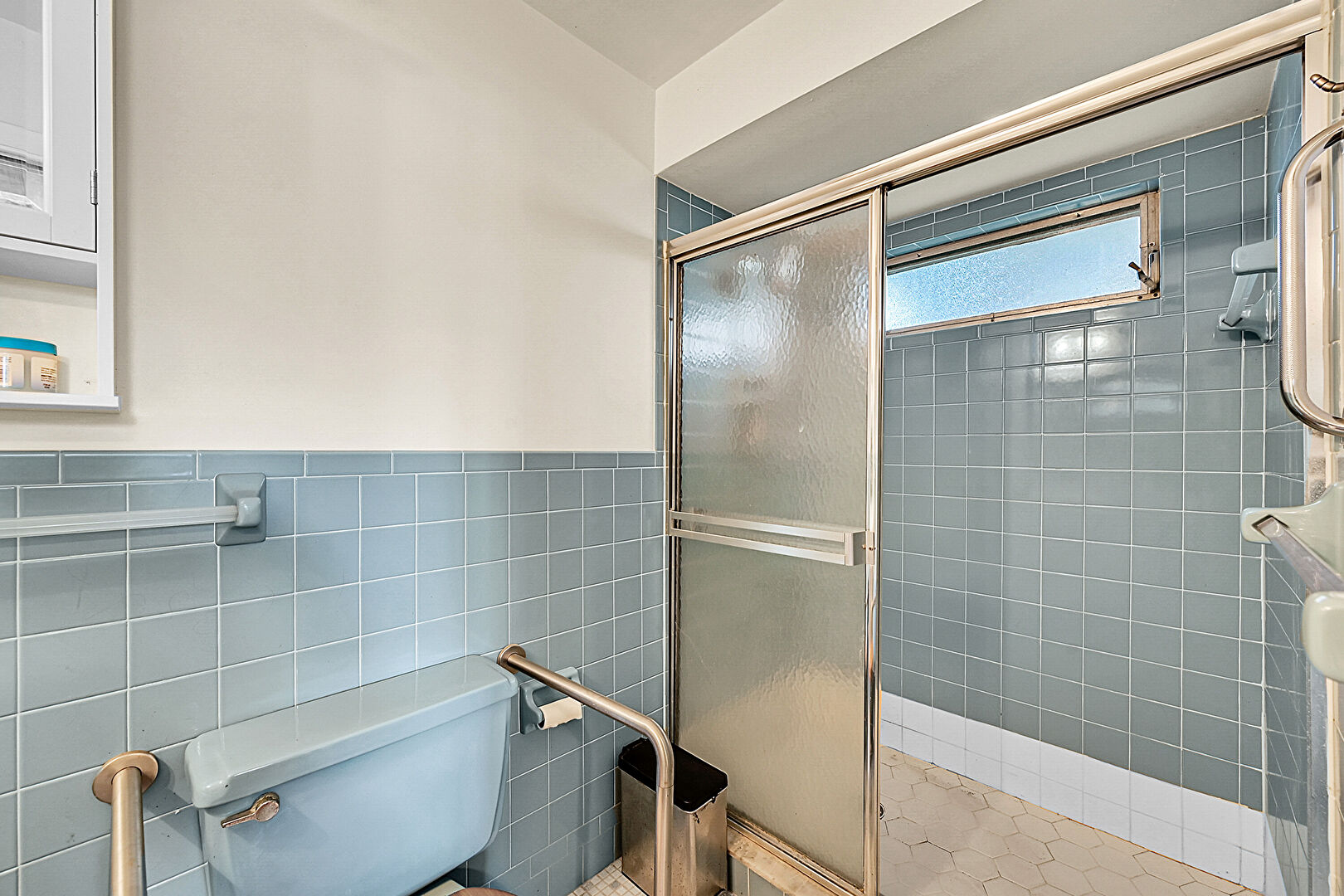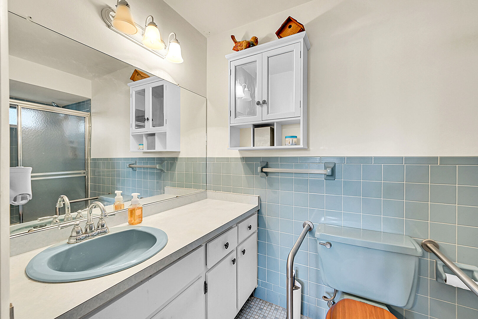 Combined Bath Shower, Drywall, Full Bathroom, Natural Light, Tile Floor, Tile Wall, Vanity, Vent, Wainscot Wall, Full Bathroom, Natural Light