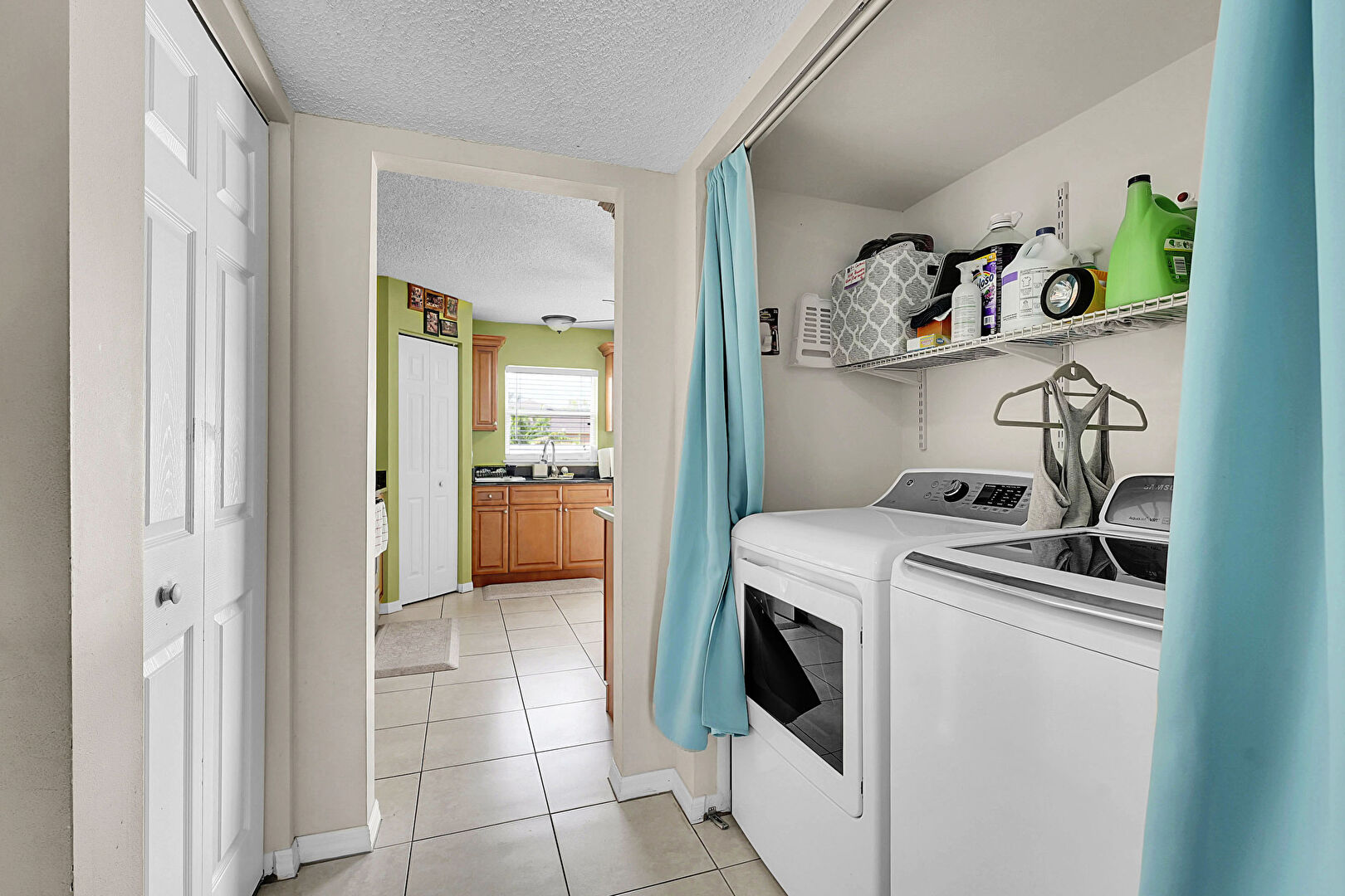 Drywall, Laundry, Natural Light, Textured Ceiling, Tile Floor, Baseboards Wall