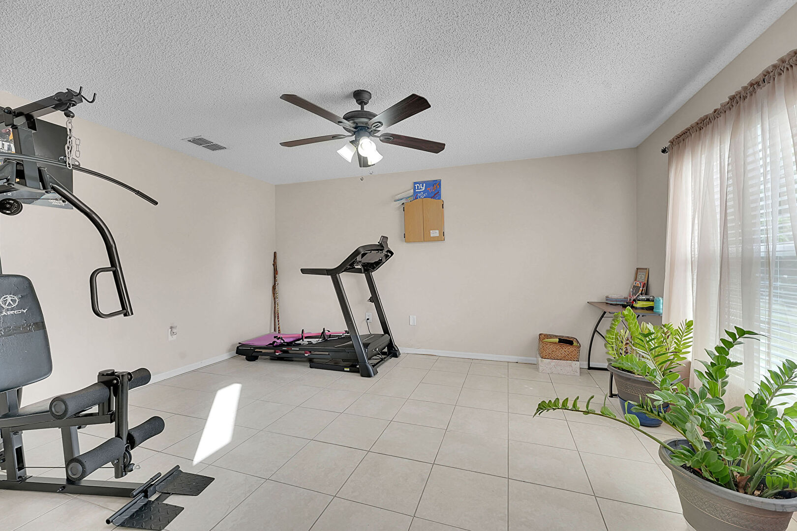 Baseboards Wall, Ceiling Fan, Drywall, Natural Light, Textured Ceiling, Tile Floor, Vent, Textured Ceiling, Tile Floor
