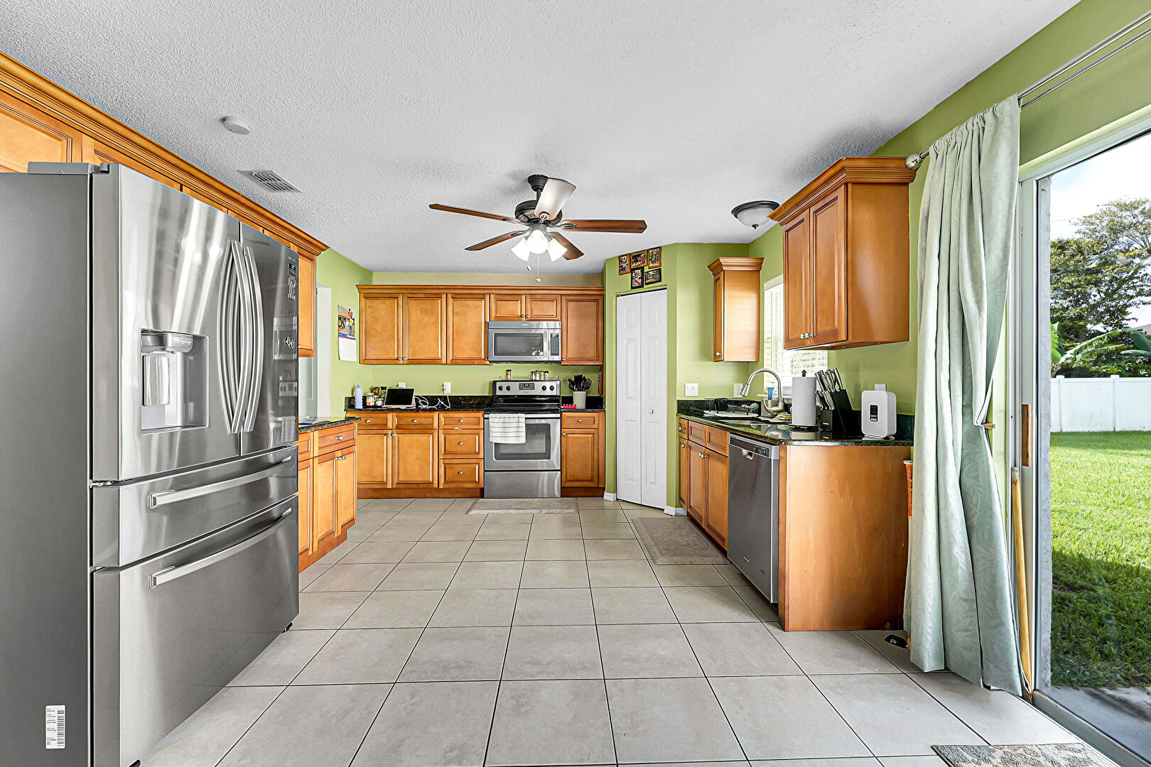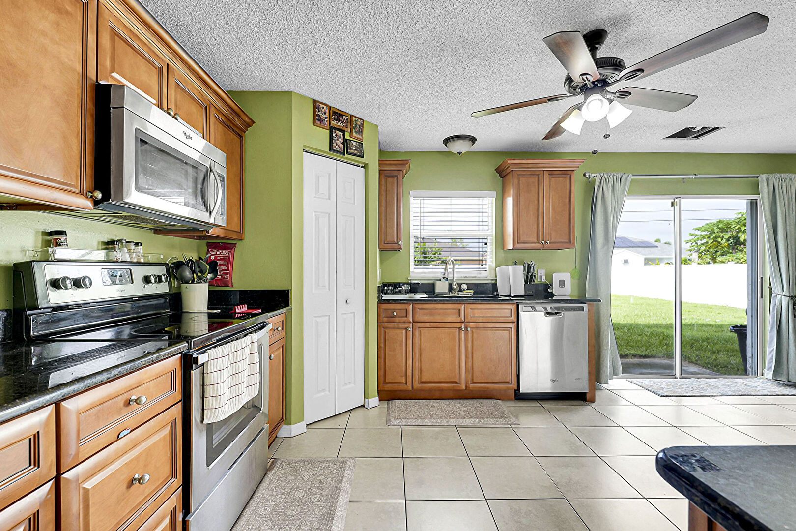 Baseboards Wall, Ceiling Fan, Drywall, L Shaped Kitchen, Natural Light, Textured Ceiling, Tile Floor, Vent, Drywall, Textured Ceiling