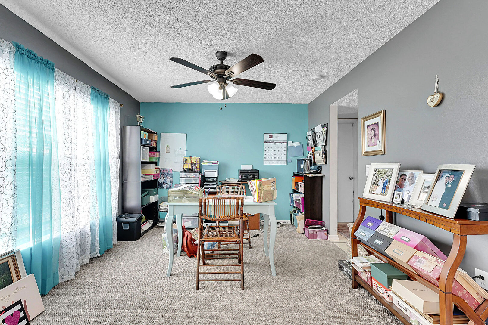 Baseboards Wall, Carpet, Ceiling Fan, Drywall, Natural Light, Office Area, Textured Ceiling