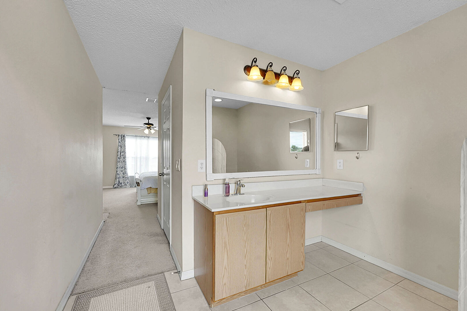 Baseboards Wall, Ceiling Fan, Drywall, Ensuite Bathroom, Full Bathroom, Natural Light, Recessed Lighting, Textured Ceiling, Tile Floor, Vanity, Vent, Drywall, Natural Light, Tile Floor