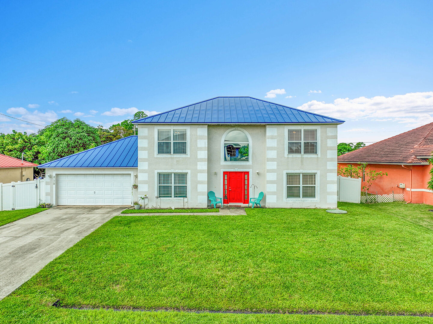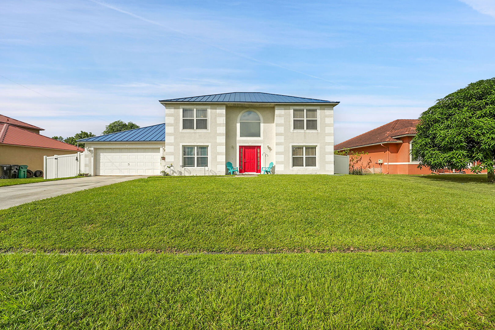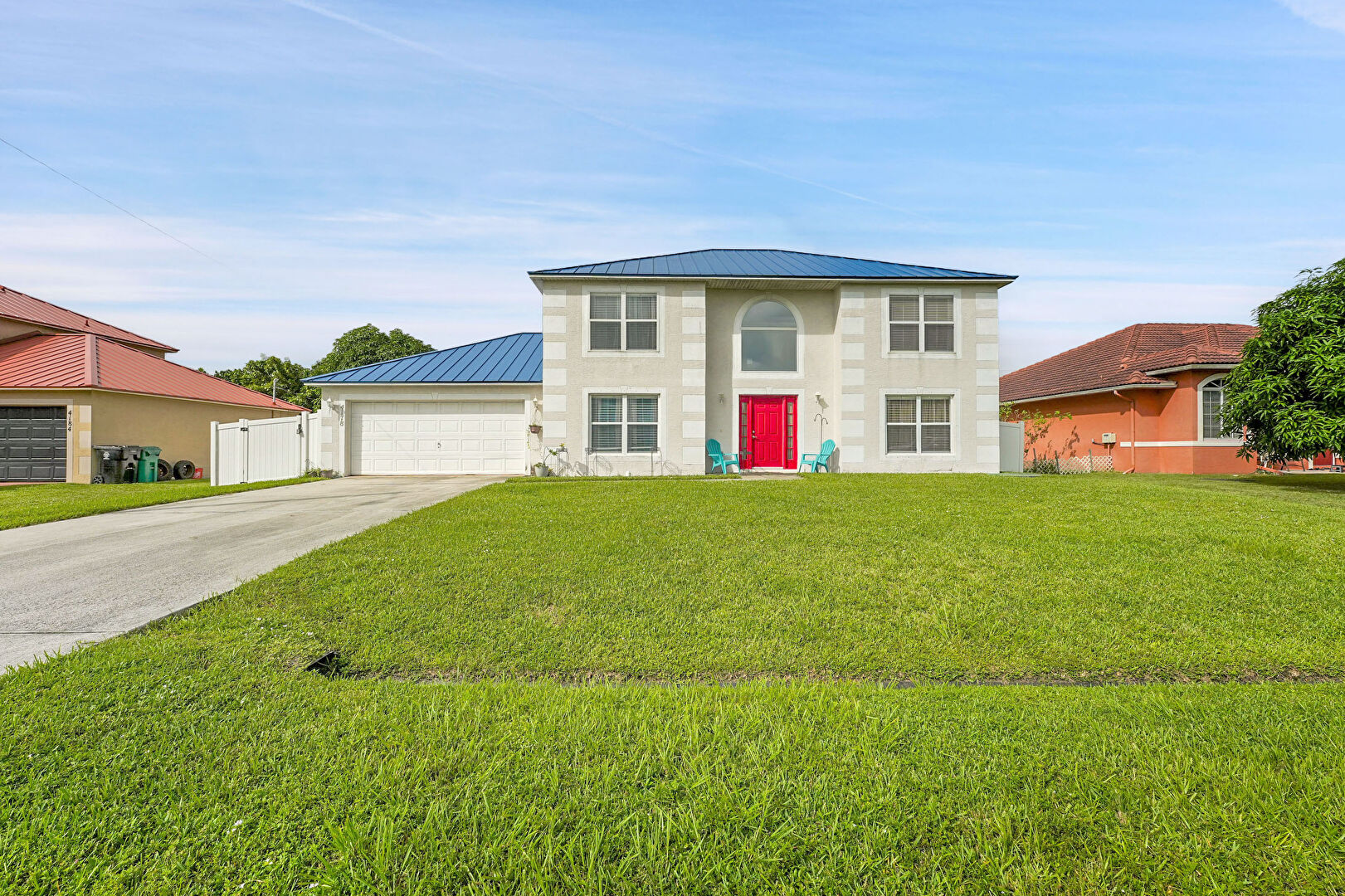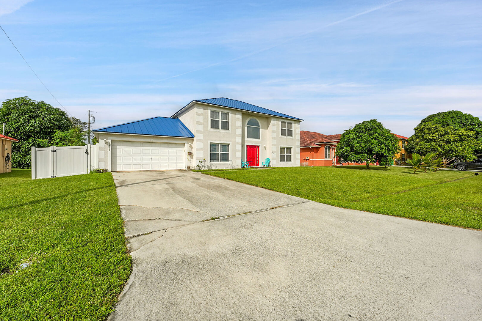 Driveway, Fence, Garage, Gate, Lawn, Metal Roof, Standing Seam Roof, Stucco Siding, Driveway, Metal Roof, Standing Seam Roof, Stucco Siding